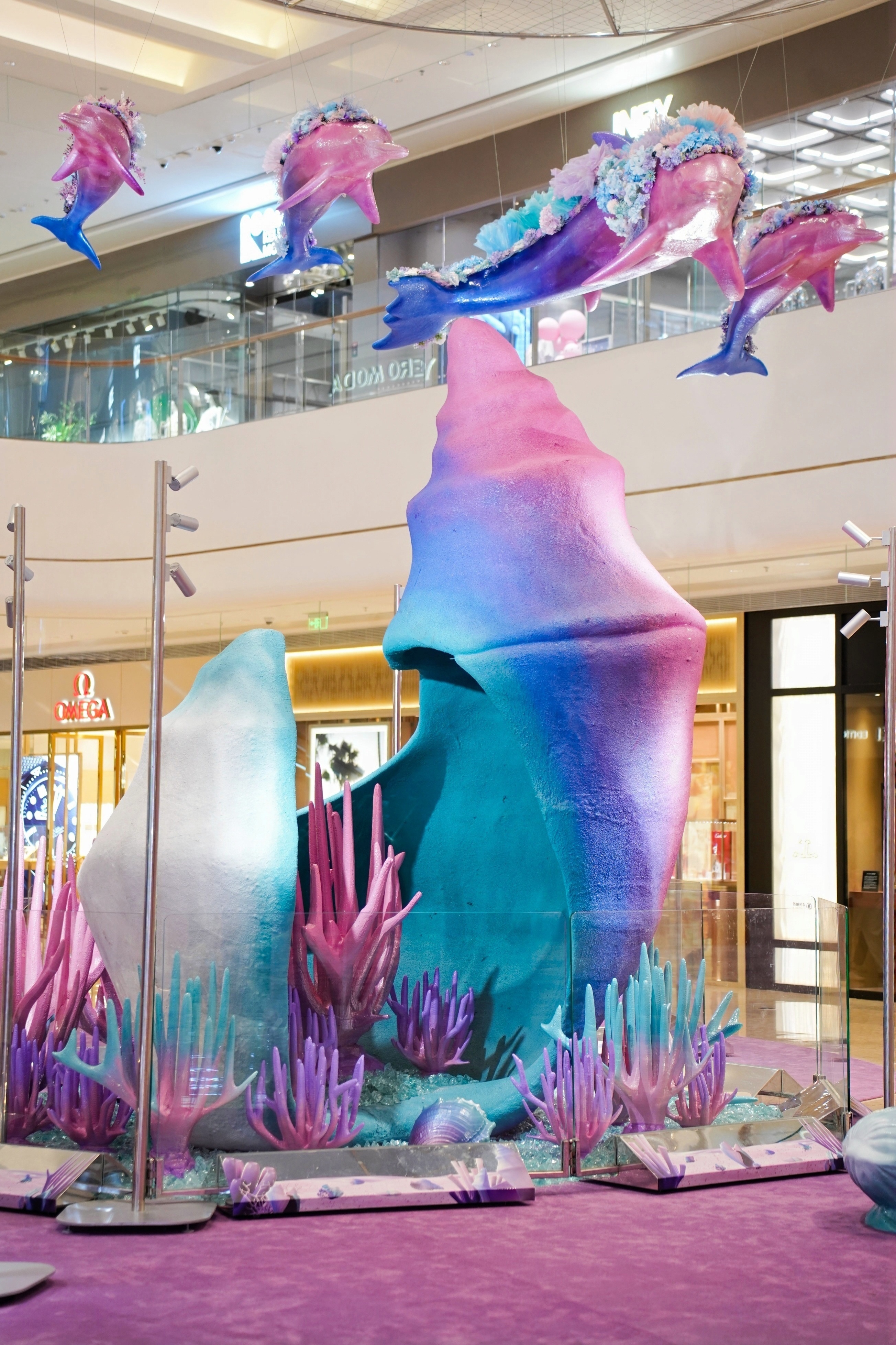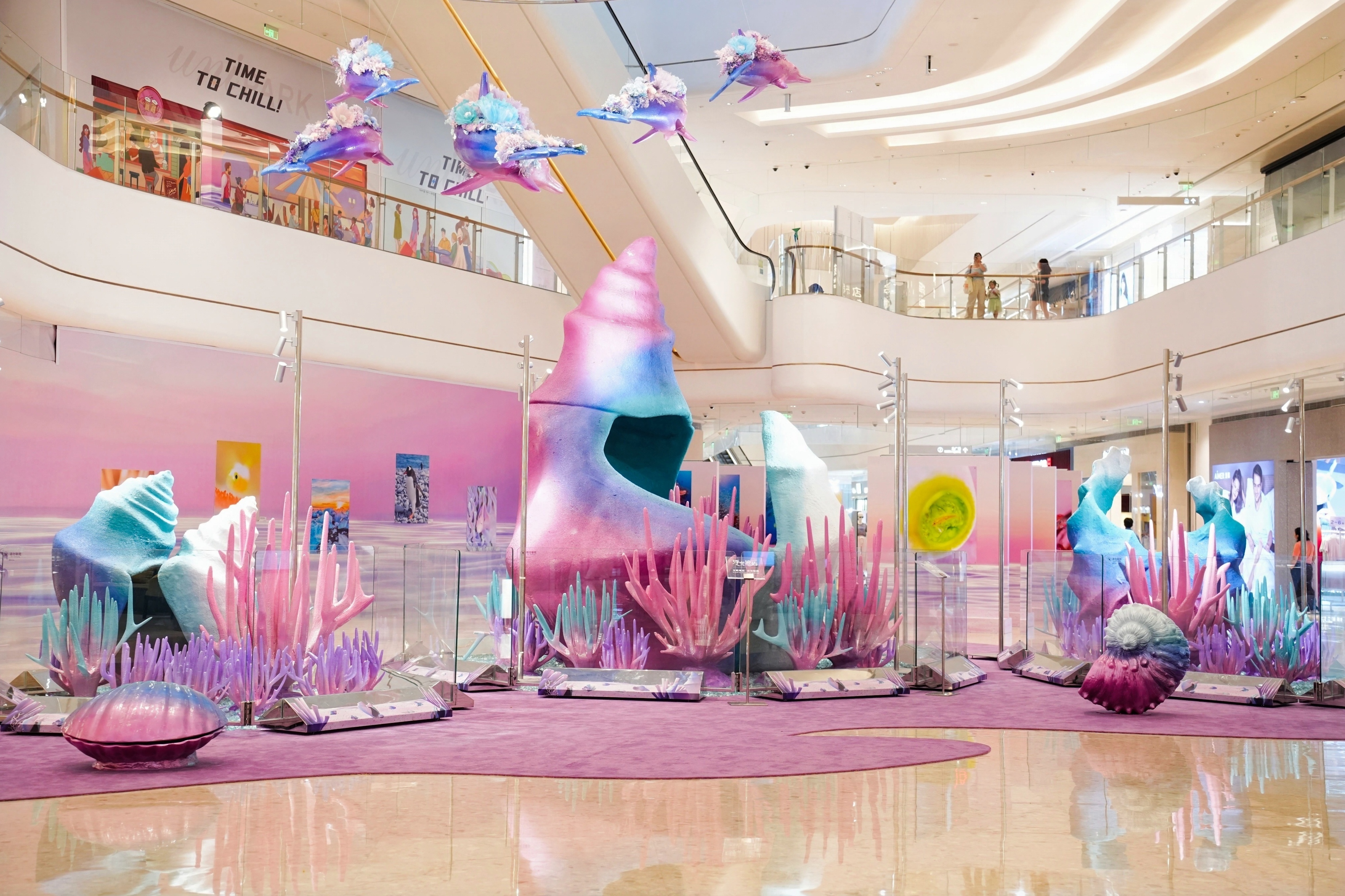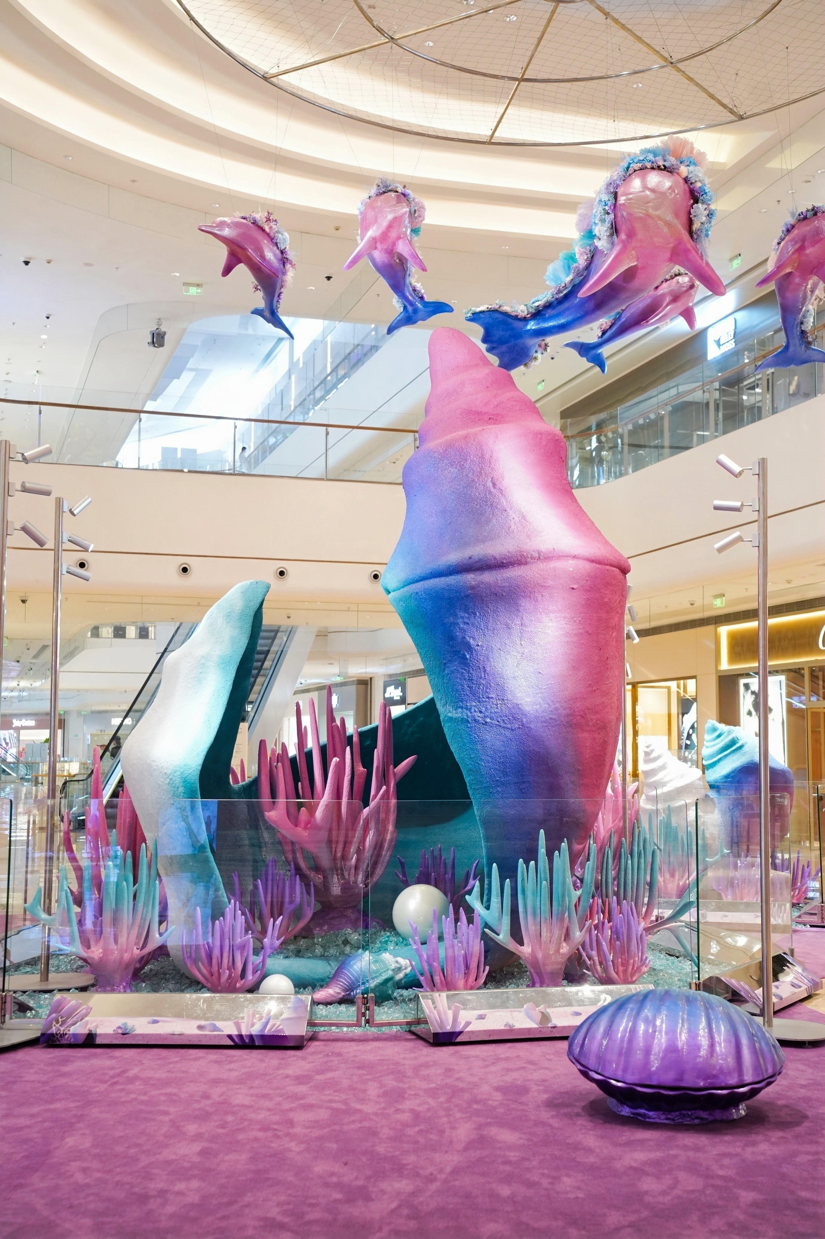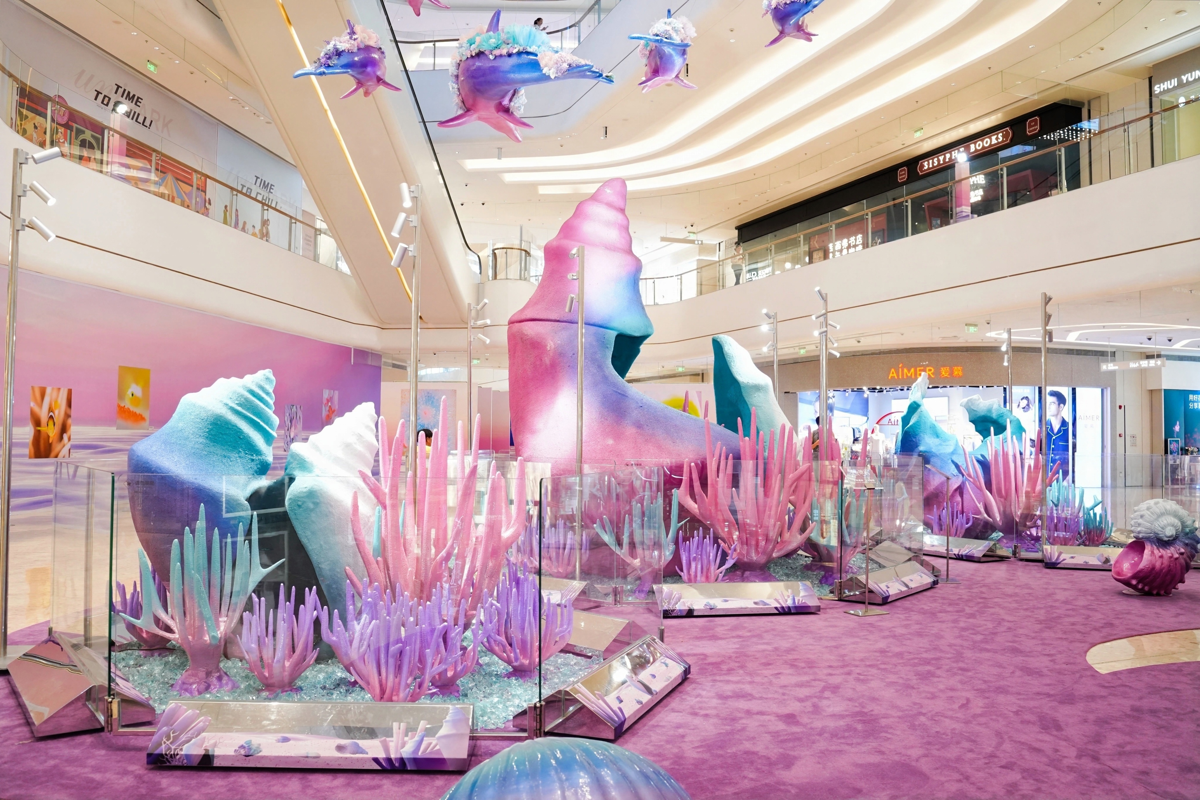 The project draws inspiration from the play of light and shadow in the depths of the ocean, the rhythmic motion of tides, and the morphological characteristics of marine creatures. The installation of giant conches and suspended dolphins serves as the visual focus, enhancing the immersive experience and making a lasting impression. Blue and purple as the main colors, complemented by an ingenious blend of lighting design, projection technology, and transparent or reflective materials, recreate the atmosphere of the tranquil deep-ocean environment.