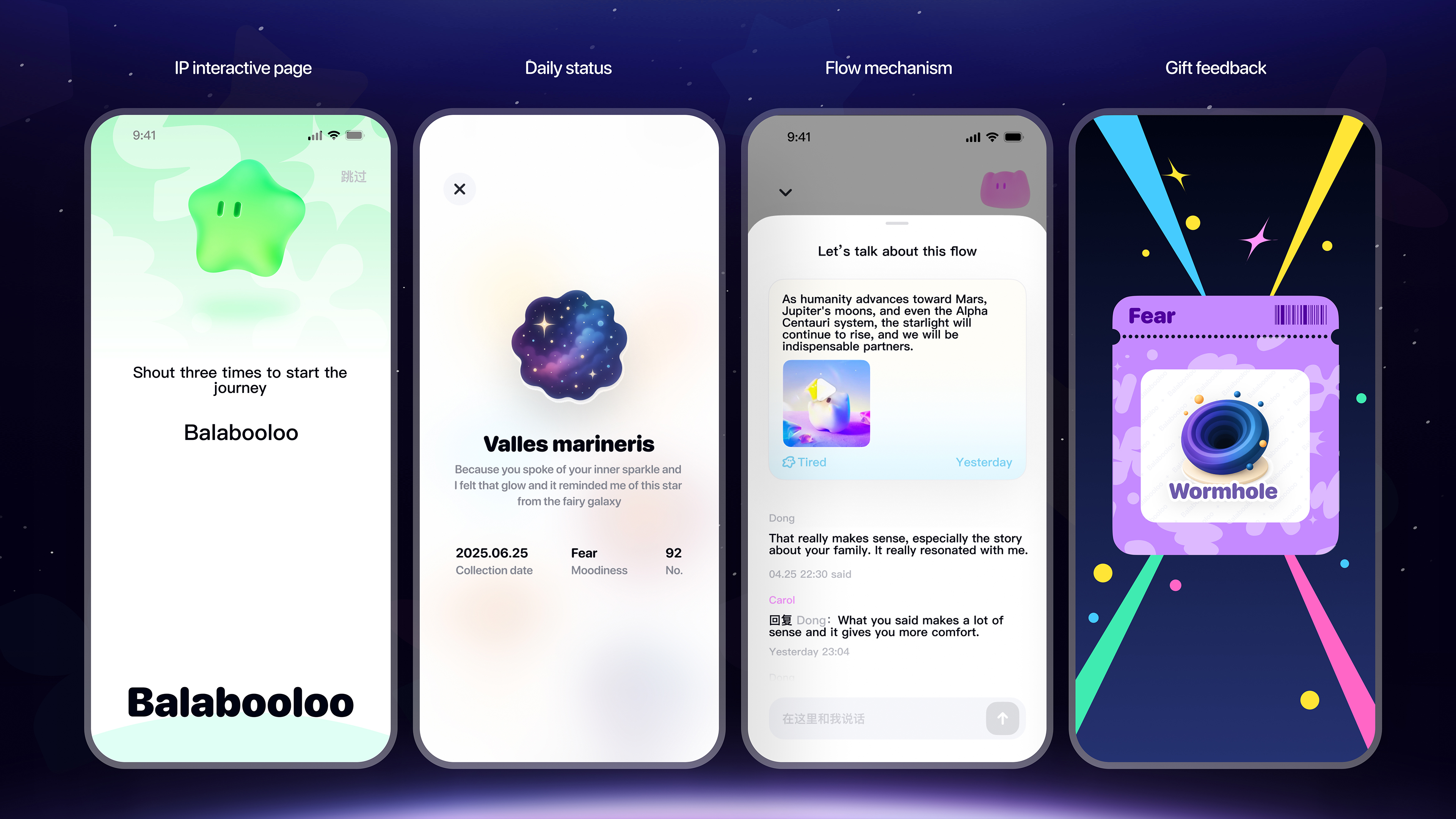 Balabooloo’s AI avatars not only respond instantly to users’ emotional needs but also deeply perceive the psychological expectations behind their words, offering warm companionship. Users can record milestones and daily states, share emotions, and interact with IPs to achieve mutual growth. The “Flow” mechanism turns every interaction into a source of reciprocal development, while the gift feedback system allows users to receive encouragement and kind messages from others within the Growth Planet, fostering emotional connections across space.