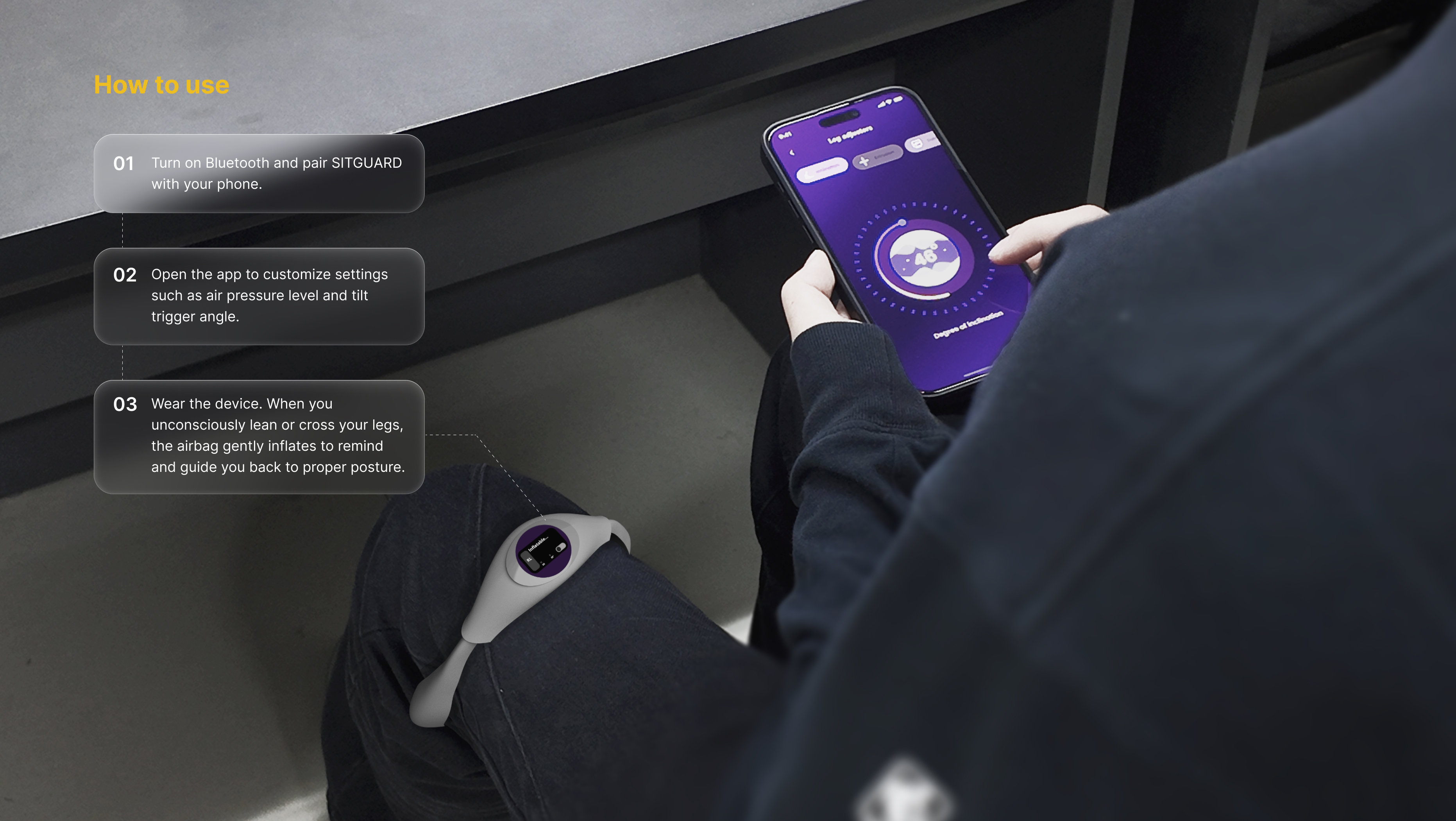 SITGUARD is an intelligent wearable posture correction device. With a 9-axis sensor and a dynamic airbag system, it actively detects and corrects poor posture, gently guiding the body back to alignment. Unlike reminder-based devices, it offers active intervention, comfort-focused soft-airbag support, and visualized health reports through its touchscreen and companion App.