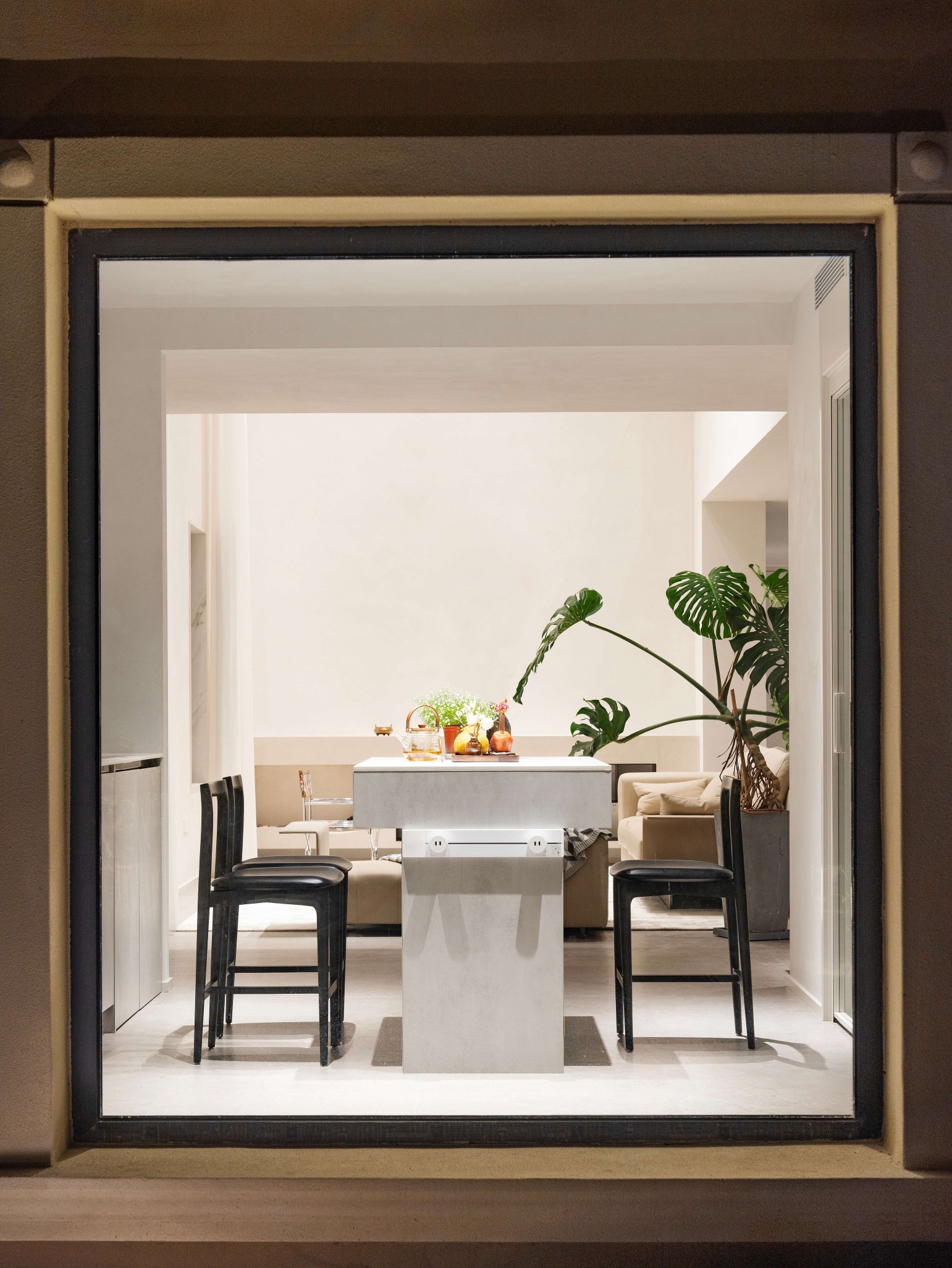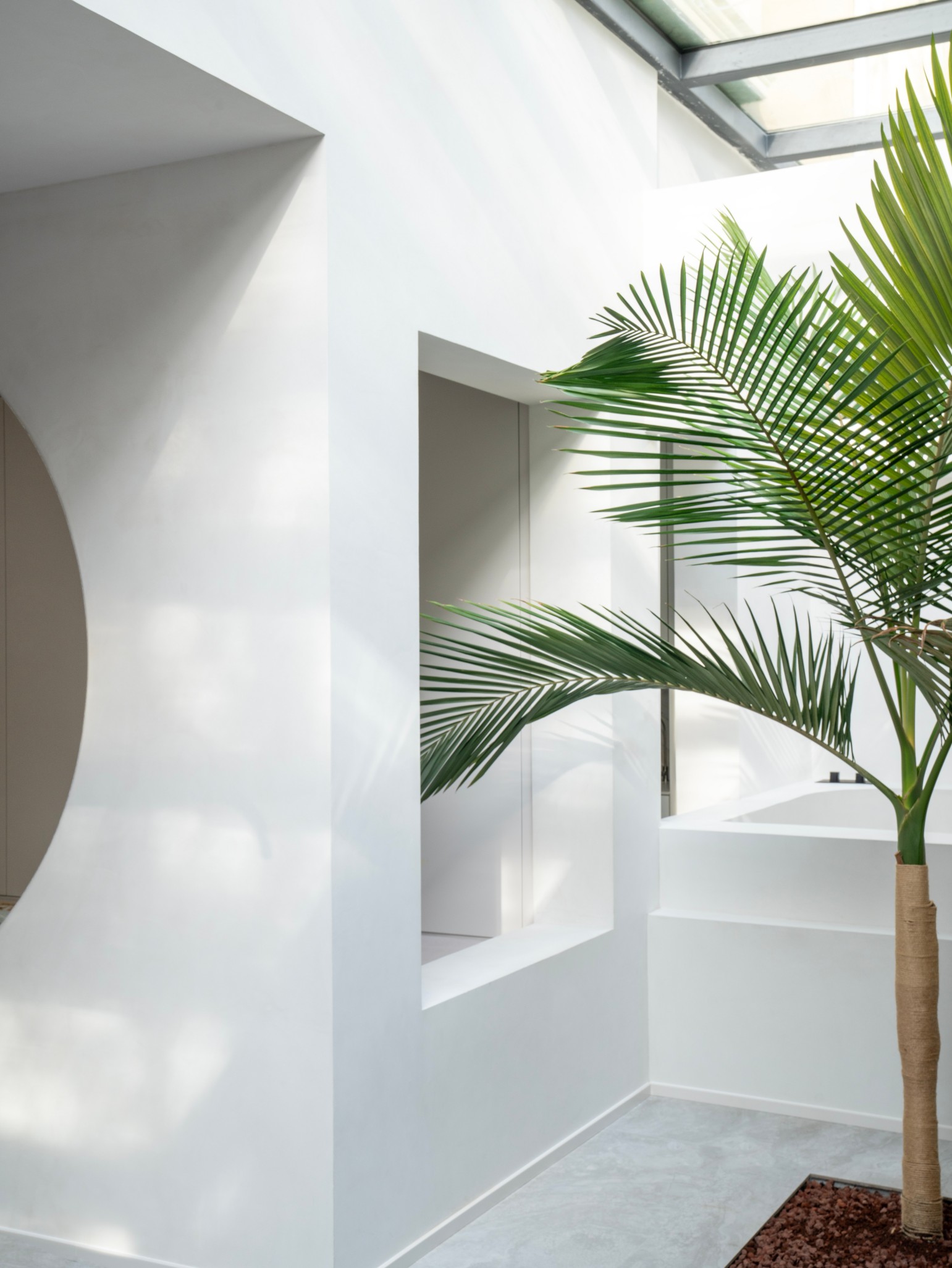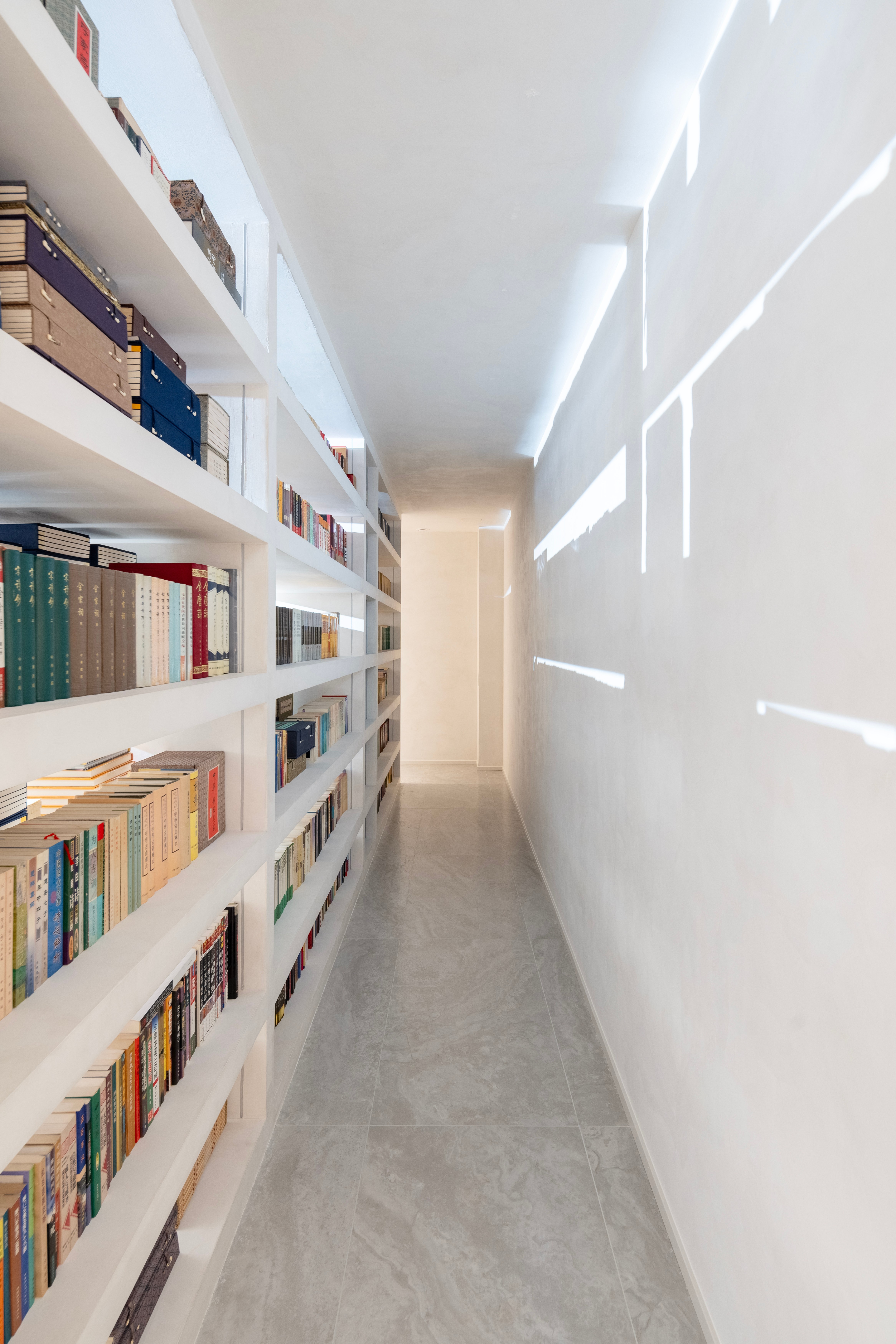 Cultural depth and sensory experience are conveyed through sculptural partitions, curated book displays, skylit pools, and sunlight paired with greenery. Neutral tones, tactile materials, and restrained detailing establish a calm yet powerful atmosphere, while natural elements evoke vitality and intellectual refinement.