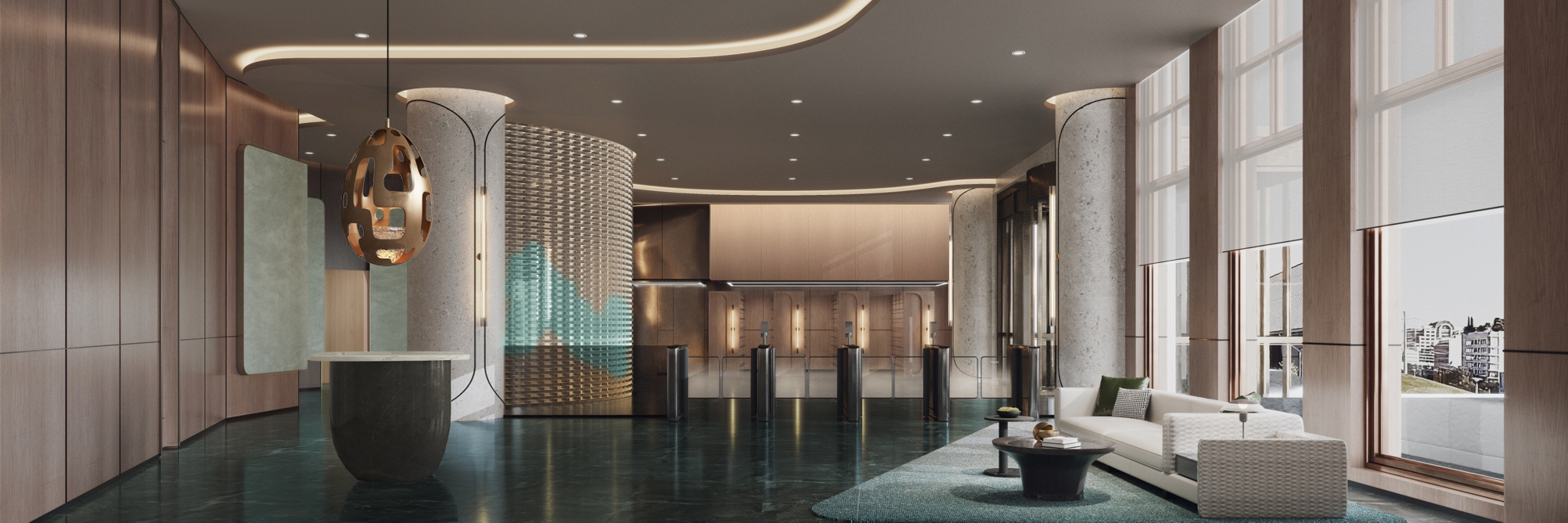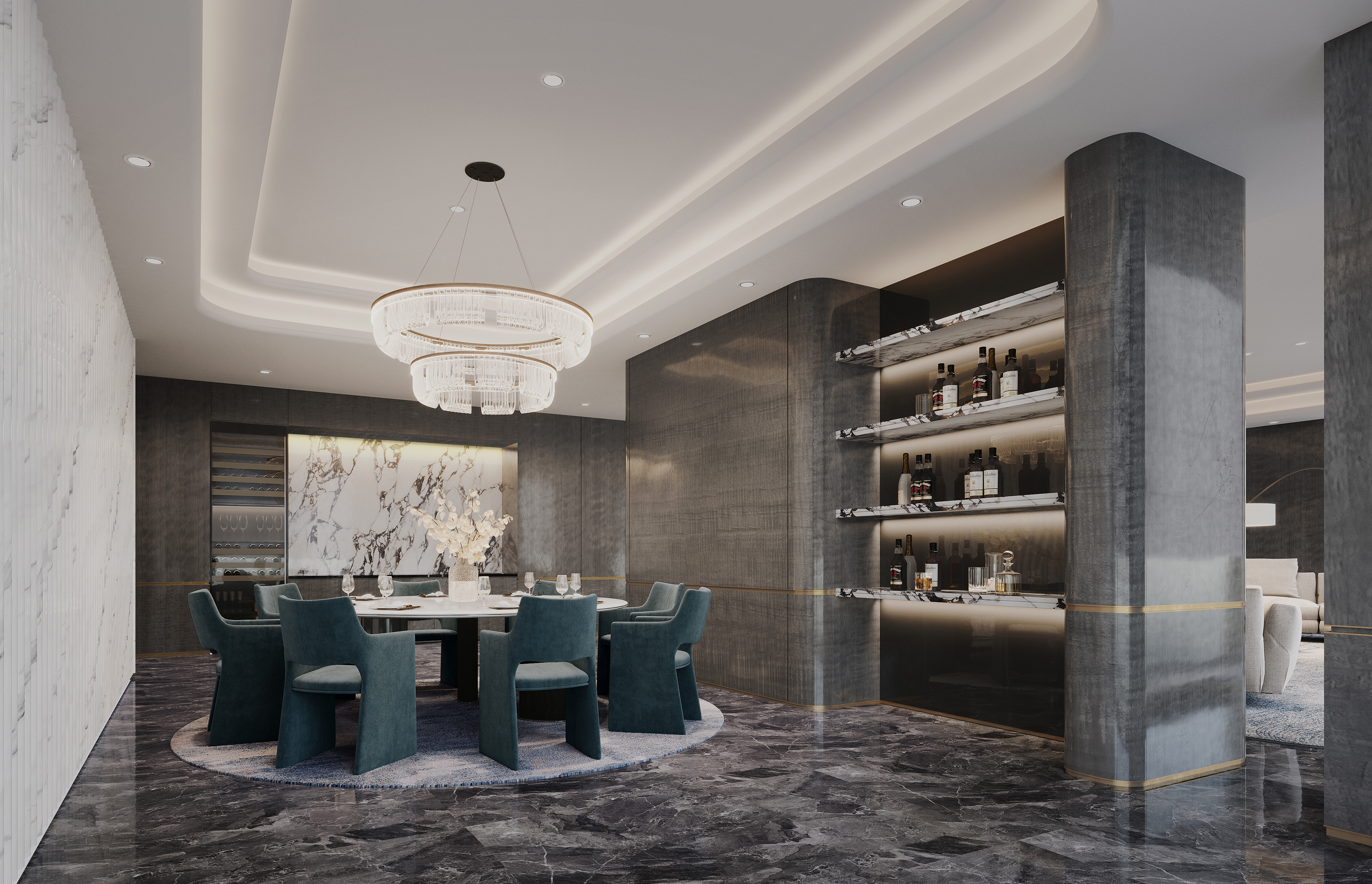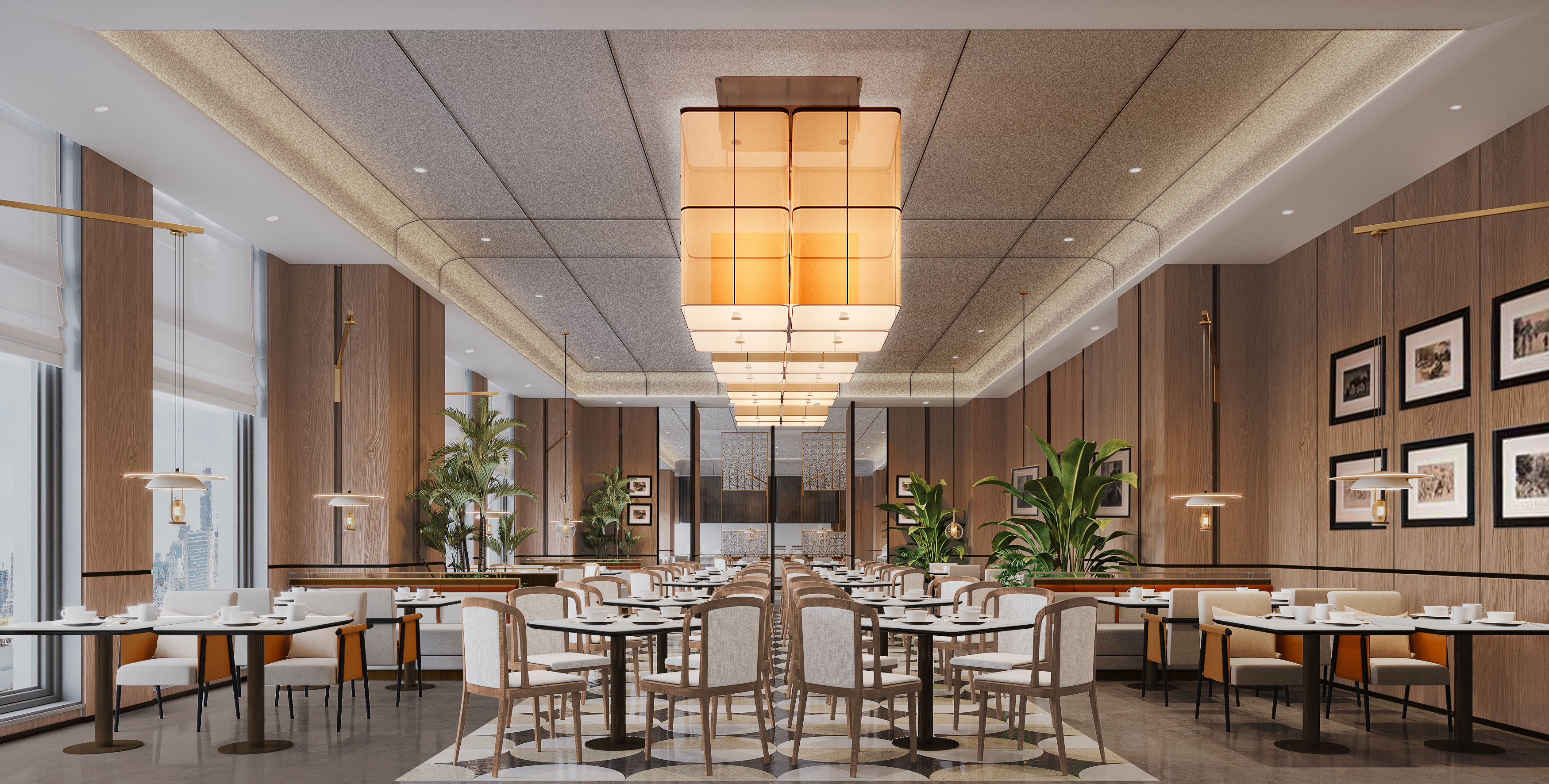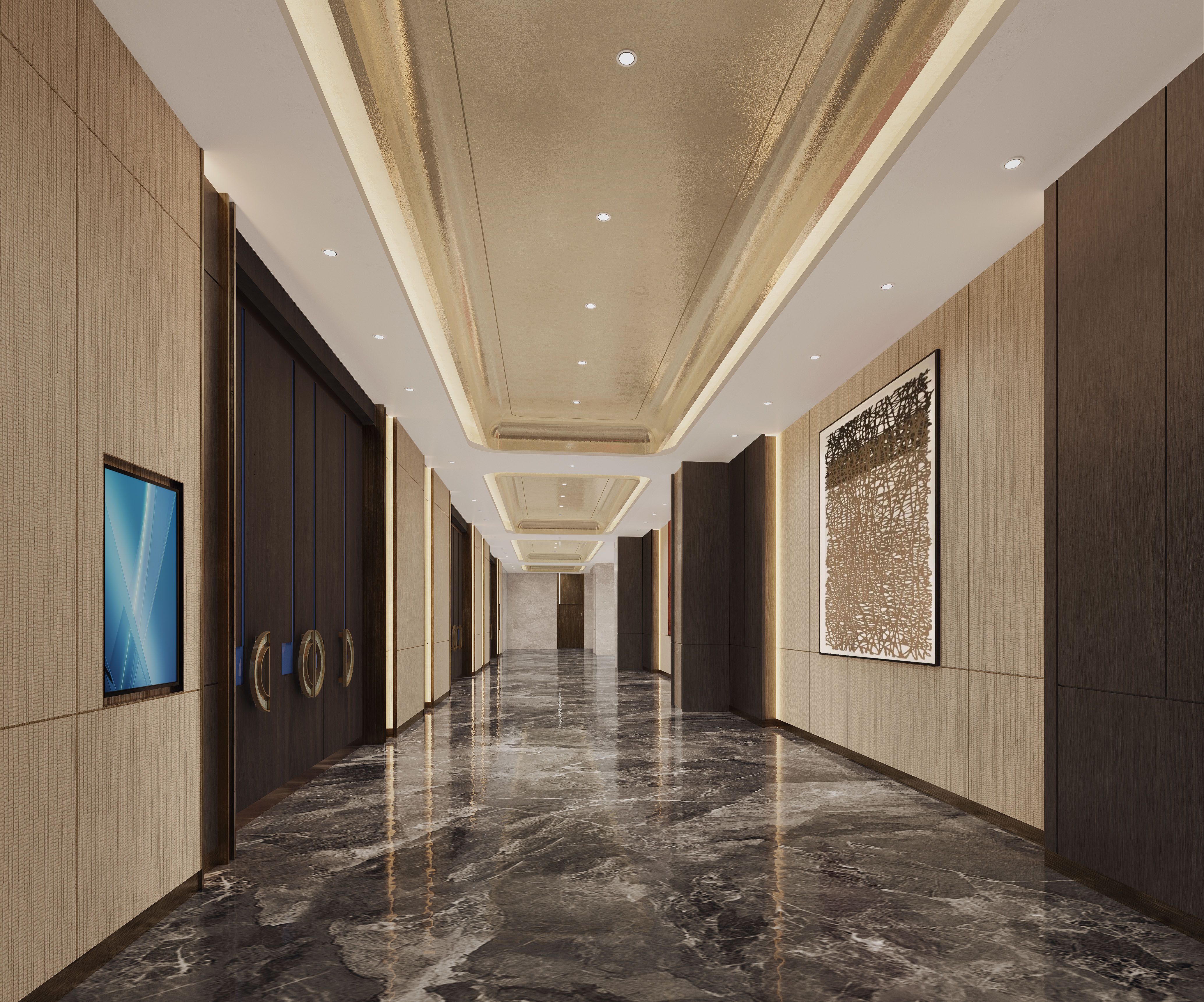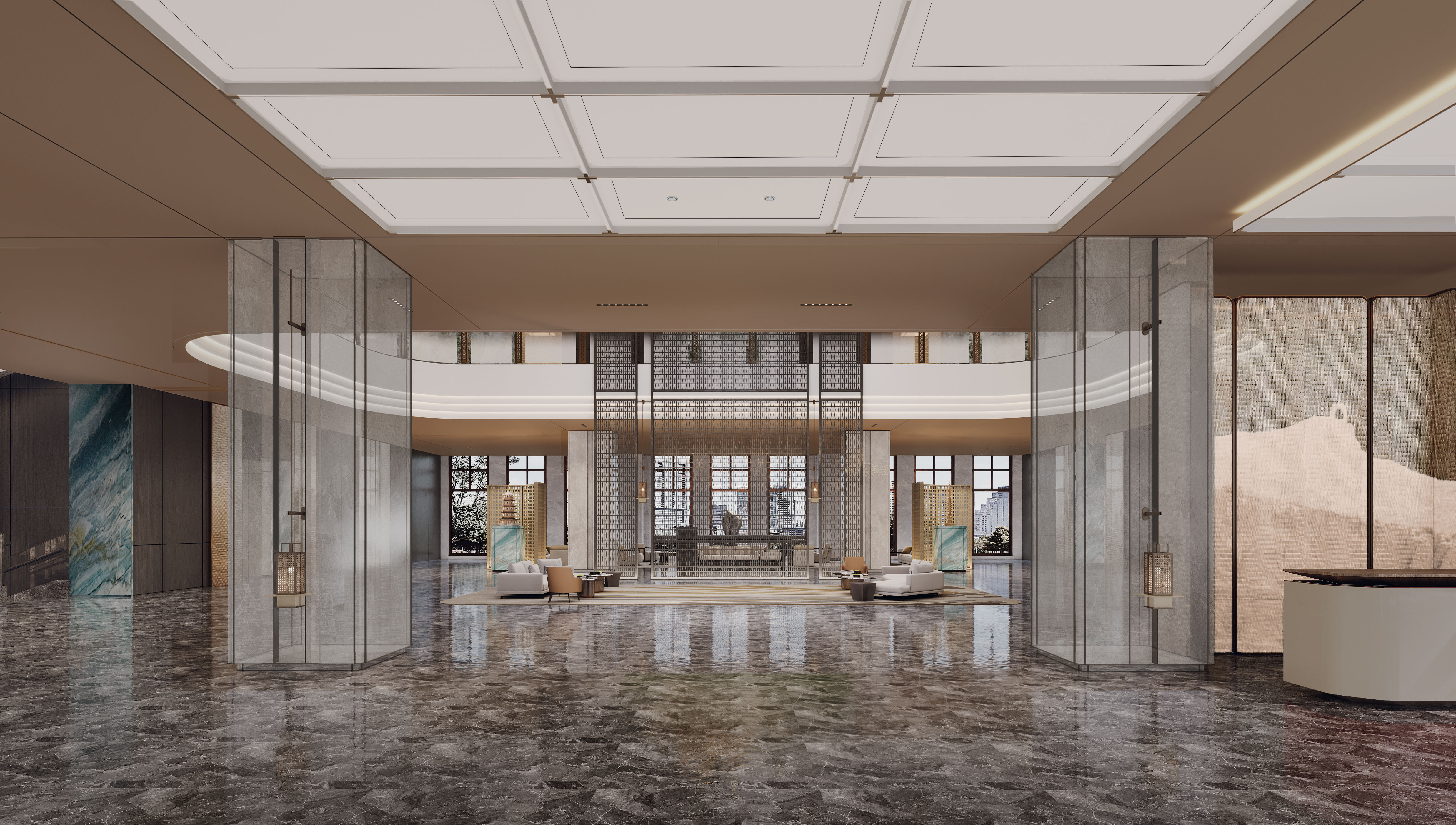 Inspired by "Mist and Rain over the Sanggan River"—one of the ancient eight scenic views of Shanyin County—the design employs a sophisticated combination of bronze and subtle green tones. Modern materials such as glass screens, frosted glass panels, crystal lighting, artistic glass decorations, and hollow grilles are illuminated by soft light descending from the double-height atrium, evoking the dreamy, rain-kissed atmosphere of the Sanggan River banks. This approach vividly brings to life the natural scenery along the Sanggan River, immersing guests in the poetic ambiance of its enchanting drizzle.