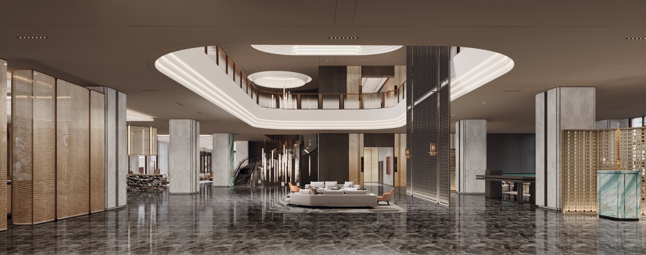 Strategically leveraging the first span of western load-bearing columns, the hotel employs a north-south open layout that integrates the lobby, dining areas on both sides, and the hot spring department lobby into a continuous, expansive space. Upon entry, guests are immediately struck by a breathtaking 100-meter visual depth. The journey continues into the atrium, where the double-height structure spans from the first to the seventh floor, delivering an awe-inspiring sense of grandeur and spatial liberation.