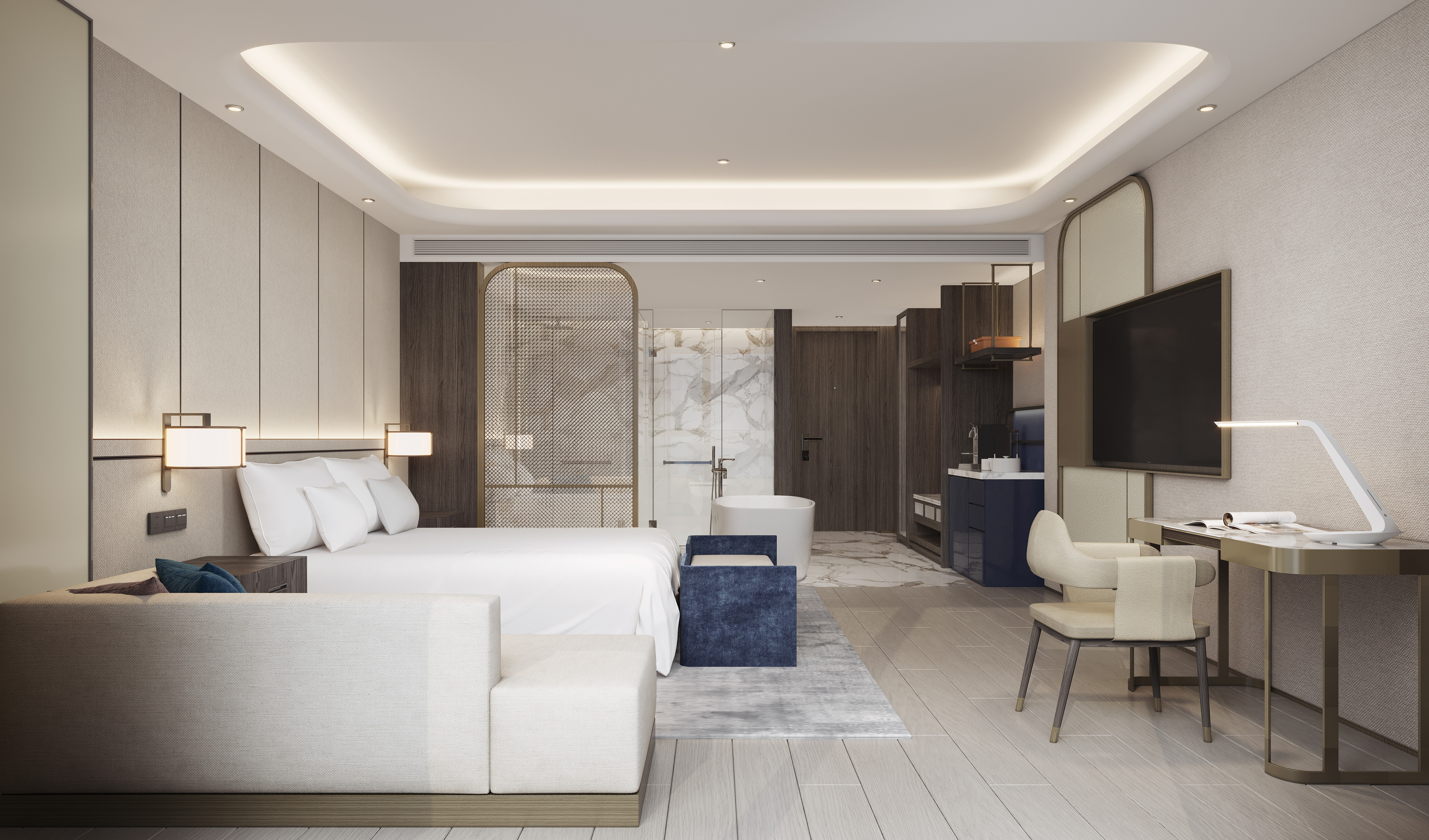 The hotel draws inspiration from the arched contours of the ancient Great Wall, weaving this fluid form throughout every corner. Public areas—lobby, all-day dining, and banquet halls—feature a base palette of Shanxi courtyard-style gray stone and dark brown wood accents. Traditional Chinese hues like vibrant red and subtle green are cleverly integrated with modern tones such as jewel blue and tangerine orange.This color scheme vividly mirrors the bold contrasts of northern Shanxi's sunlit yellow-earth landscapes within the Yanmen Pass,offering guests an immersive cultural experience of Shanxi.