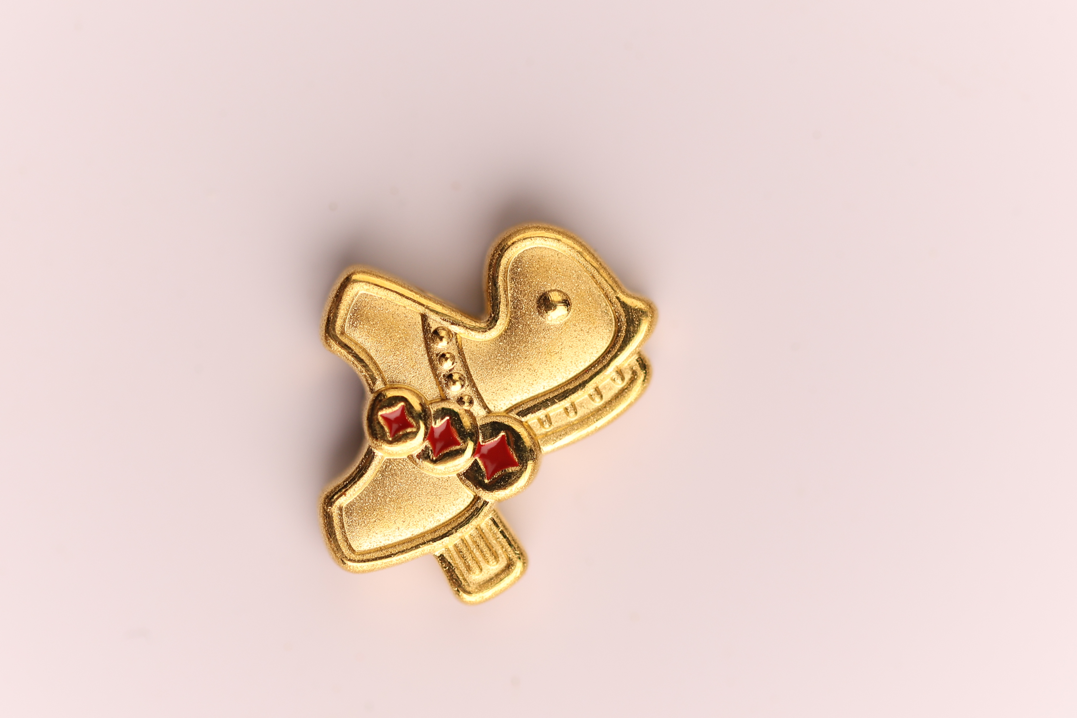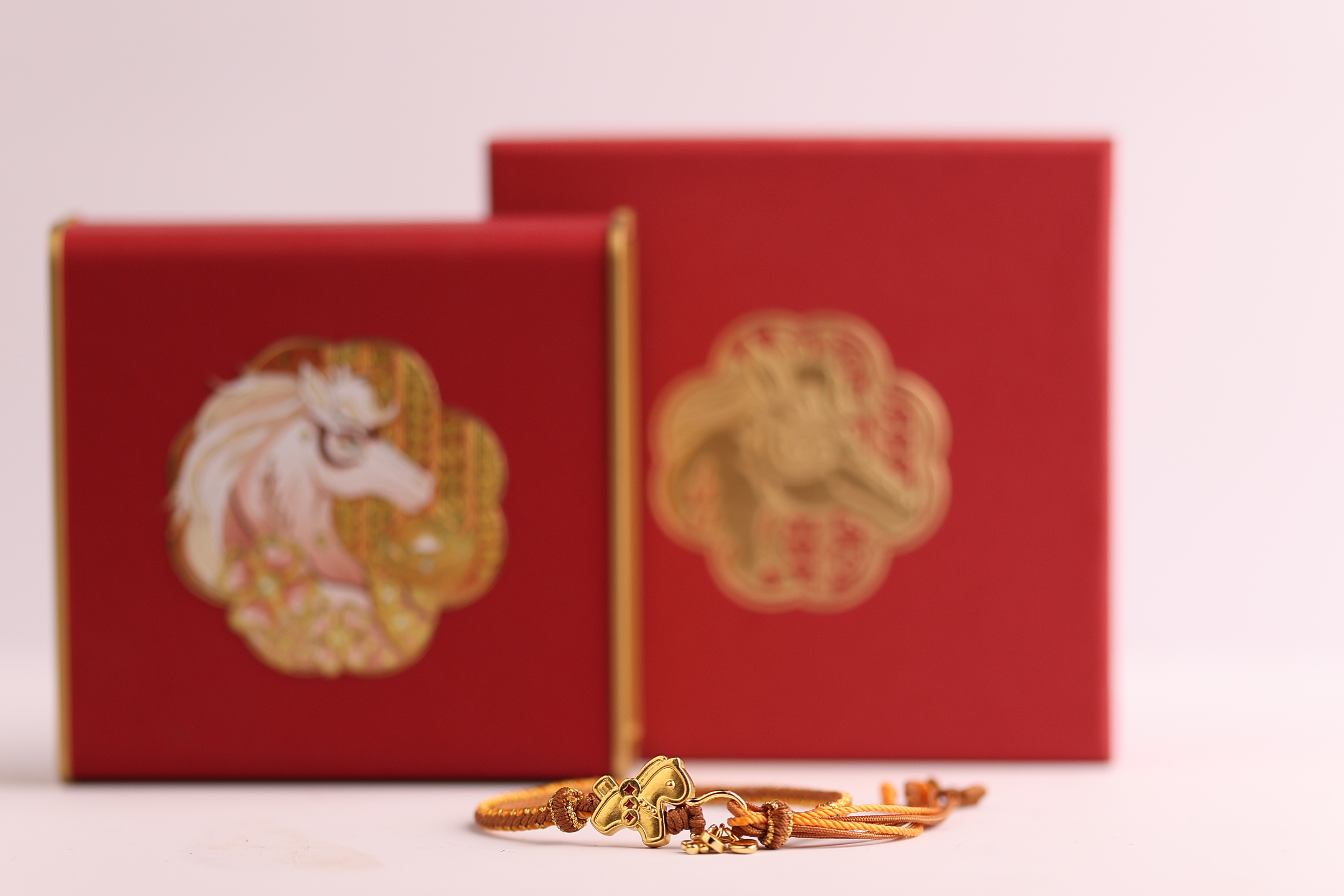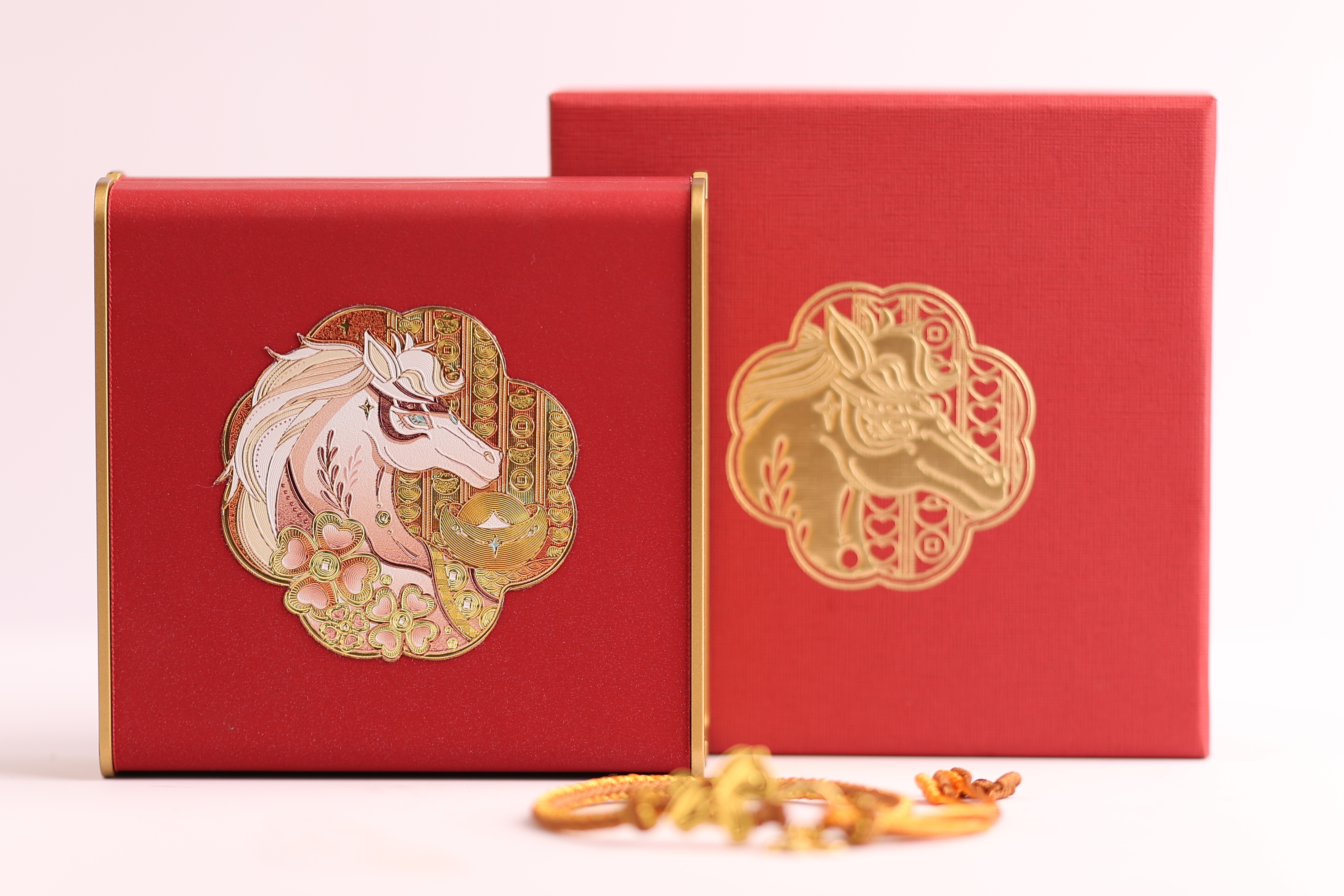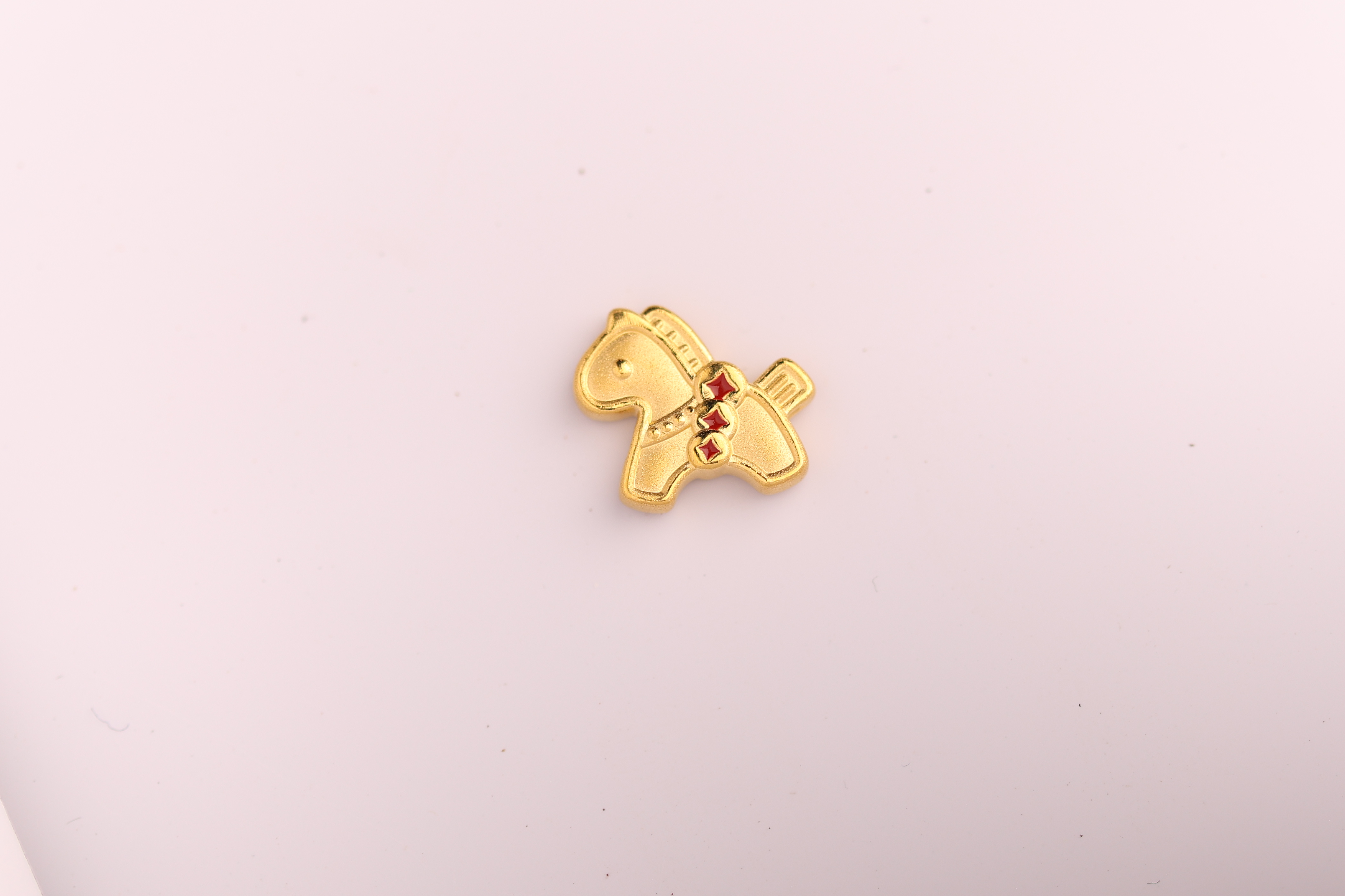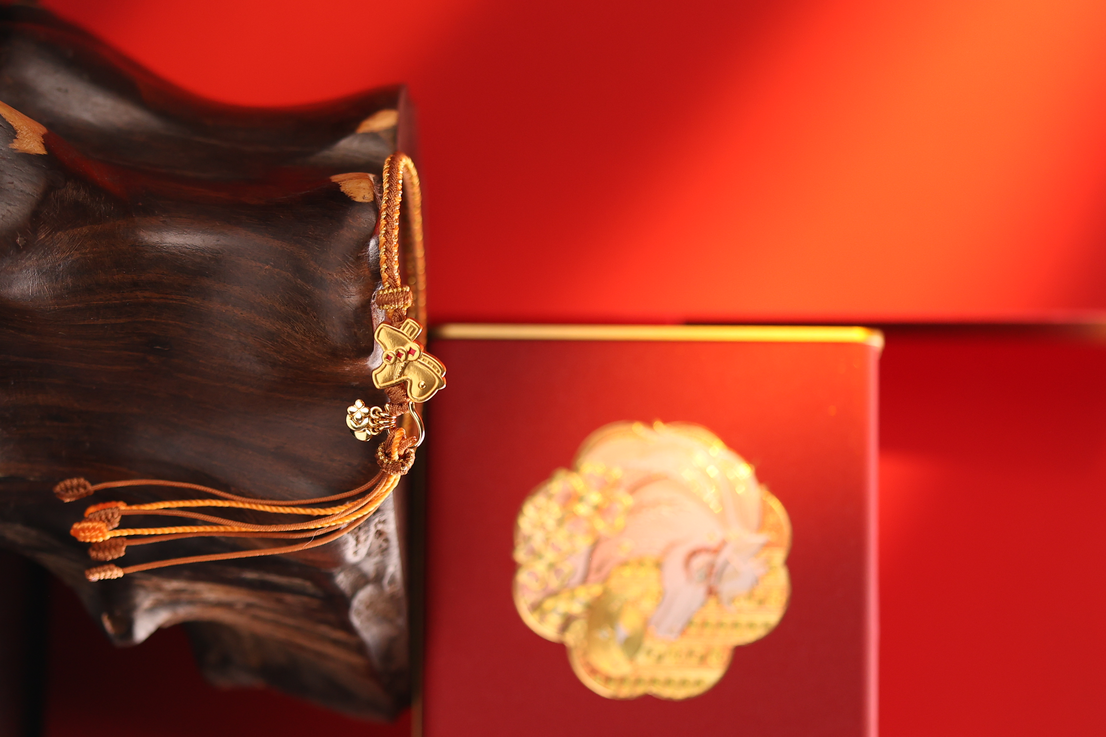 Crafted through advanced 5D hard gold techniques, the pendant captures graceful lines and a luminous sheen. Three red coin motifs adorn the horse’s body, symbolizing wealth and prosperity. Subtle yet intricate, each detail speaks to a refined aesthetic where artistry meets blessing.