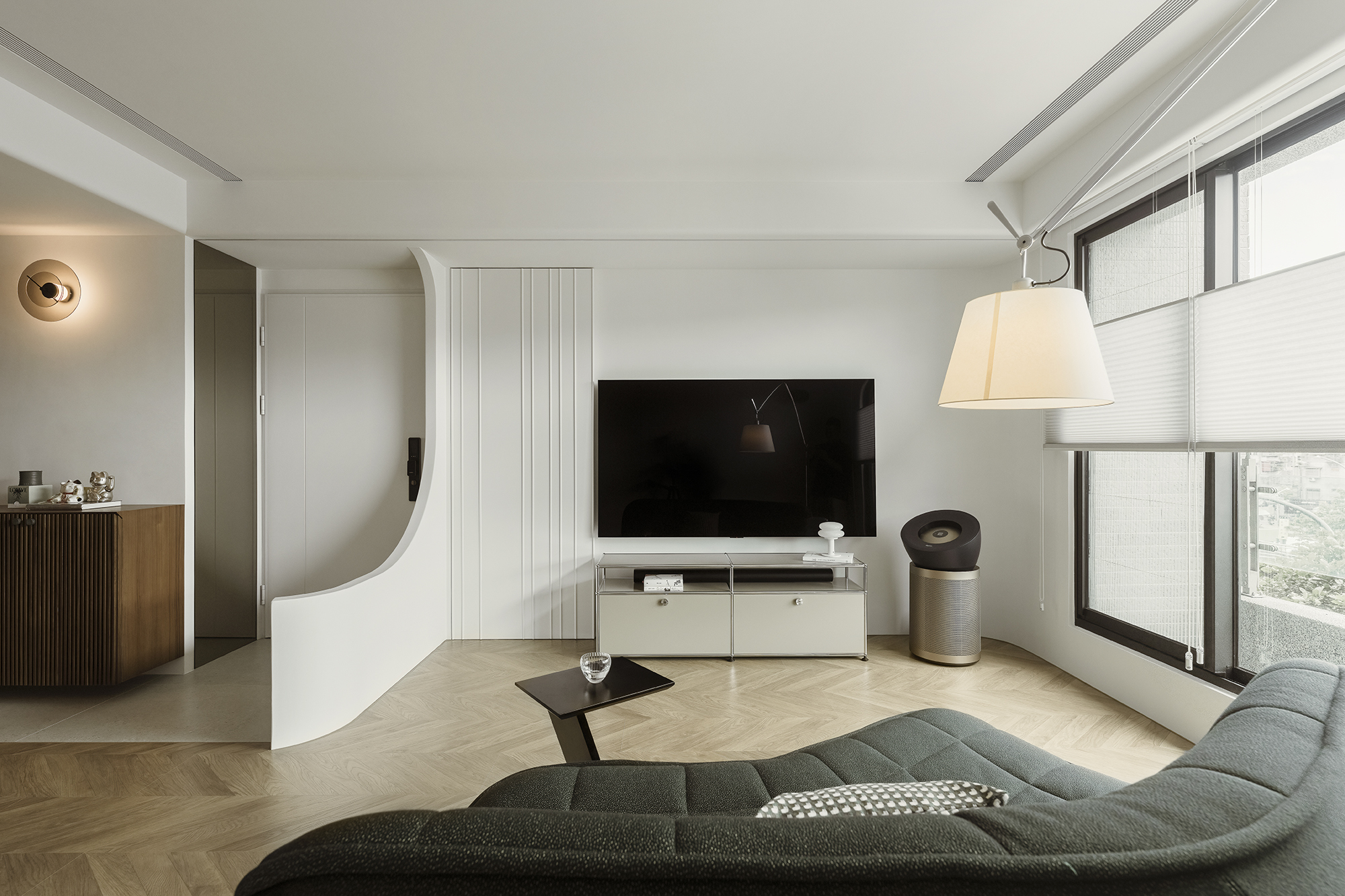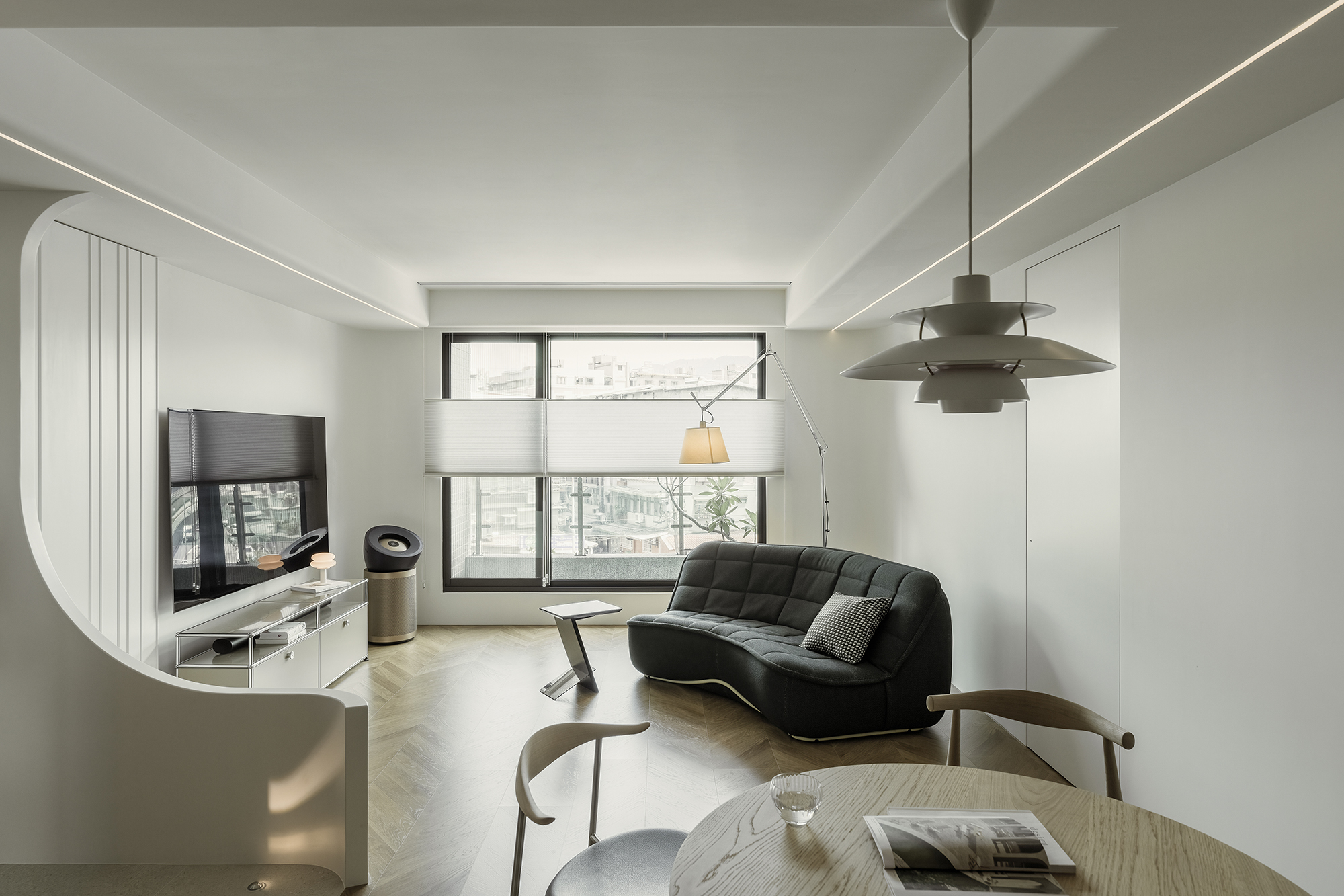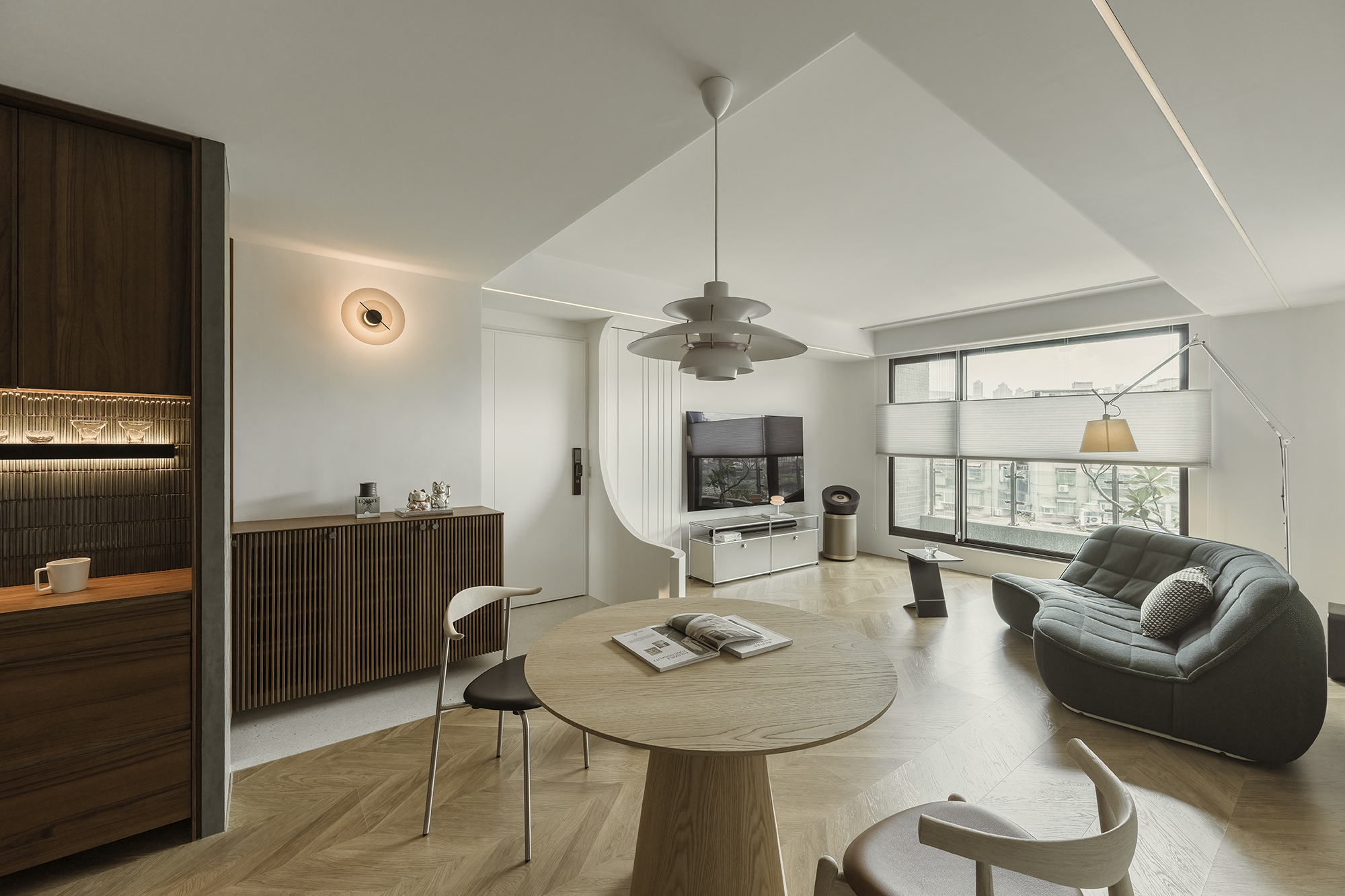 This 60-square-meter modern residence artfully showcases a design philosophy that emphasizes the maximization of limited space. From the moment you step inside, the seamless circulation and thoughtful material selection create an inviting sense of openness while ensuring high functionality throughout the home. To effectively address the common challenge of limited natural light typical in urban environments, the residence incorporates double-layered curtains alongside indirect lighting. This strategic combination allows for precise control over illumination, fostering a well-lit and welcoming atmosphere. Throughout the space, rich wood textures and specialized coatings are elegantly paired with low-saturation neutral tones, enhancing the overall aesthetic. Moreover, the furniture—a carefully curated blend of international brands and pieces from the homeowner's personal collection—brings an additional layer of character to the environment. This harmonious integration not only reflects the homeowner’s unique personality but also contributes to the creation of a refined and sophisticated modern urban atmosphere.