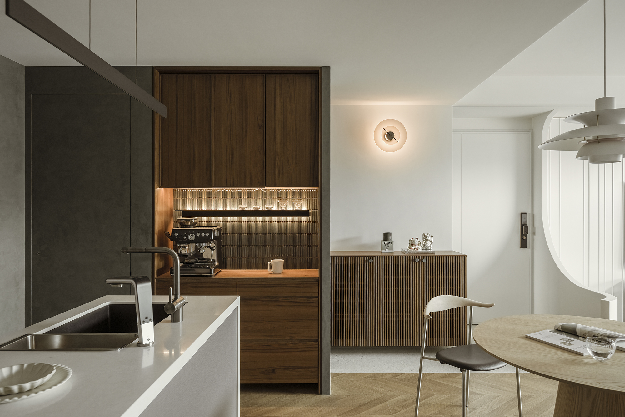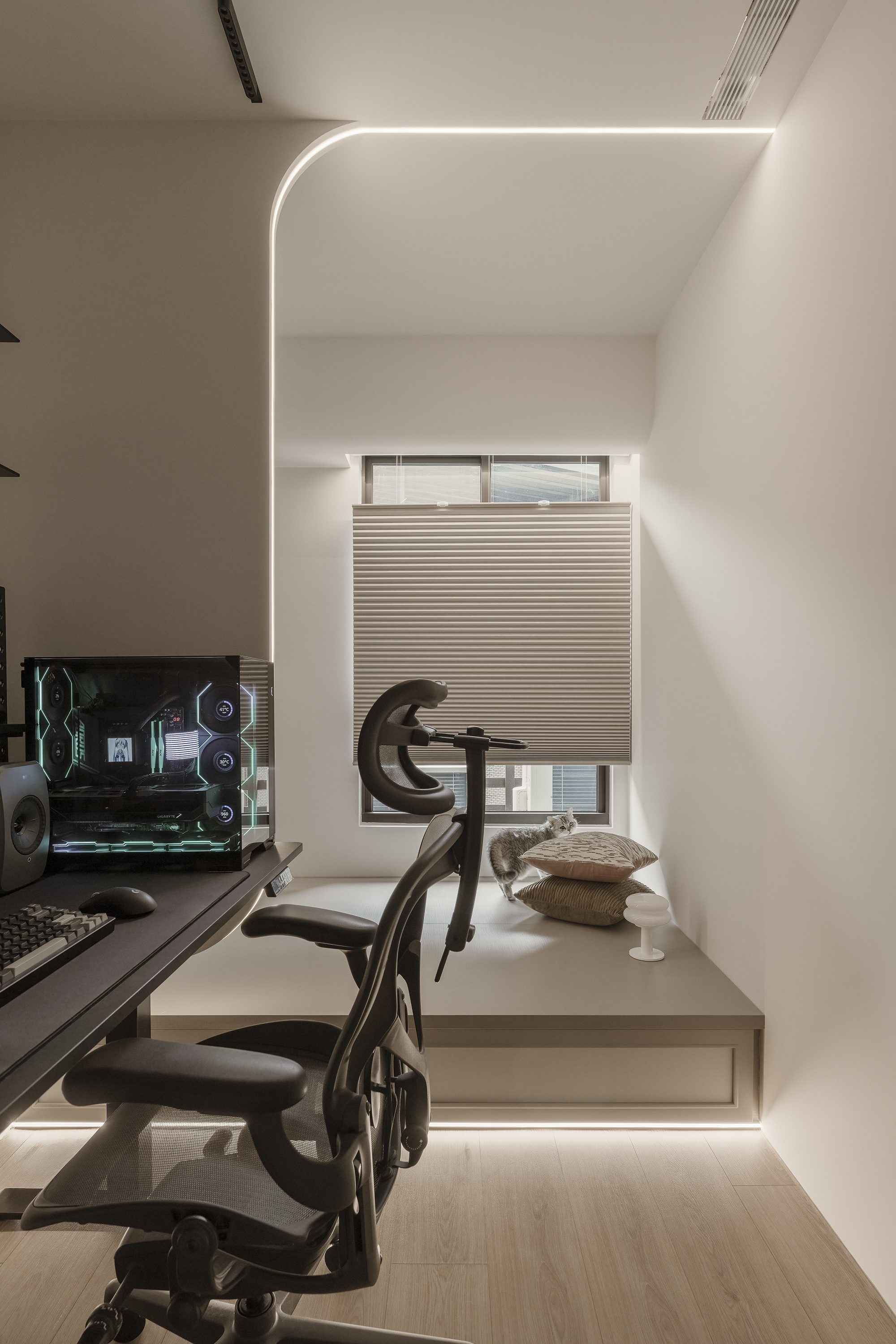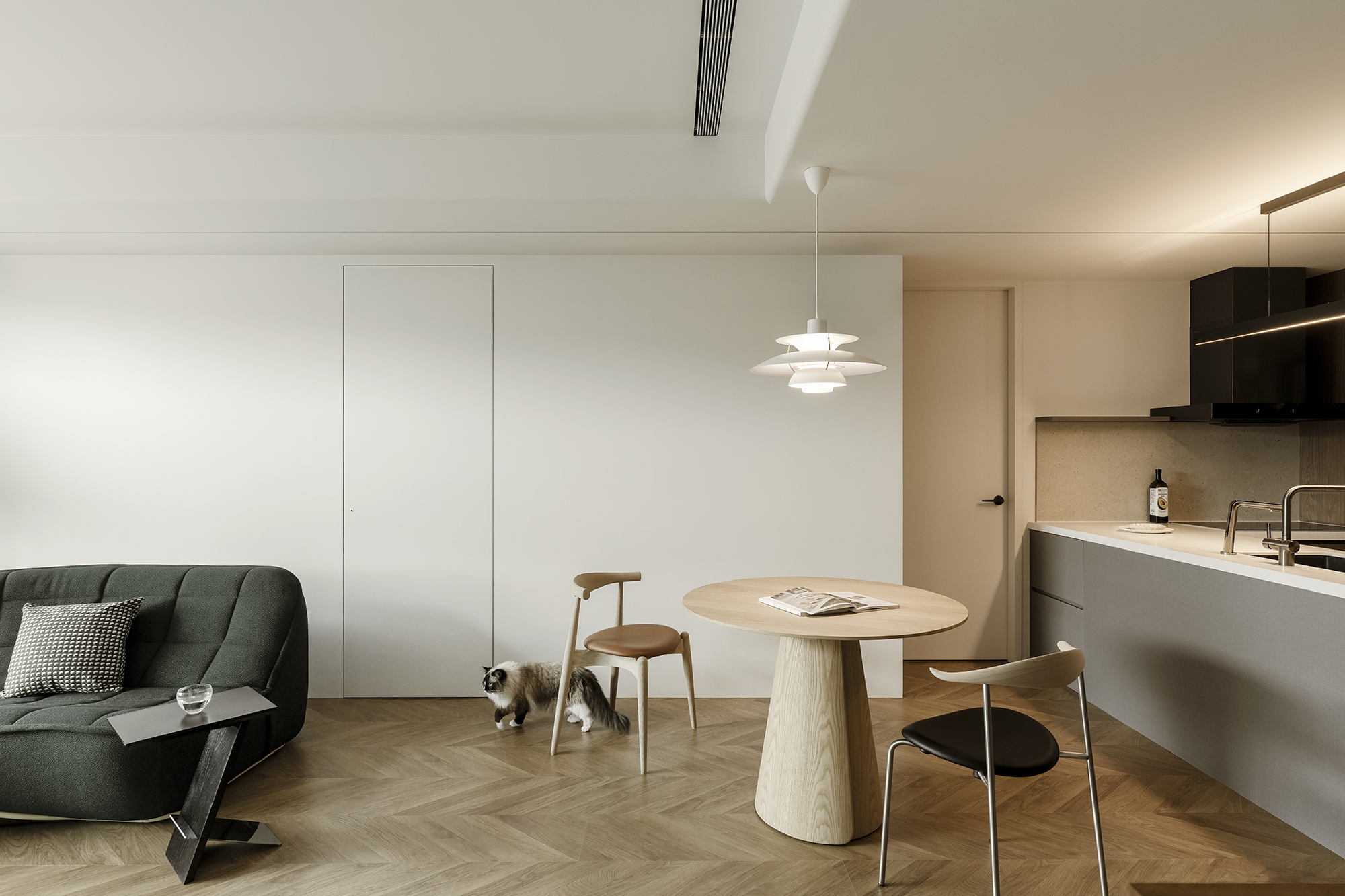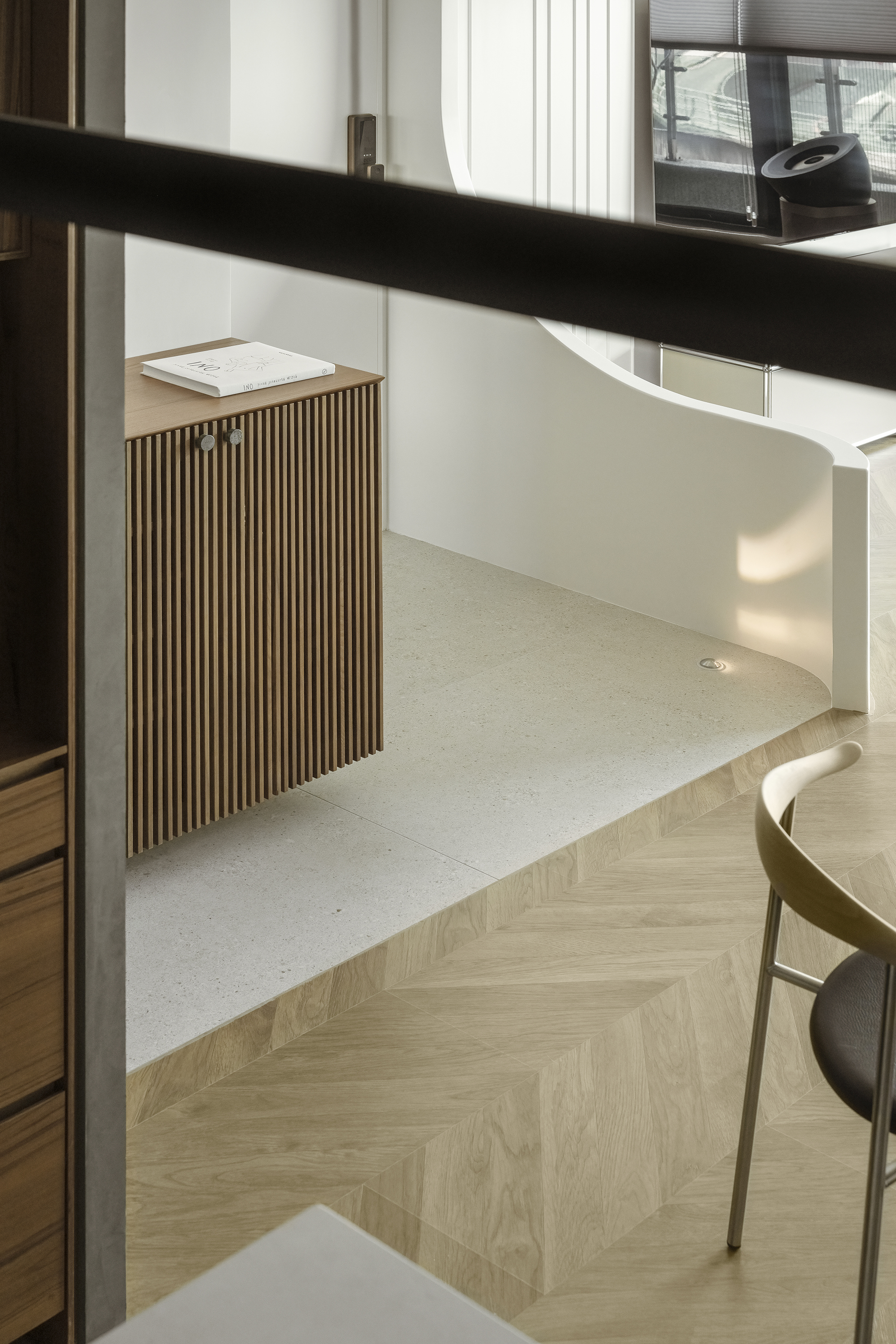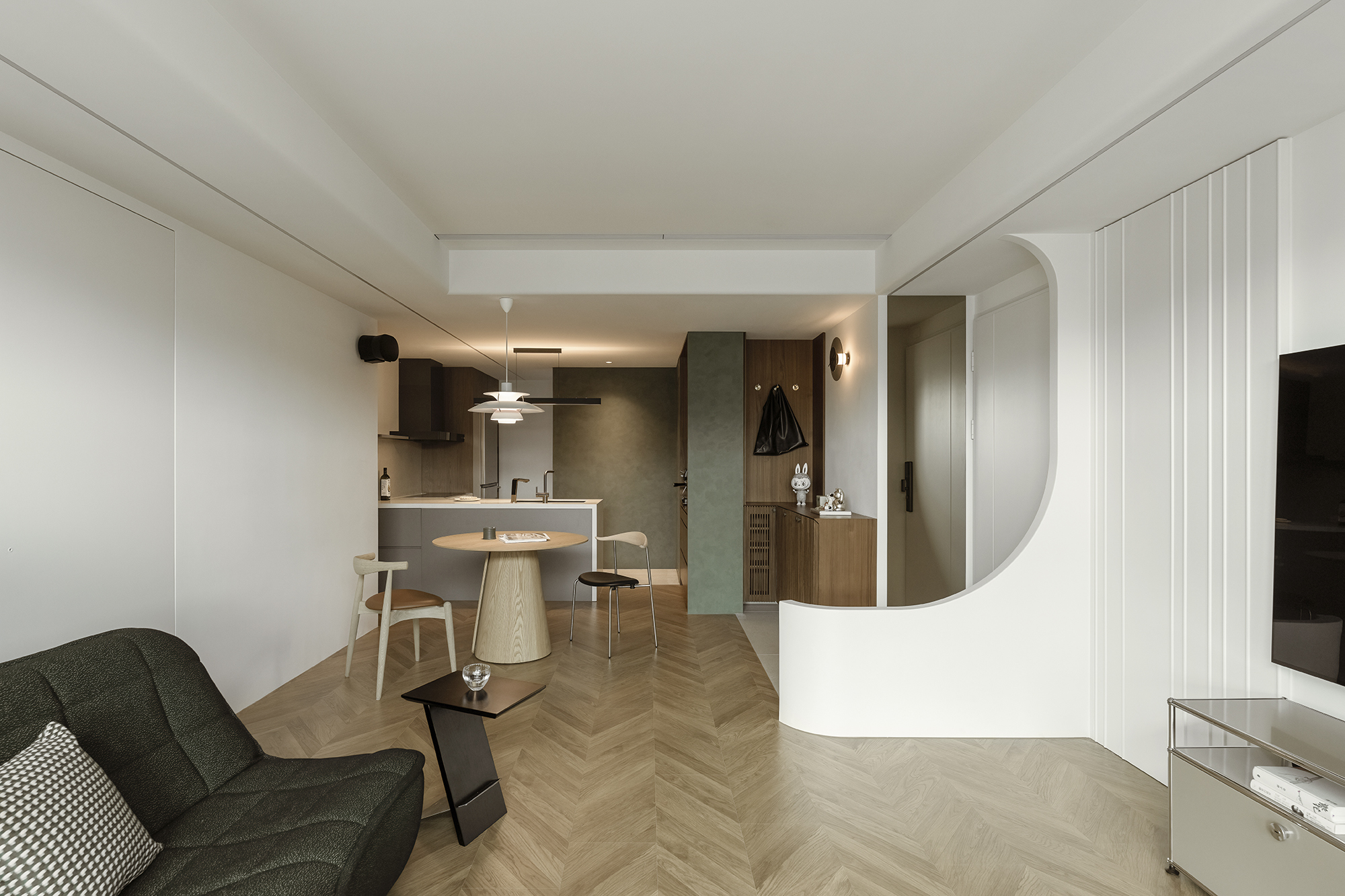 The entryway and living room are elegantly distinguished by contrasting flooring materials and gracefully curved cabinetry, which artfully guide the flow of movement throughout the space. An inviting off-white and warm wood-toned color palette extends throughout the public areas, while a striking dark green sofa serves as a captivating visual focal point, drawing the eye and enhancing the overall aesthetic. Adding a touch of sophistication, the herringbone parquet flooring introduces depth and dimension, creating an intriguing foundation for the design. Moreover, the dining area and kitchen are seamlessly integrated through an open-plan island and a circular dining table, promoting a sense of togetherness and functionality. Pendant lights hang delicately above, echoing the textures found within the space and creating a warm ambiance. Furthermore, the dark wood cabinets, when paired with the soft gray-green painted walls, along with the concealed lighting, reveal subtle layers of design, ensuring a cohesive continuity that elevates the entire atmosphere. The study is thoughtfully designed with distinct functional zones, skillfully combining a dedicated work area with a raised relaxation platform. The use of linear light strips not only outlines the contours of these spaces but also adds an inviting sense of spatial depth.