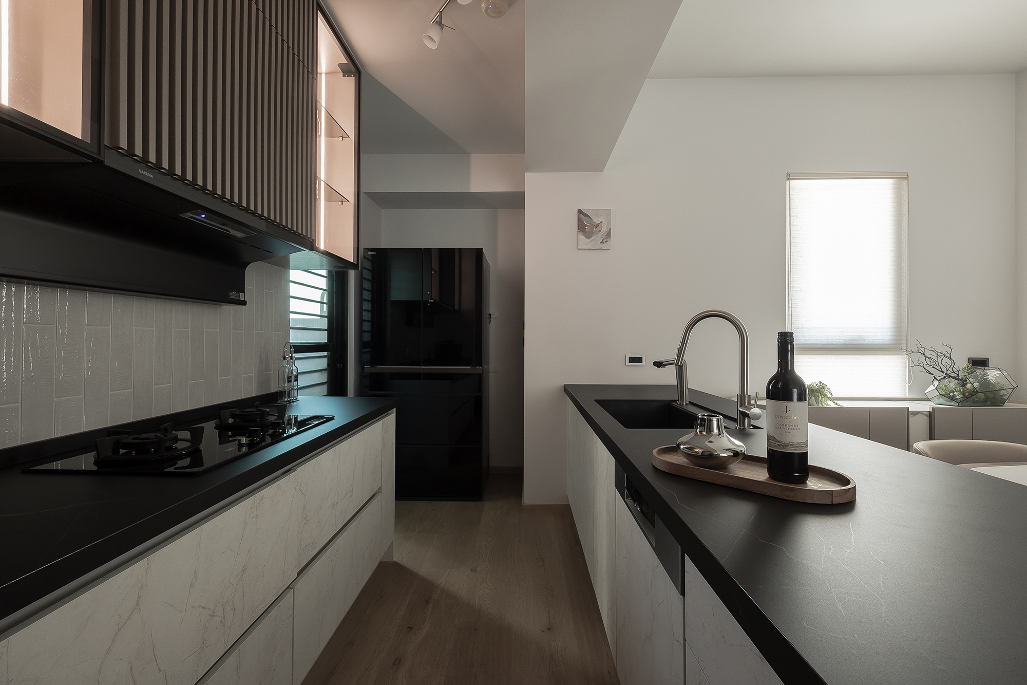 Given the owner’s passion for wine, the designers integrated metro tiles, a wine cabinet, and fine wood-grained door panels to enrich the kitchen’s expression. Lighting choices blend circular and linear forms, softening the glow into the air and creating a sense of quiet flow. When light falls upon the amber liquid in a wine bottle, it reflects through the curved wall and white panels, rippling like honey in motion. In this suspended stillness, time itself seems to slow.