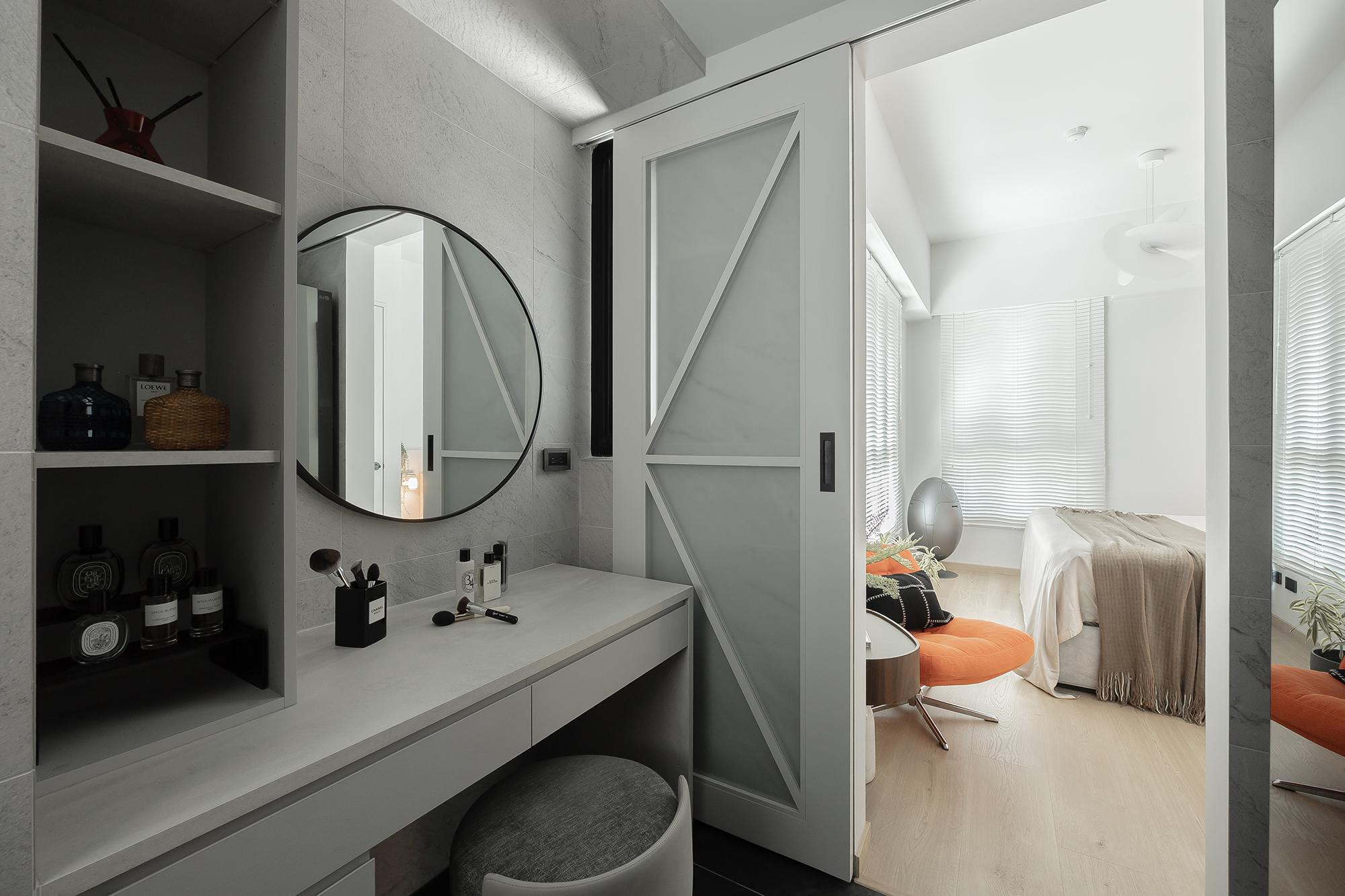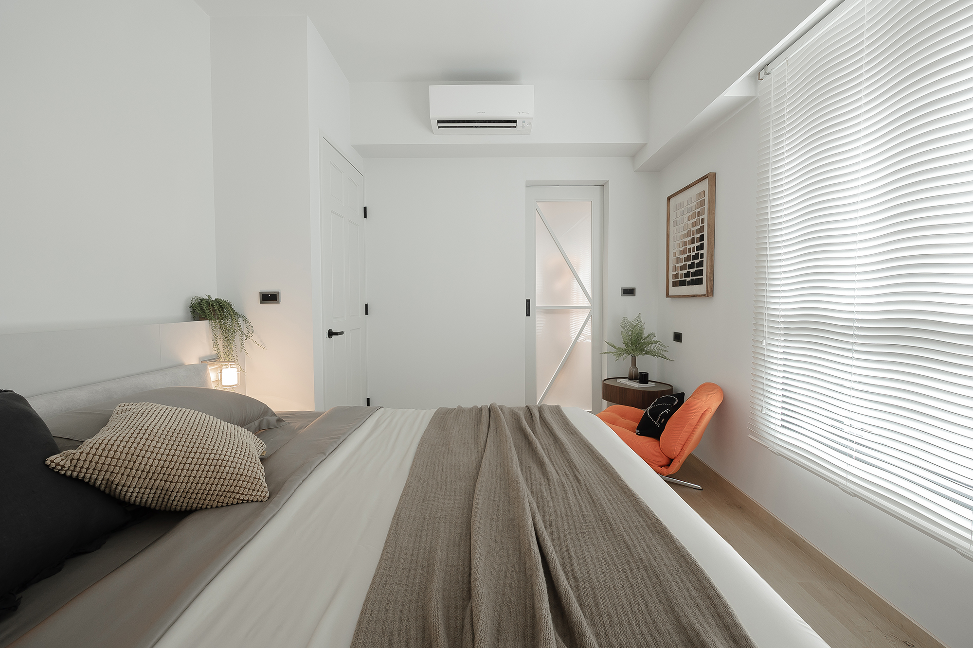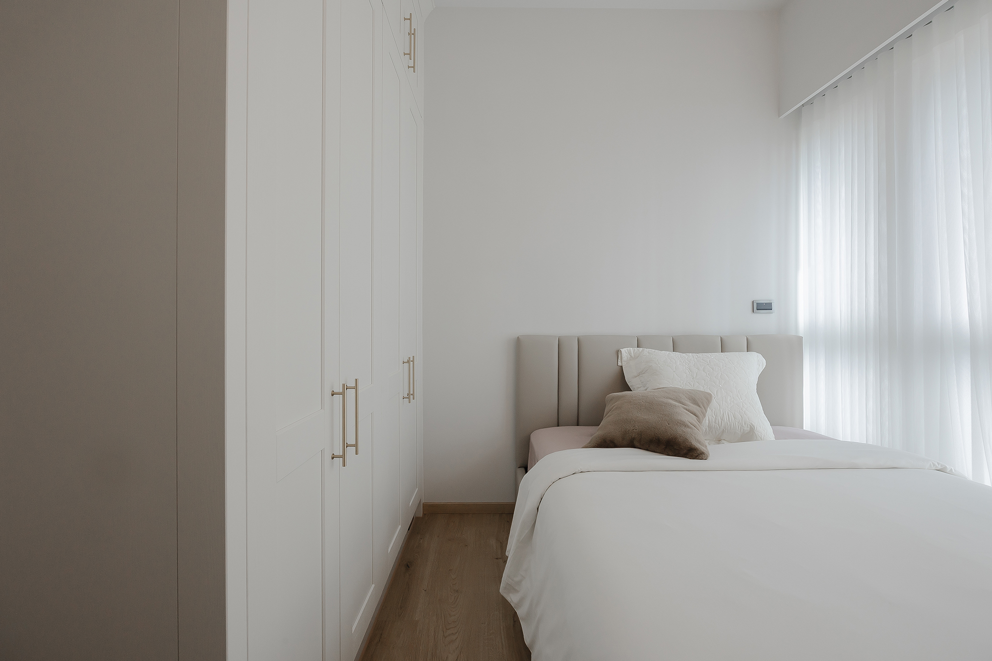 The private area continues the minimalist narrative. The master bedroom adopts subtle gray-white tones and textured wall patterns, extending seamlessly to the dressing and vanity area. The secondary bedroom, designed for the homeowner’s mother, is rendered in warm white simplicity, evoking the gentle ease of a Muji-inspired retreat.