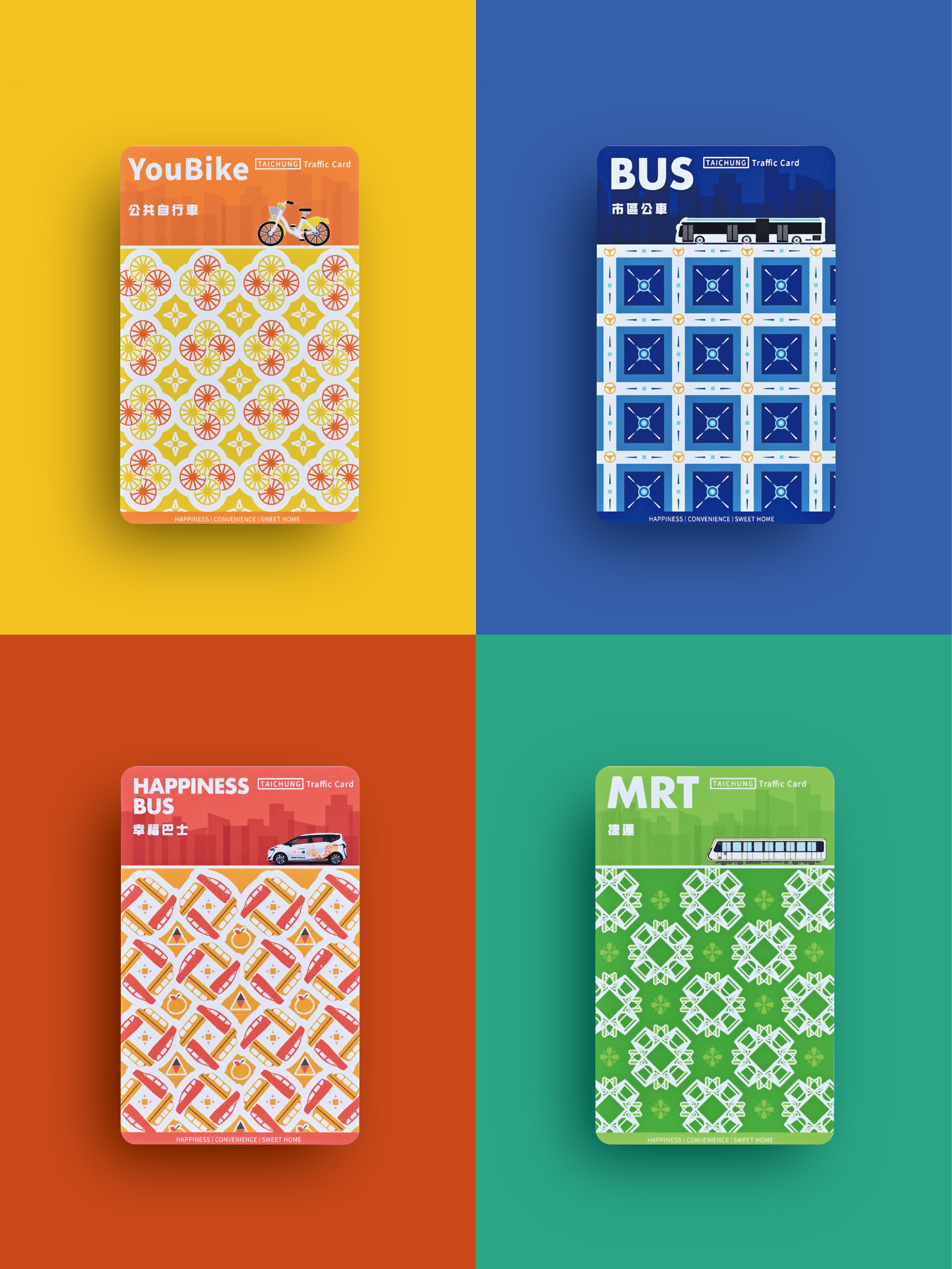 The development of public transport in Taichung ranges from urban bus, taxi, U-Bike, MRT, and the bus in the countryside. For each of these systems, we have set up representative colors for them according to their different user groups, service areas, and passenger experiences. In this series of e-ticket cards, we incorporated the concepts of totem and semiotic to highlight their unique characteristics.