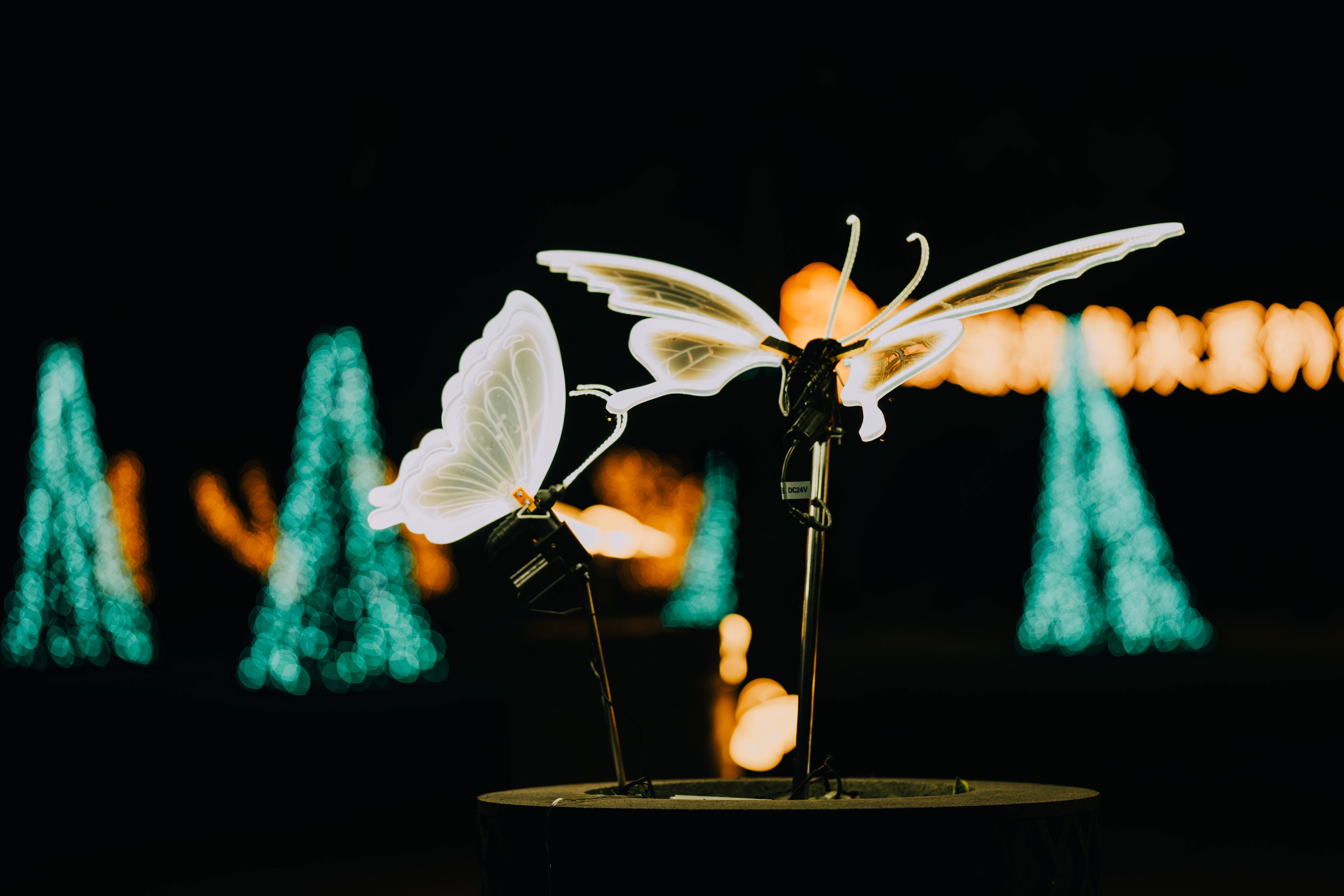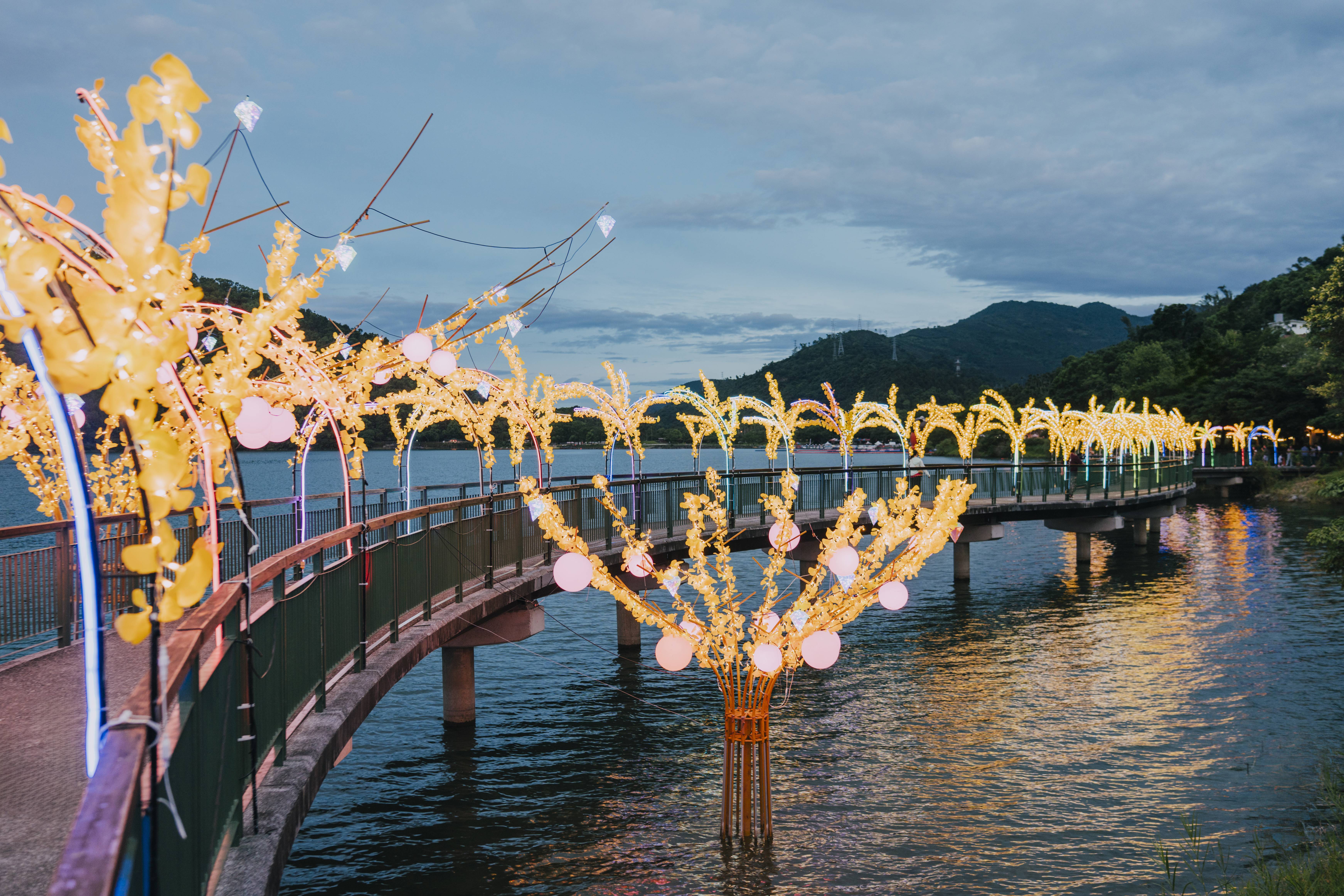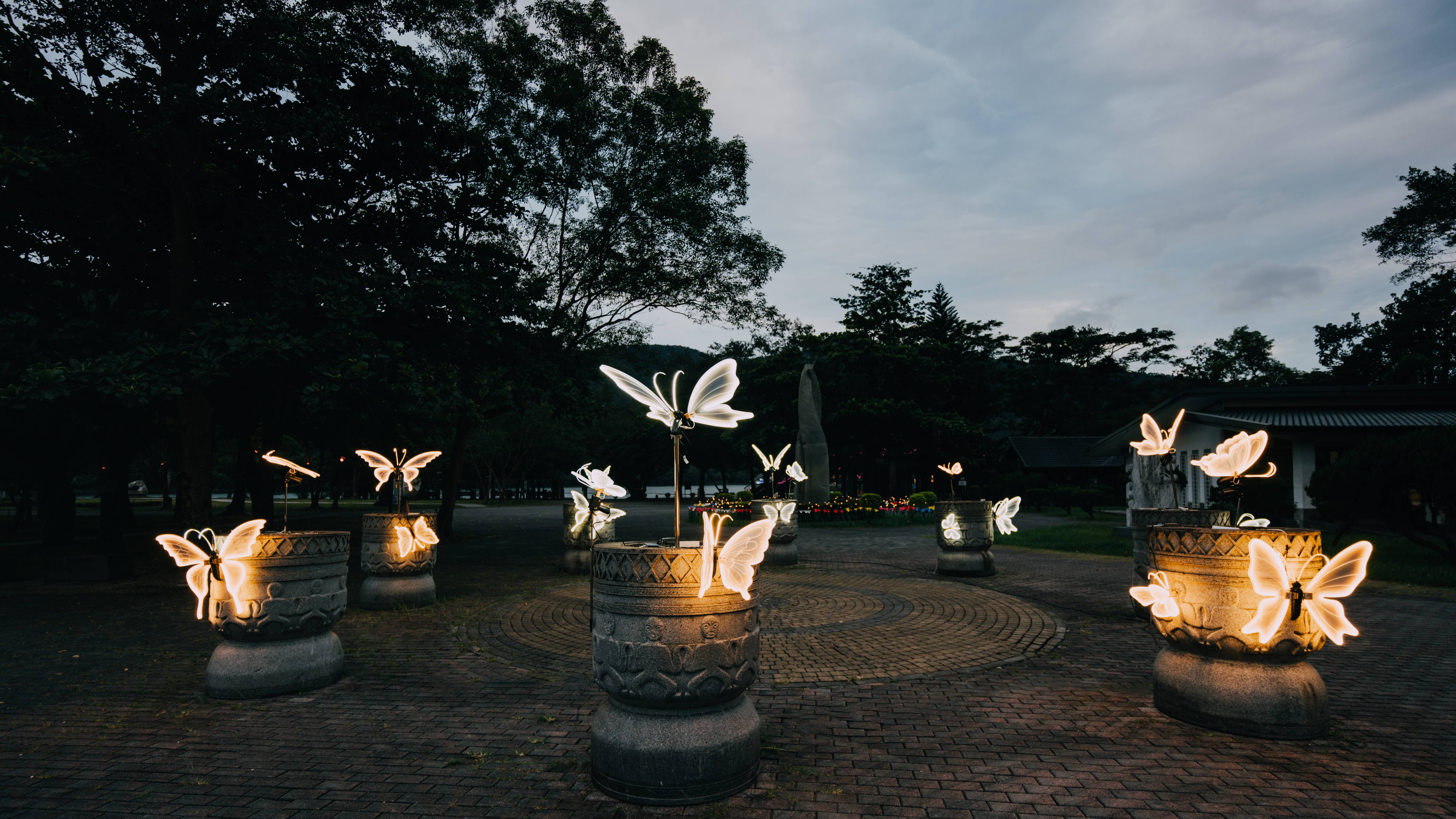 At the entrance, Mountain and Water Welcome Gate greets visitors with blue-lit mountain silhouettes and carp imagery, symbolizing harmony between the region’s landscape and culture. Fluttering Butterflies animates stone pillars with luminous wings, suggesting ecological vitality while guiding guests deeper into the lakeside trail. Fireflies of Summer scatters twinkling lamps across the grass, mirroring the magical presence of real fireflies and evoking a starry meadow. Pink Glow at Liyu Lake bathes the viewing deck in soft hues of pink, offering a dreamlike atmosphere where romance and serenity intertwine.