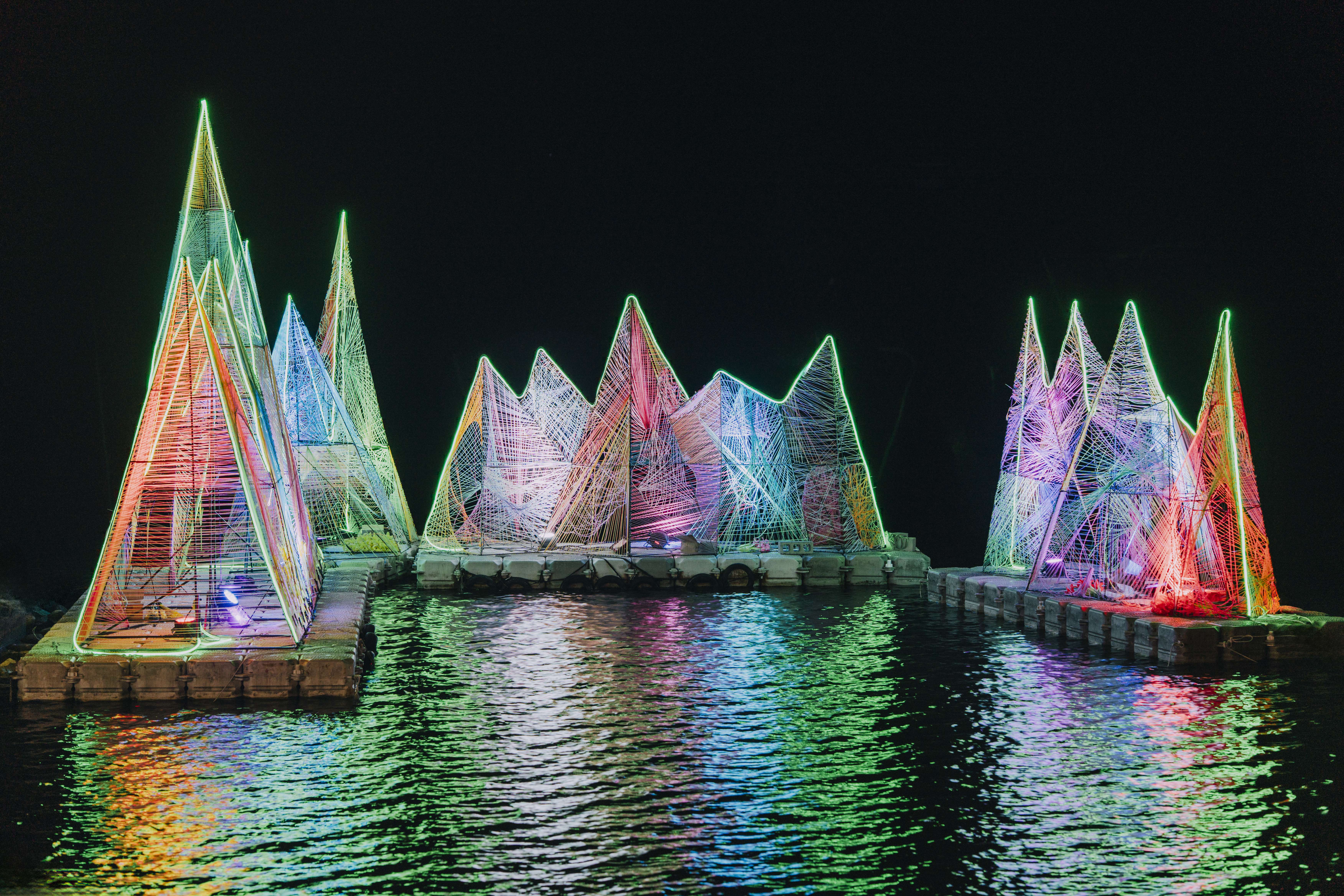 Further along, Blooming Light creates a golden tunnel of illumination, where blossoms of radiance symbolize vitality, renewal, and prosperity for Hualien. Drifting Stroll transforms a pavilion into an underwater fantasy through cool blue tones and bubble-like effects, encouraging playful immersion and moments of tranquility. The journey culminates in Mom, a sculptural installation inspired by mountain silhouettes, interwoven colored cords, and floral lights. It embodies Mother Earth’s embrace, conveying the continuity of life and the protective spirit of the land.