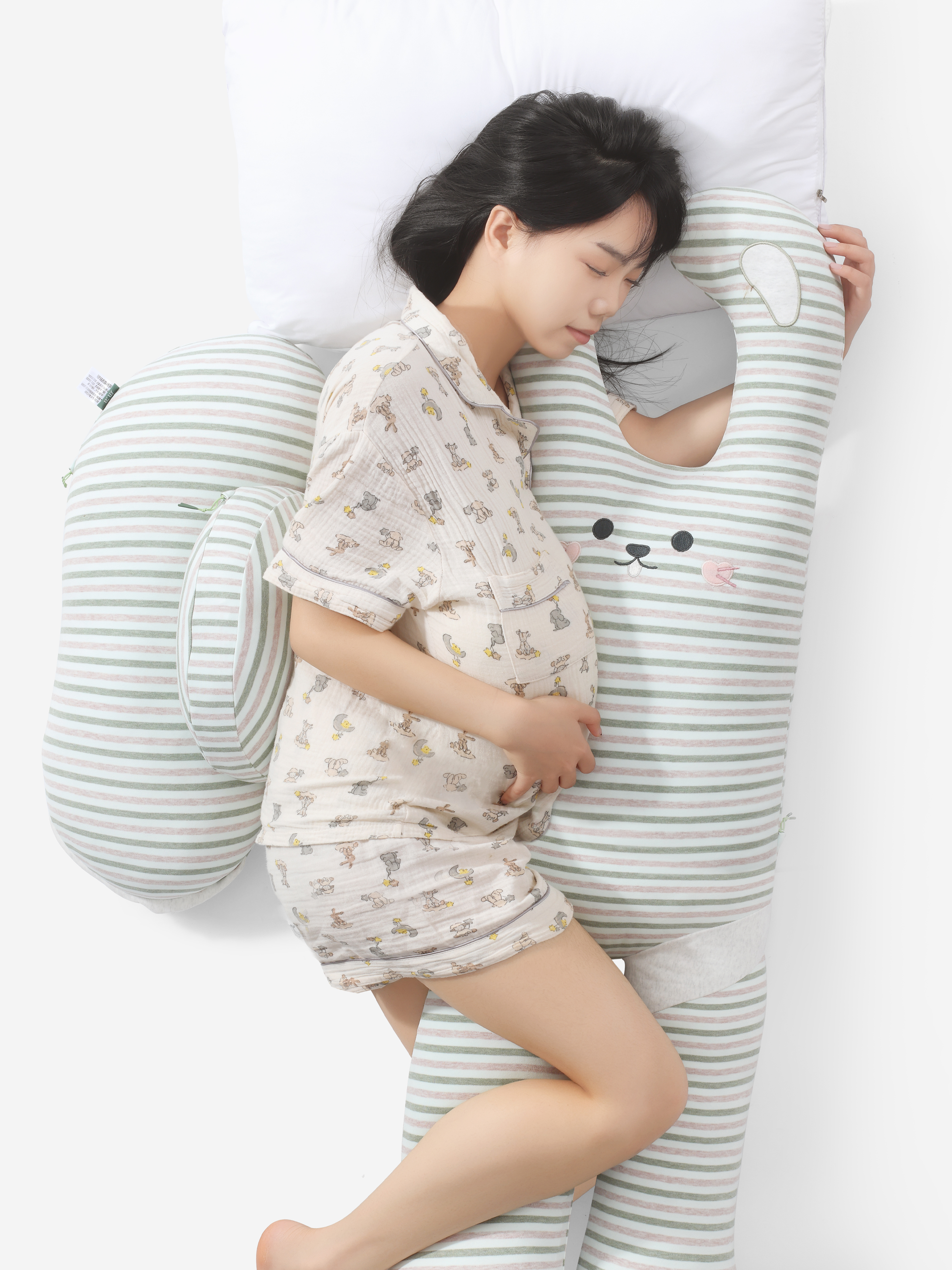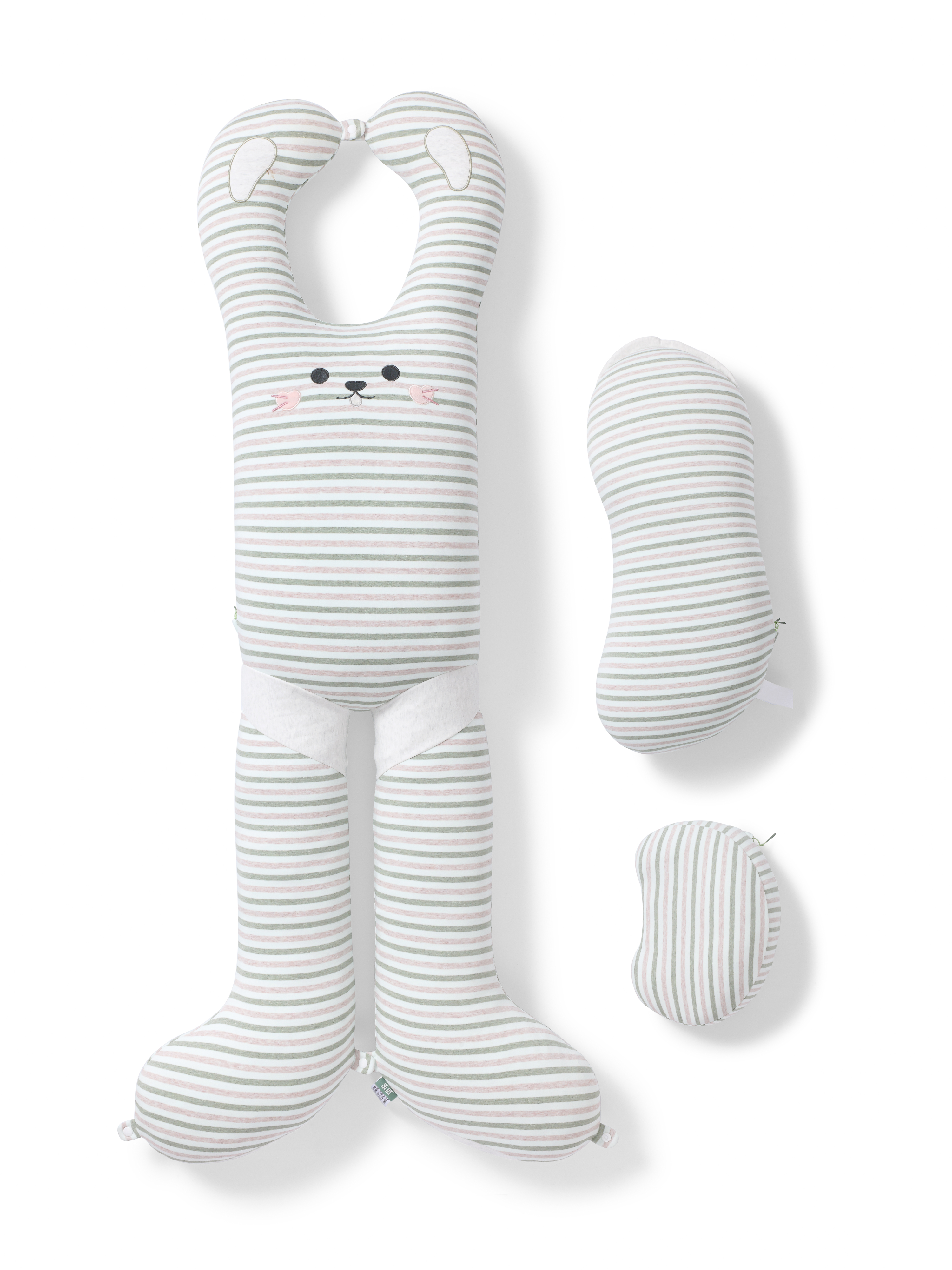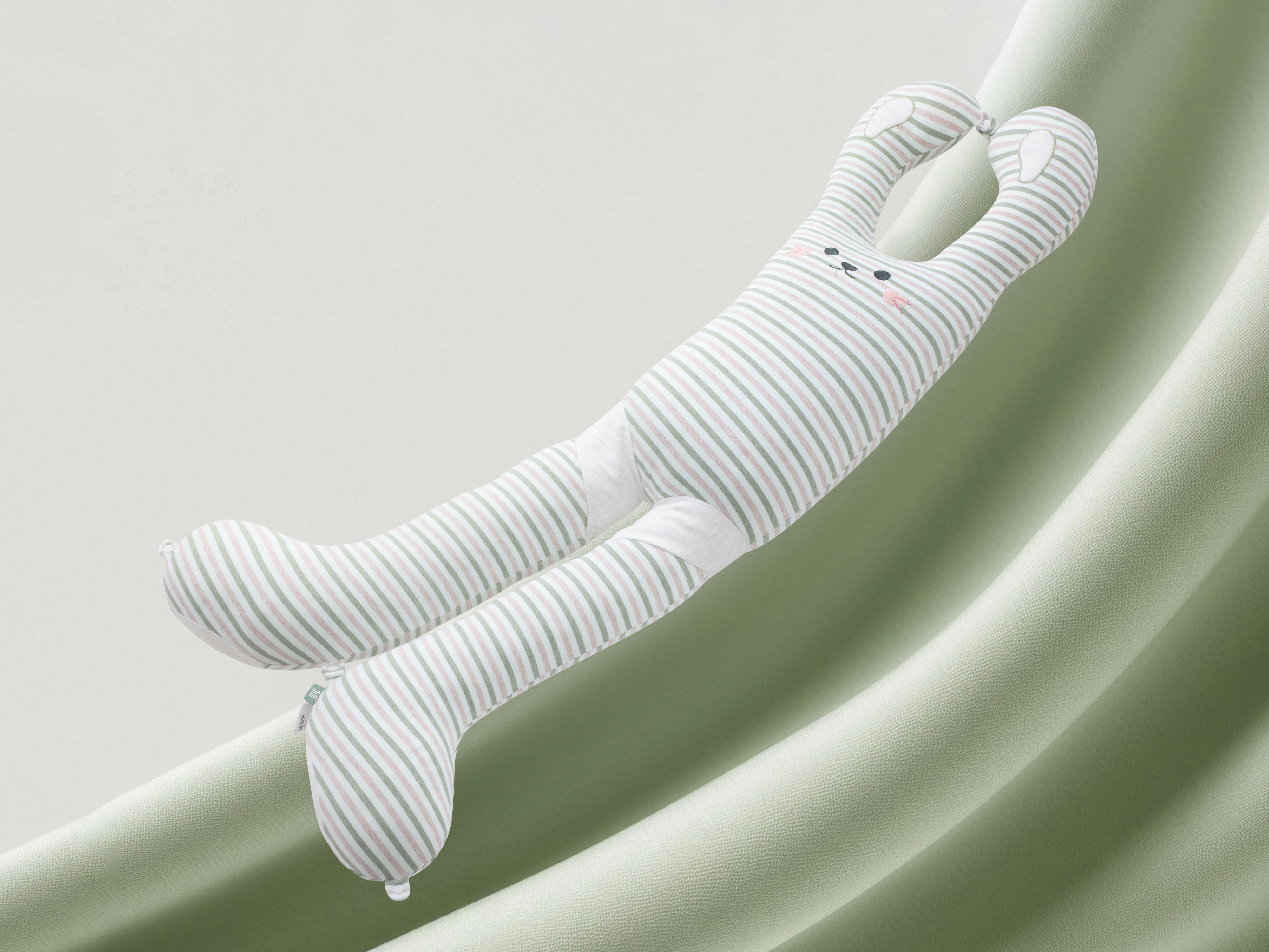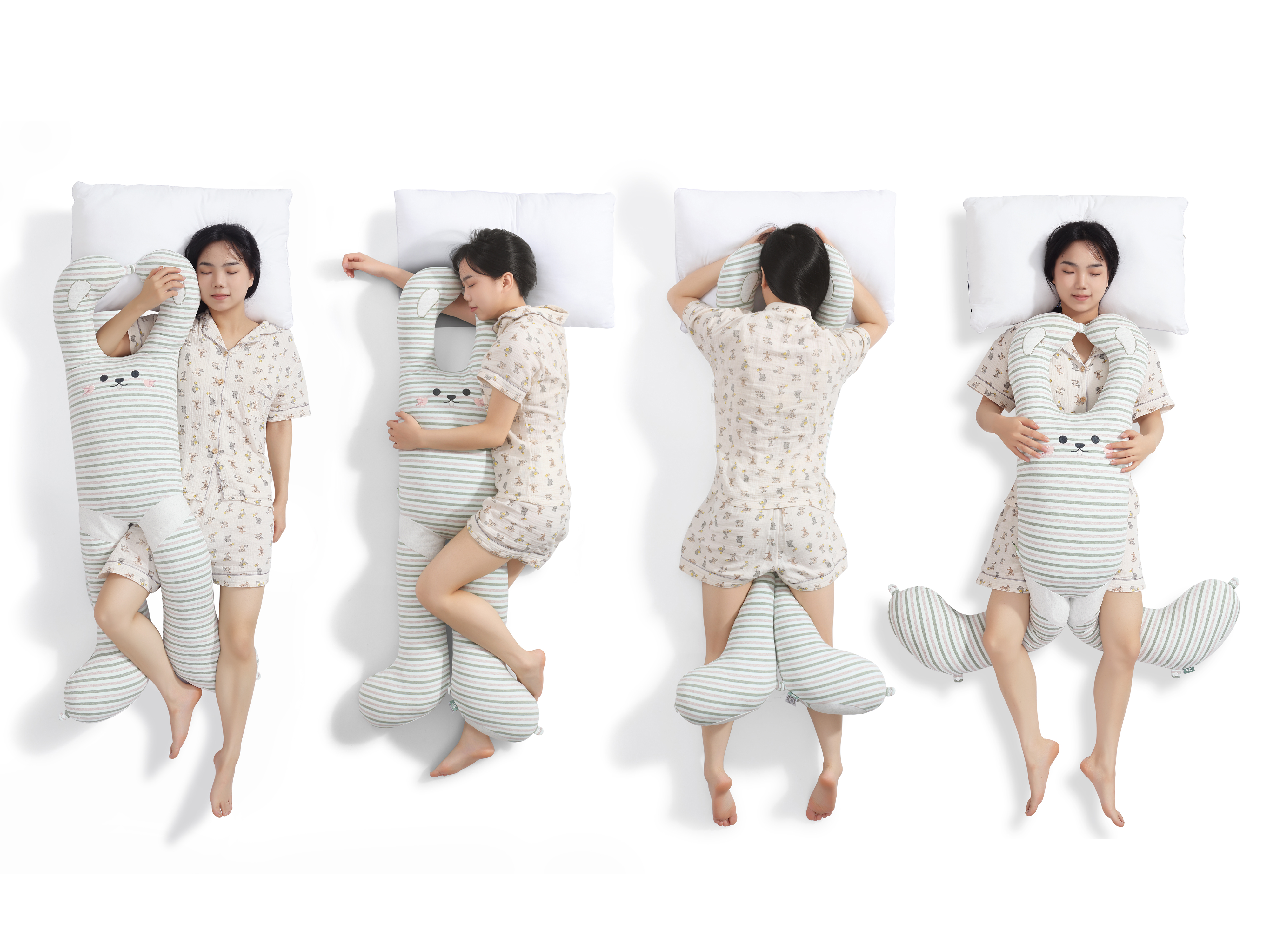 Designed as an innovative connectable bunny, this sleeping body pillow provides comprehensive support for healthy sleep in all scenarios and sleep postures. With snap-button connectors on its paws and feet, it can be easily transformed as needed, serving as a body pillow, hugging cushion, backrest, or prone-sleeping aid to deliver ergonomic support tailored to various postures. Optional small and large support cushions provide targeted relief where needed, such as stabilizing the lower back for pregnant women during side-sleeping or cradling the head and neck for children napping on the stomach. More than just physical support, its charming bunny design brings emotional comfort, blending aesthetics, functionality, and emotional warmth into one thoughtful companion.