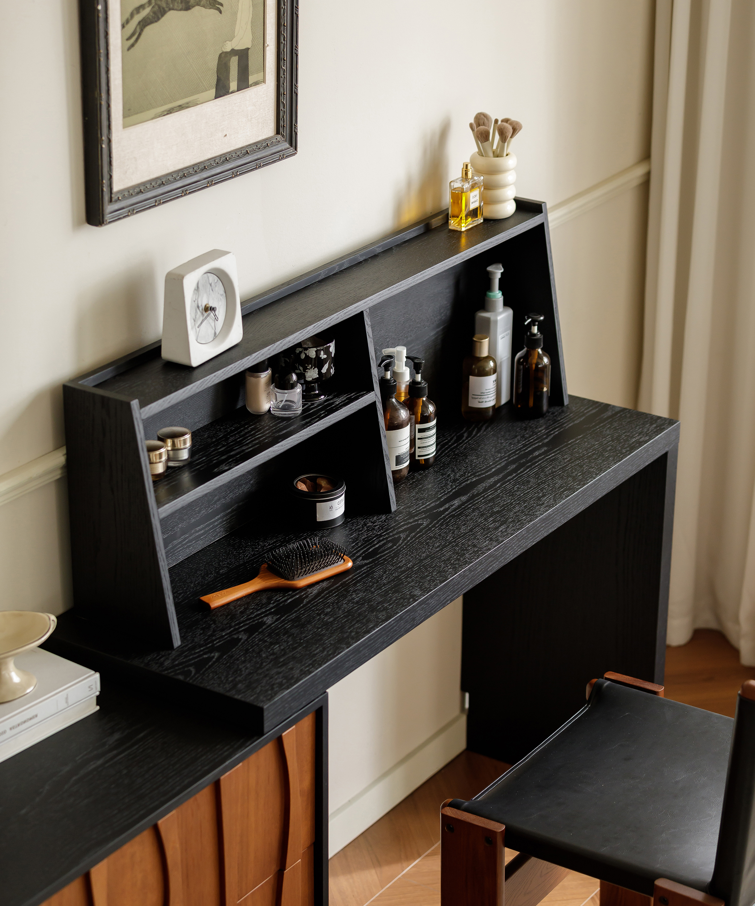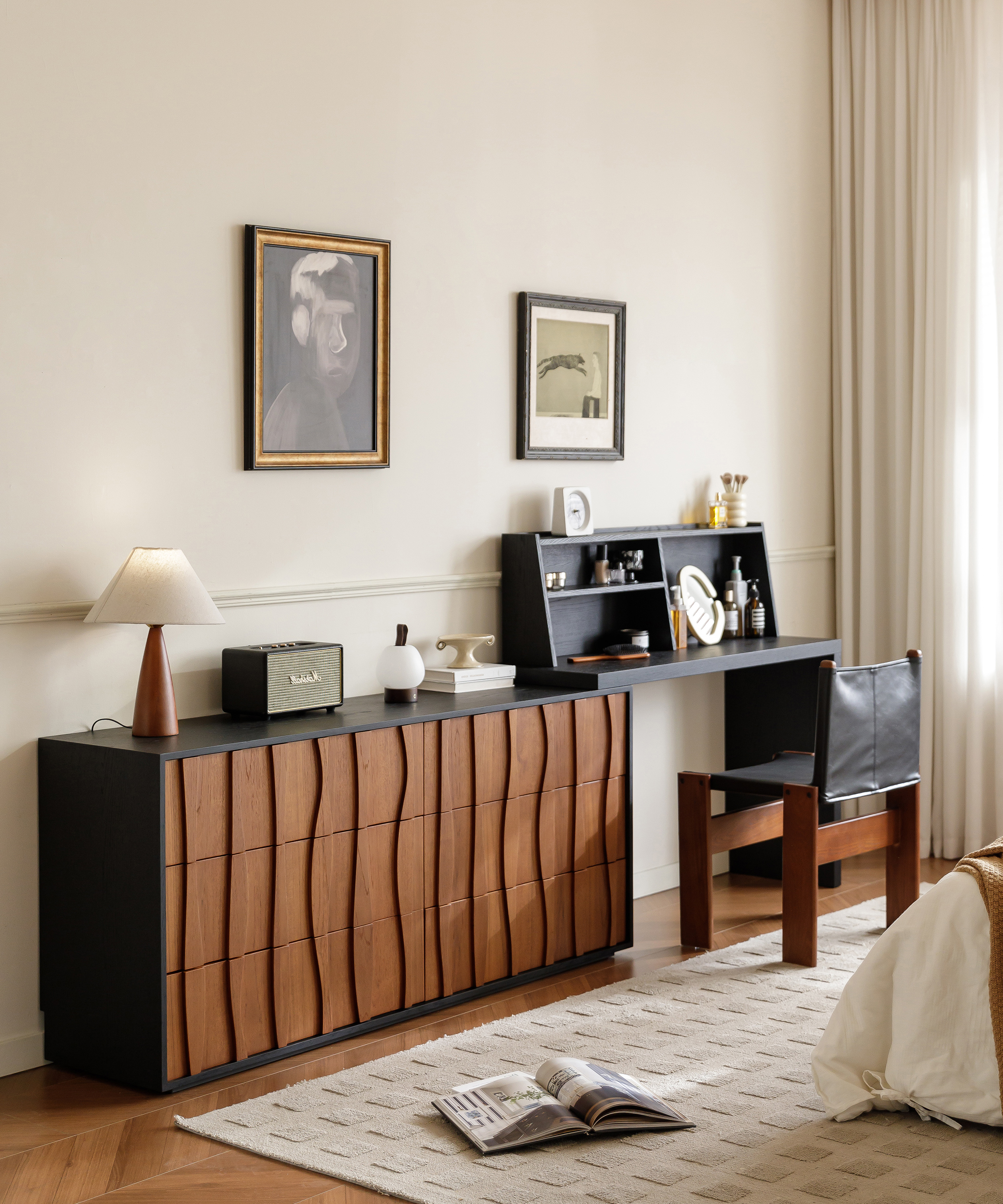 The Chenxi Series comprises sideboards, TV cabinets, dressing tables, and shoe cabinets, drawing inspiration from the breathtaking scene of the sea at dawn: when the sun rises over the horizon, gentle breezes ripple across the waves and the water shimmers under the sun, casting a scene as poetic and picturesque as a painting. Symbolizing beauty, the morning tide inspired the design team to translate such beauty into vintage-style furniture. That’s how the series is created.