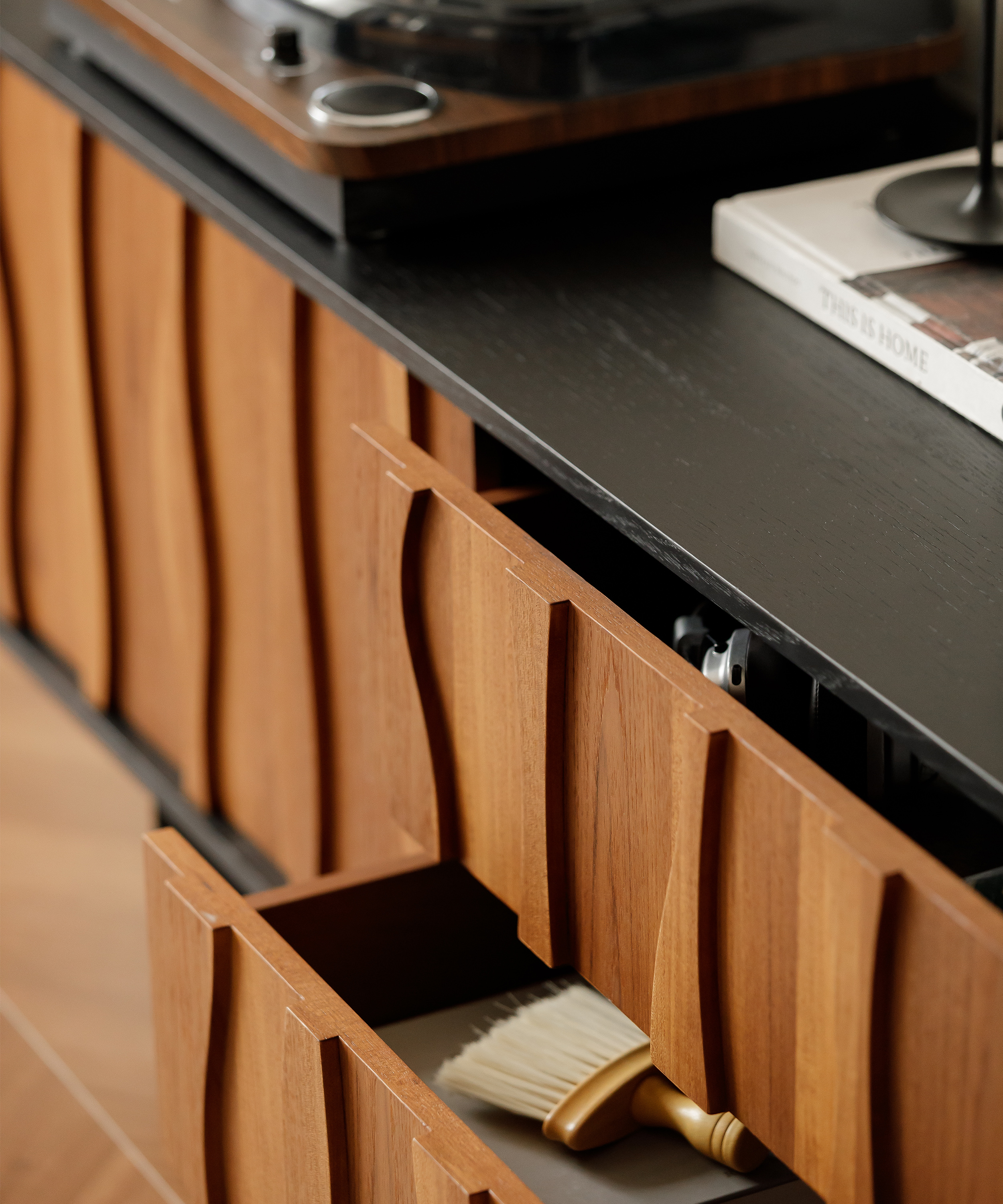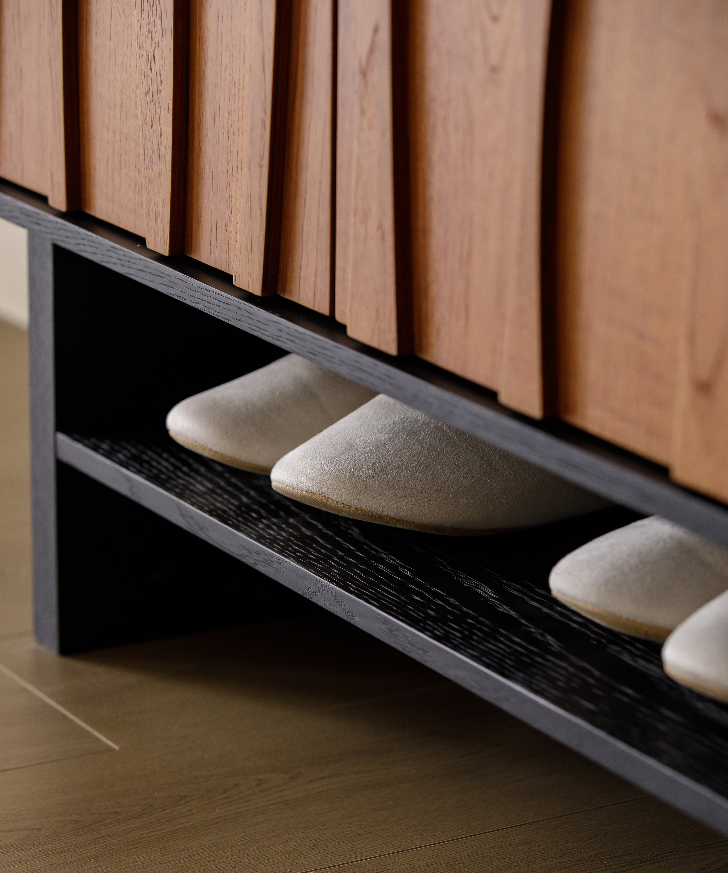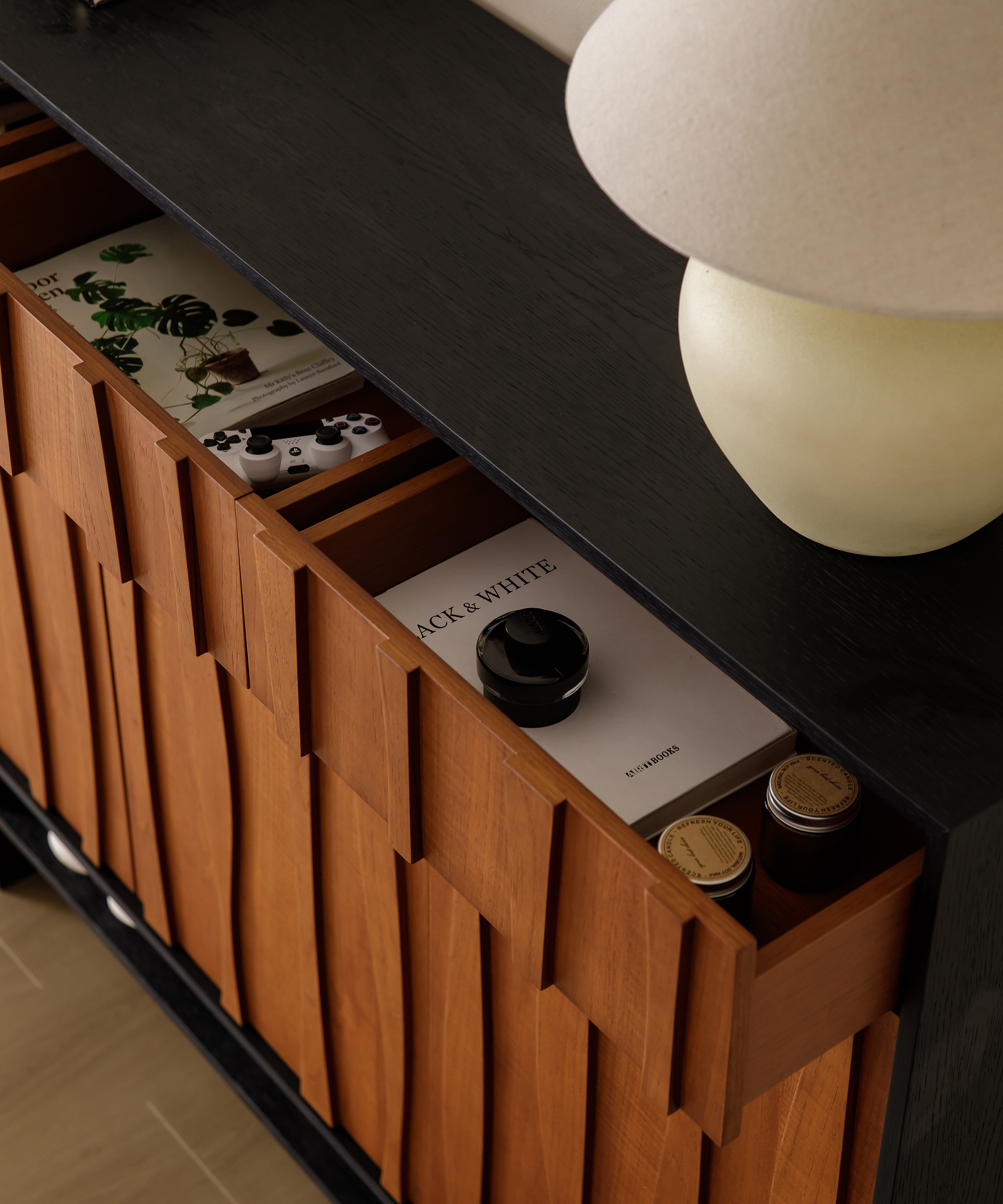 This furniture series provides generous storage space, with shelves inside the cabinets that can be easily adjusted to fit items of different sizes. Every piece is crafted with meticulous attention to detail. It features a matte finish that shows the natural grain of the wood, conveying understated elegance and premium quality. It is crafted using a direct-to-substrate veneering process, with Grade-A Burmese teak for the mid-century toned panels and imported white oak solid veneer for the black sections. All veneers are AAA-grade, 0.5 mm thick, precision-joined with advanced machinery. The seams are carefully finished with sanding and brushing to bring out the natural wood grain. Edged with 0.8 mm natural wood veneer using PUR glue, it ensures strong adhesion, water resistance, and moisture resistance. Top-grade, formaldehyde- and benzene-free Chinese Fushen water-based adhesive is used, achieving a D3-level water resistance. Meanwhile, all hidden surfaces are carefully finished with no raw wood exposed. The inner drawer frames are made of teak-colored multilayer lacquer-free solid wood panels. The surface is coated with high-end, scratch-resistant formaldehyde- and benzene-free water-based lacquer from Zhanchen, whose self-repairing and heat-resistant properties keep the cabinet looking as flawless and new as the day it was finished, creating a high-quality home living experience.