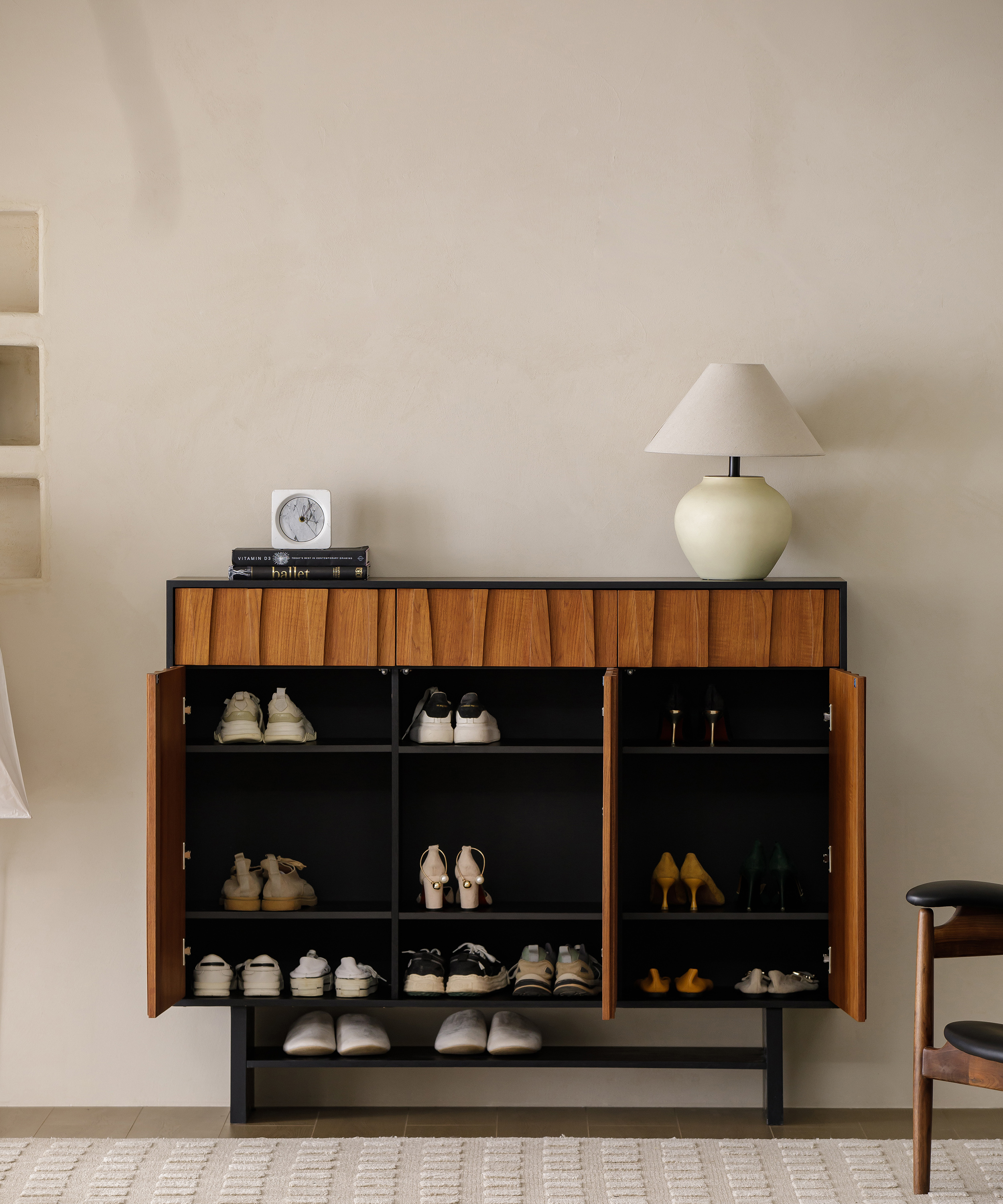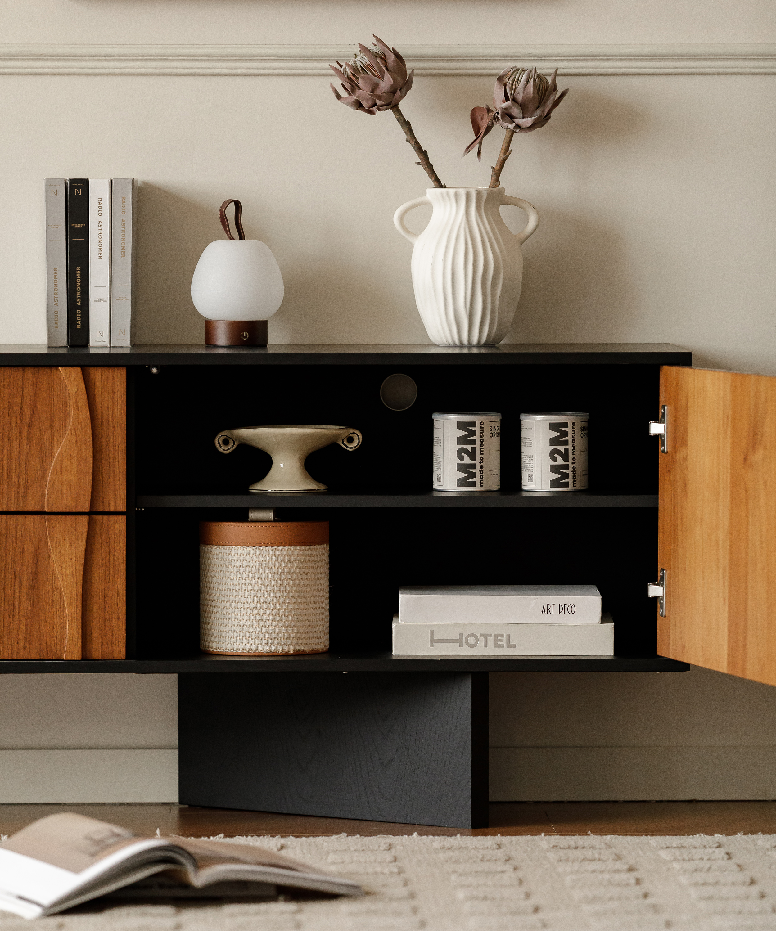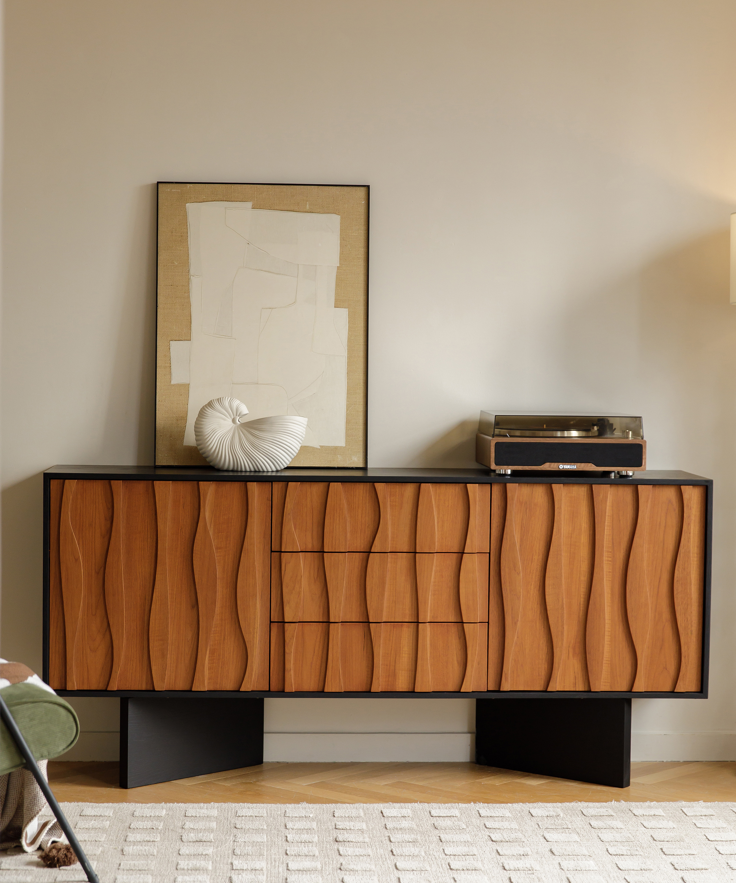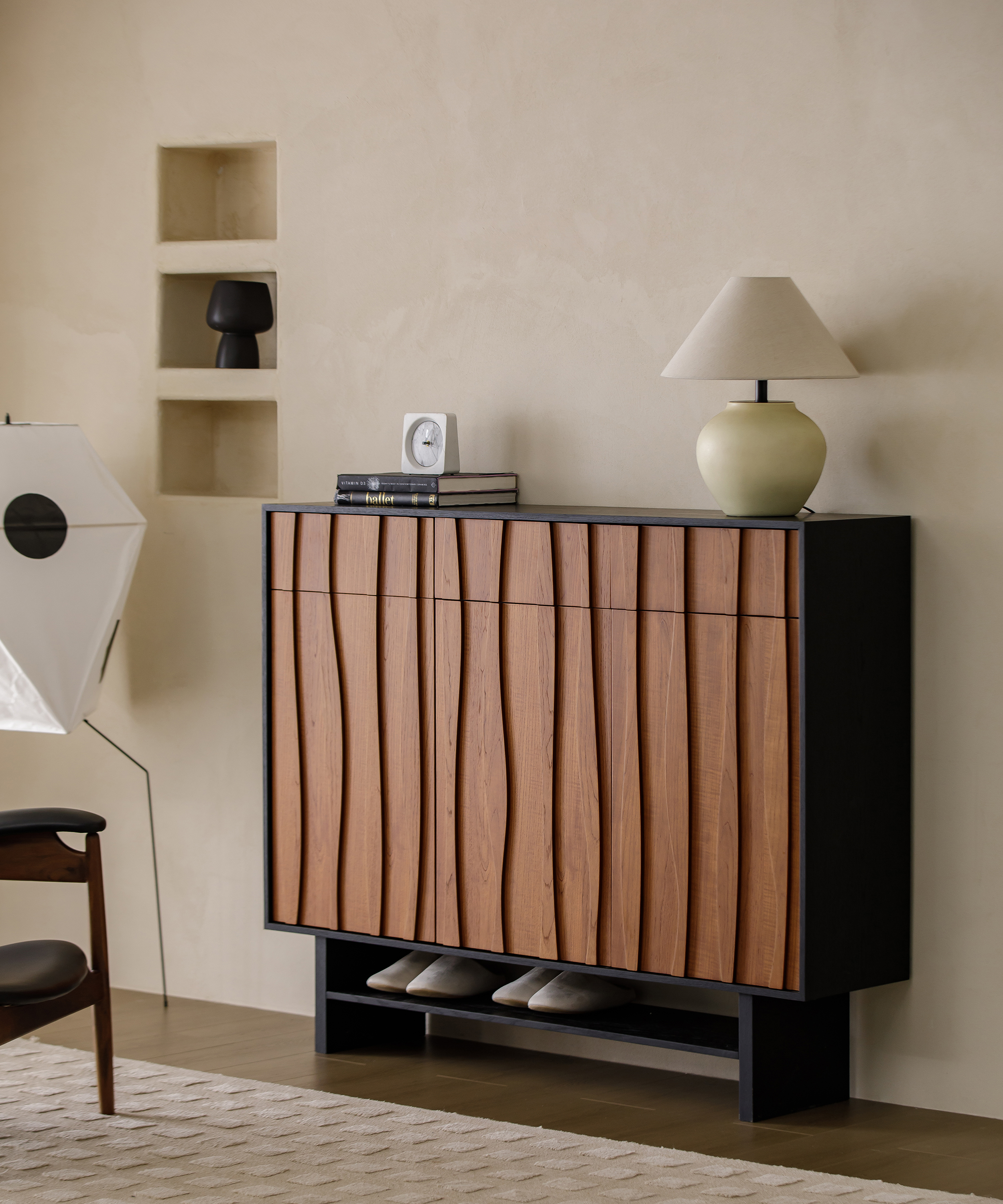 The series pairs black frames with Burmese teak surfaces, whose natural warmth and vintage charm make each cabinet look like a framed painting. The outward-angled legs add artistic elegance and come with an optional pedestal base. The teak surfaces are shaped to mimic the tide shimmering under the rising sun, giving the furniture a poetic and distinctive character.