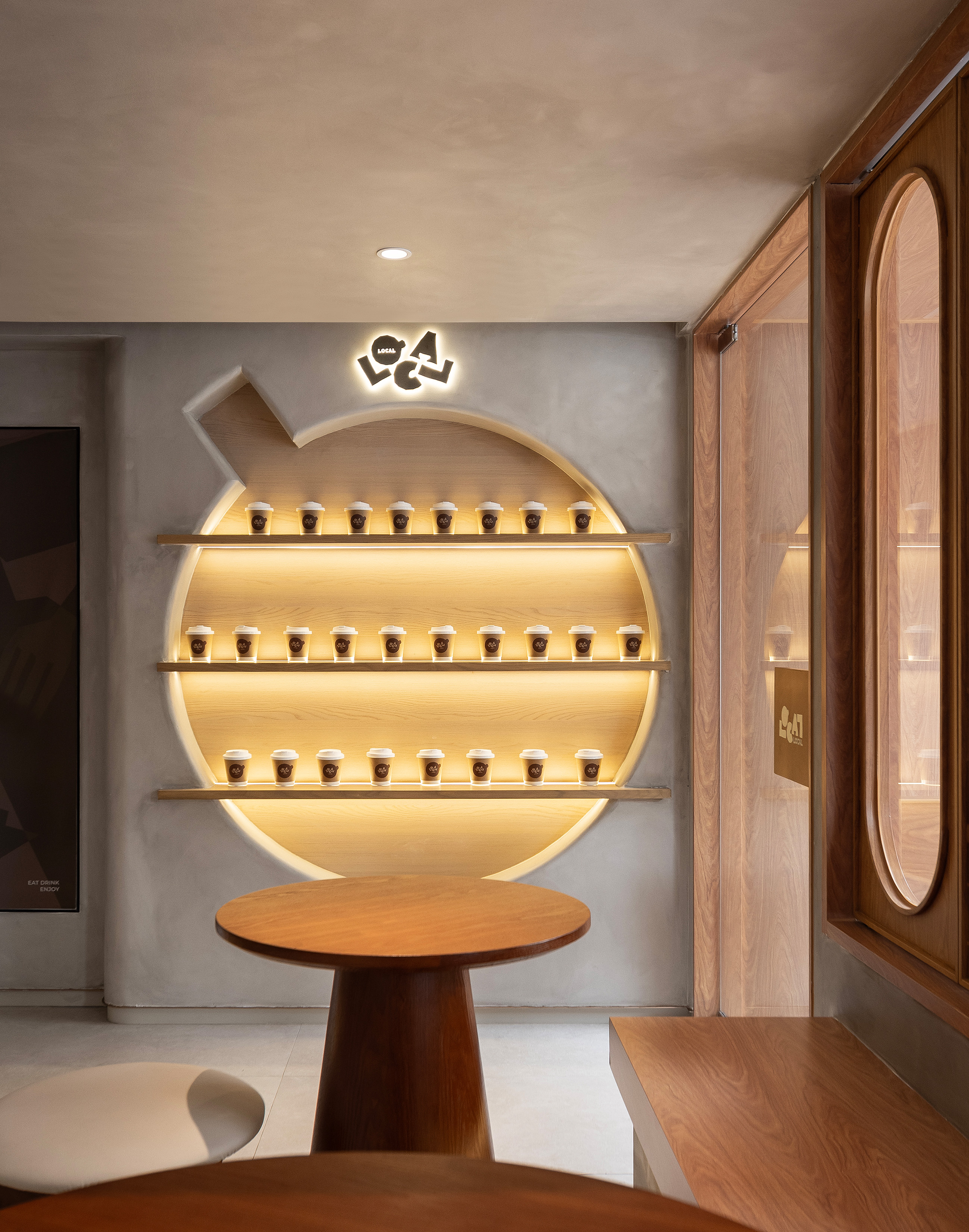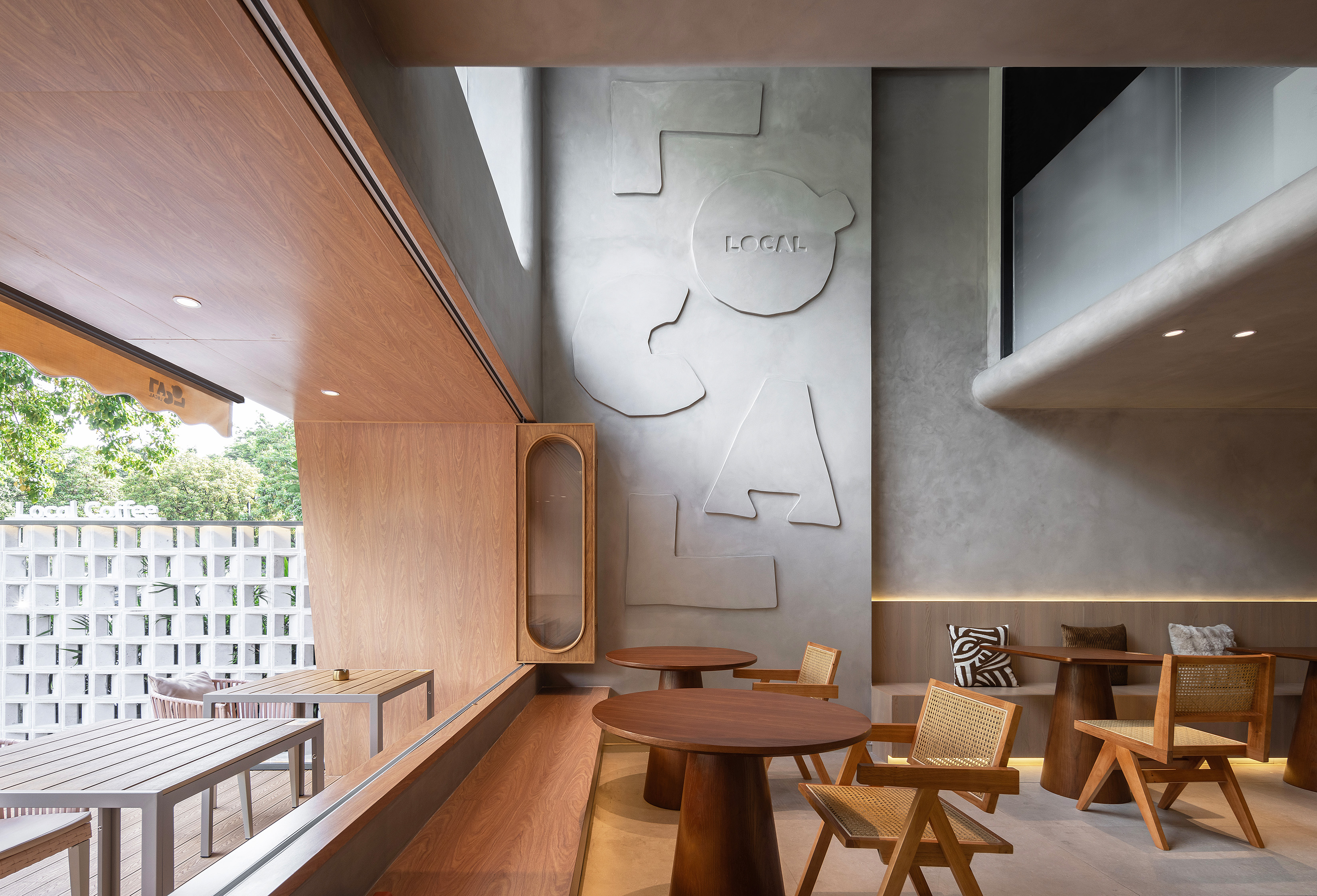 Materiality grounds the space in a natural, tactile aesthetic. Cement-textured paint and warm wood tones form the foundational palette, establishing a serene daytime ambiance. As evening descends, a dynamic, programmable lighting system transforms the environment, immersing it in the sophisticated and intimate mood of a bar.