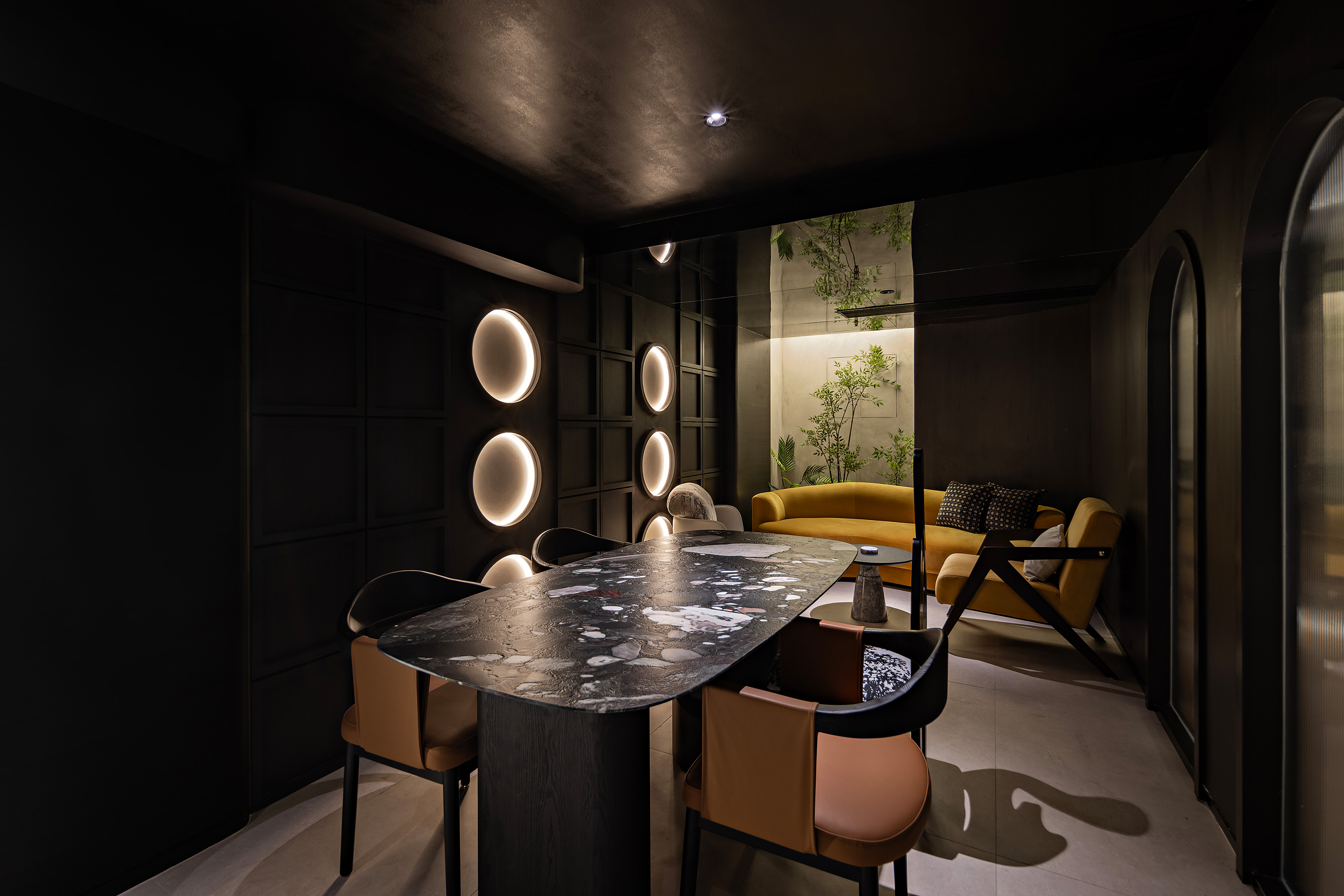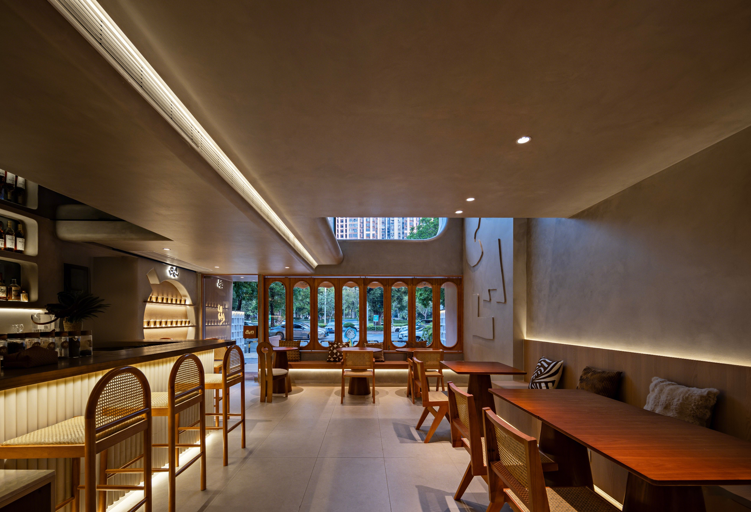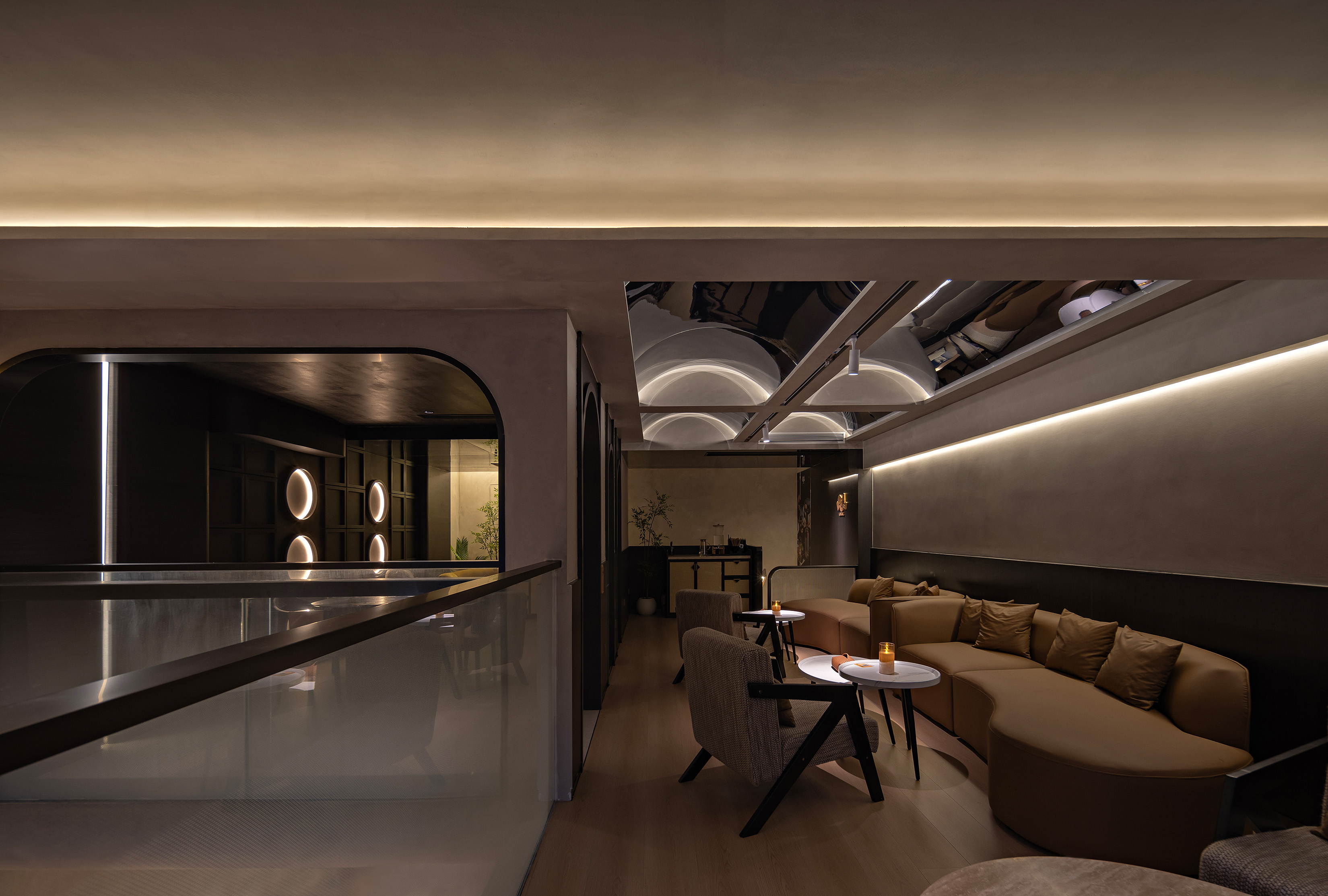 The architectural intervention involved a strategic modification of the original two-story structure. A section of the second-floor slab was removed to create a double-height void, enhancing visual connectivity, spatial permeability, and an overall sense of expansiveness. The ground floor is centered around a central bar and casual seating, fostering an open and social atmosphere. The upper level accommodates private rooms and booth seating, catering to diverse needs.