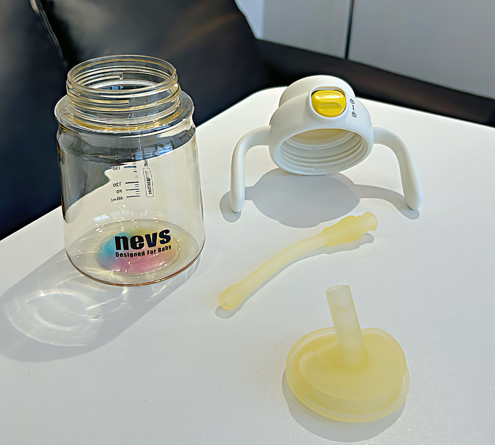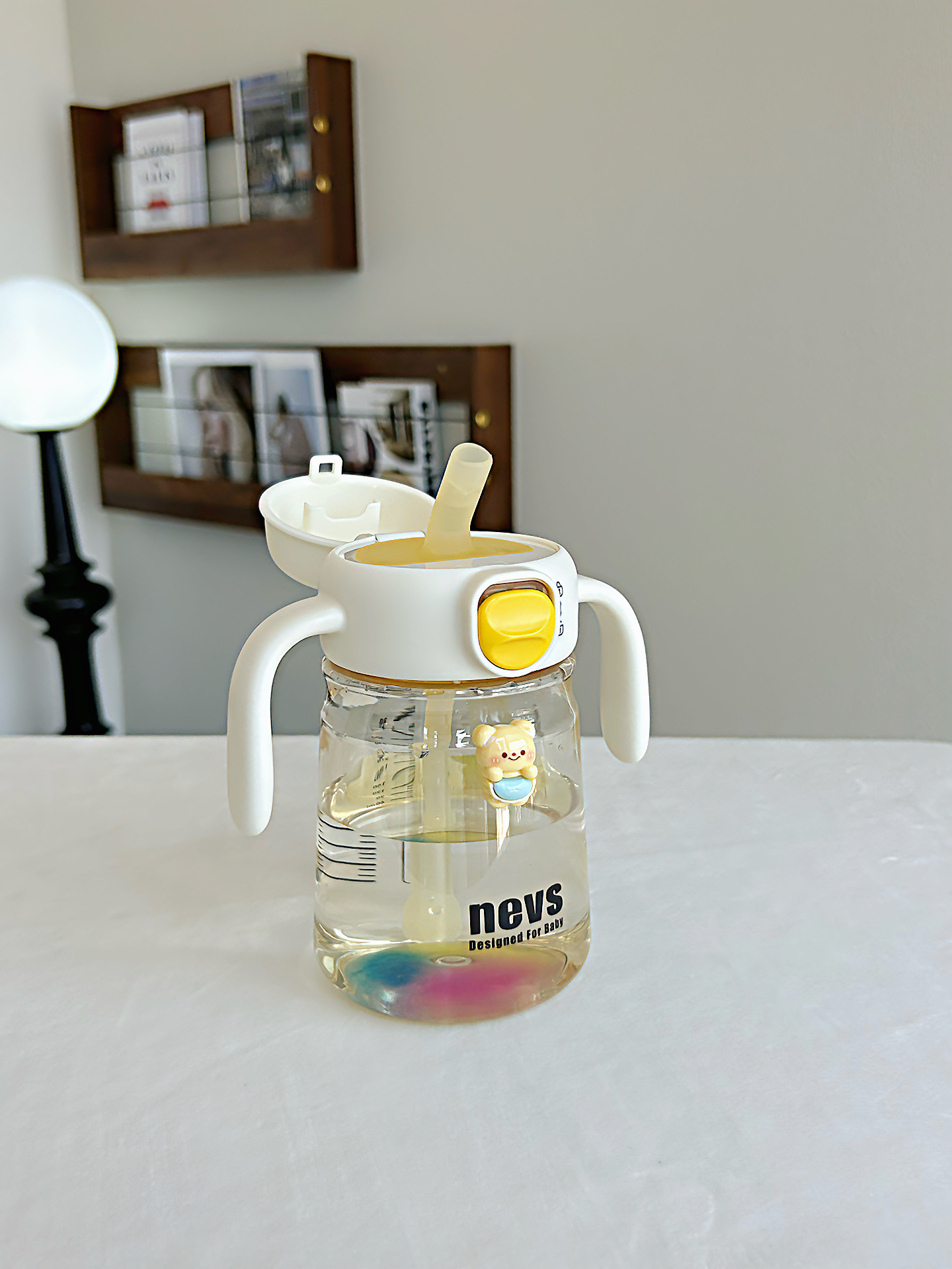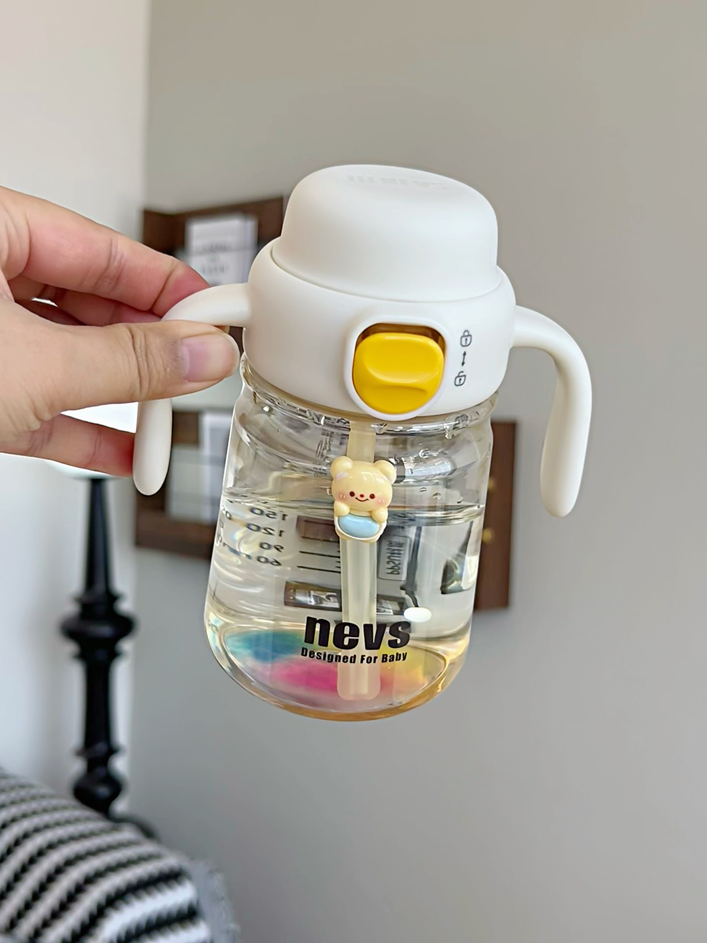 This children's water cup takes "safety and playfulness" as its core. The cup body is made of food-grade PPSU material, with a thickened design that makes it shatter-resistant and odor-free. The cup lid features a one-click pop-up spout, which keeps the spout dust-proof and prevents the lid from getting lost; meanwhile, a leak-proof lock is installed to avoid accidental activation. The spout is angled at 45 degrees, matching the grip curve of babies aged 6 months to 3 years. The outer bottom of the cup is covered with heat-transferred patterns of vegetable oil. When filled with water, due to light refraction, the rainbow on the cup bottom is reflected onto the water surface, creating a beautiful and colorful light effect. This not only makes the cup highly attractive but also adds fun to drinking, encouraging babies to drink more water.