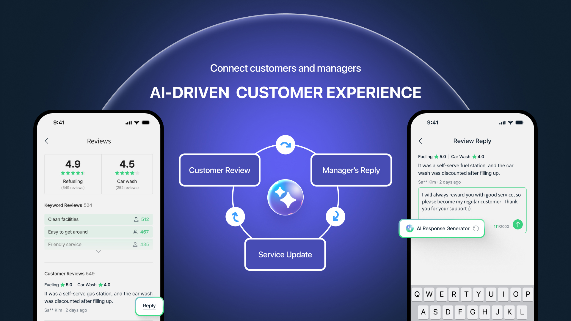 For added convenience, Energy Plus shows real-time prices of nearby stations and integrates with navigation apps for seamless route planning. It also uses generative AI to analyze customer reviews, creating station personas that highlight each location’s unique strengths. When responding to these reviews, station managers receive context-aware reply suggestions, enabling faster responses and fostering stronger connections with customers.