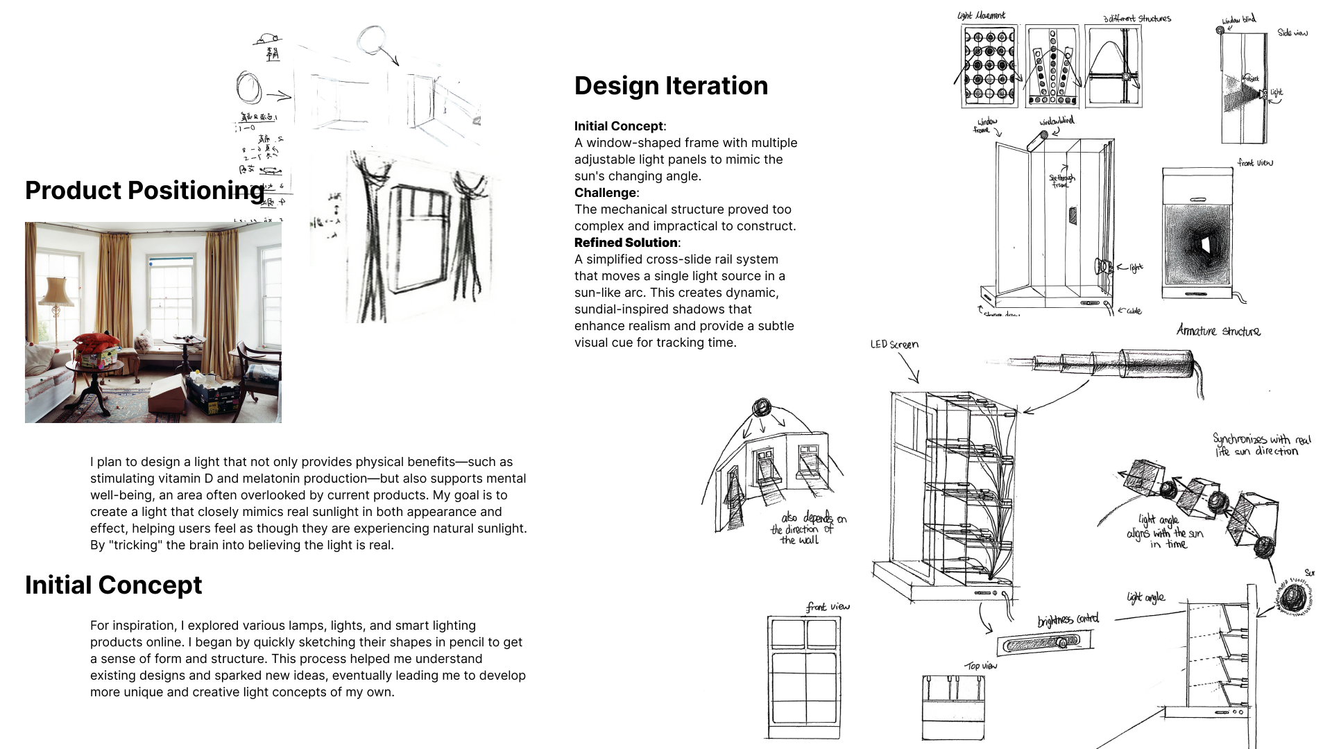 Lumen Rise is a personal wellness lamp that brings the full spectrum and dynamic qualities of natural daylight indoors. Designed for sun-deprived spaces, it uses bio-mimetic technology to deliver light frequencies that support Vitamin D and melatonin production. By convincing both the body and mind that it is under a real sky, it effectively boosts energy, focus, and mood, transforming any room into a revitalising sanctuary. I plan to design a light that not only provides physical benefits—such as stimulating vitamin D and melatonin production—but also supports mental well-being, an area often overlooked by current products. My goal is to create a light that closely mimics real sunlight in both appearance and effect, helping users feel as though they are experiencing natural sunlight. By "tricking" the brain into believing the light is real. This product is specifically designed to address the ongoing challenges related to limited natural light in living spaces. It aims to meet the needs of specific user groups—such as shared rental homes, cage homes, and apartments that lack sufficient sunlight exposure—by providing an effective and accessible solution to improve their overall living environment and well-being. This product includes features such as adjustable light colour and angle, along with a specially designed sunlight-mimicking mode that promotes the natural production of melatonin and vitamin D—offering both functional flexibility and health benefits.