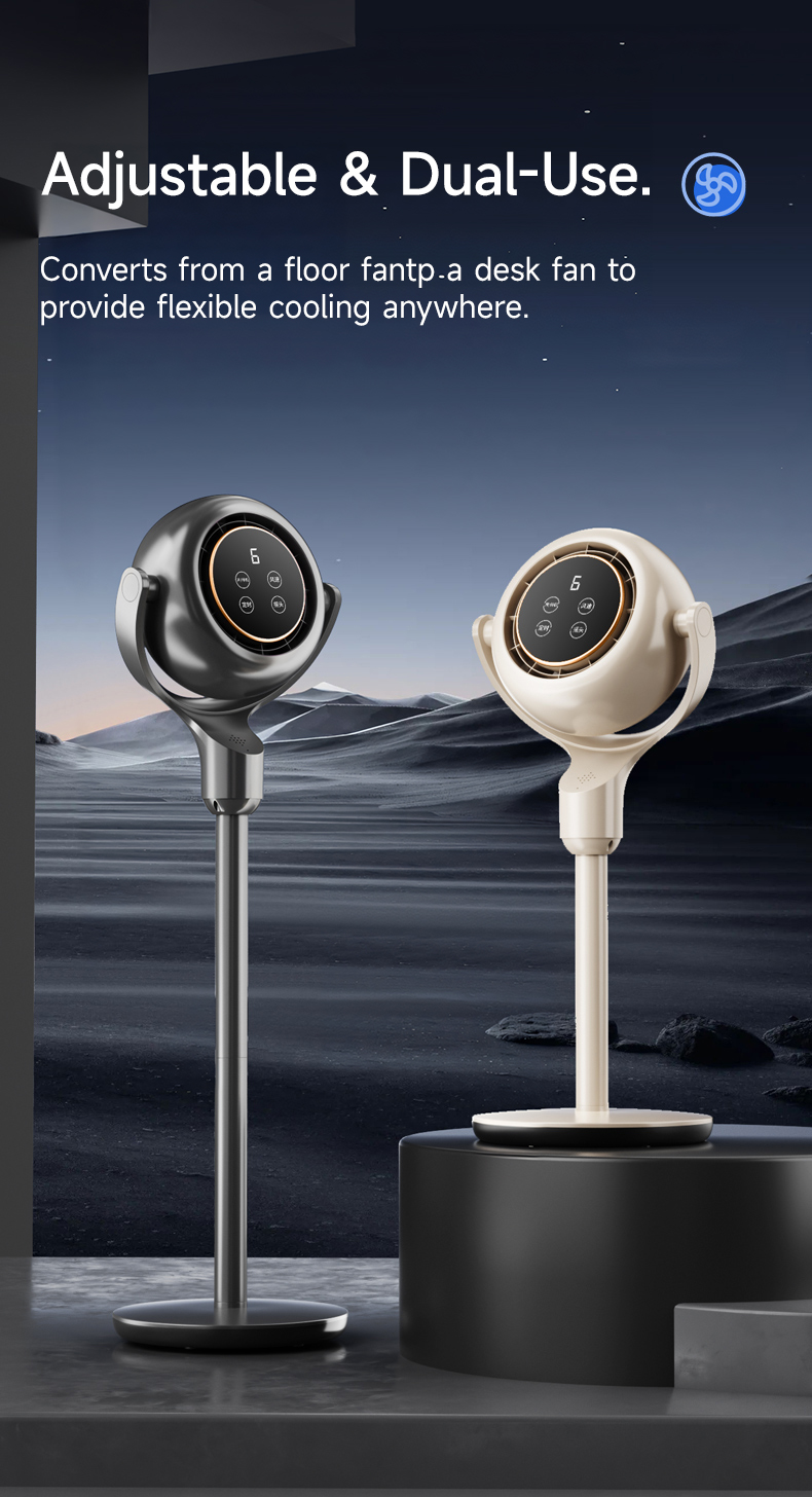 The integrated AI Climate Companion learns user habits and syncs with air conditioning to rapidly homogenize room temperature, eliminating cold and hot spots. Offering six precise speed settings and a 3D Gentle Circulation mode, it delivers power with poise—from a gentle caress to a powerful revitalizing breeze, all with a whisper-quiet operation.