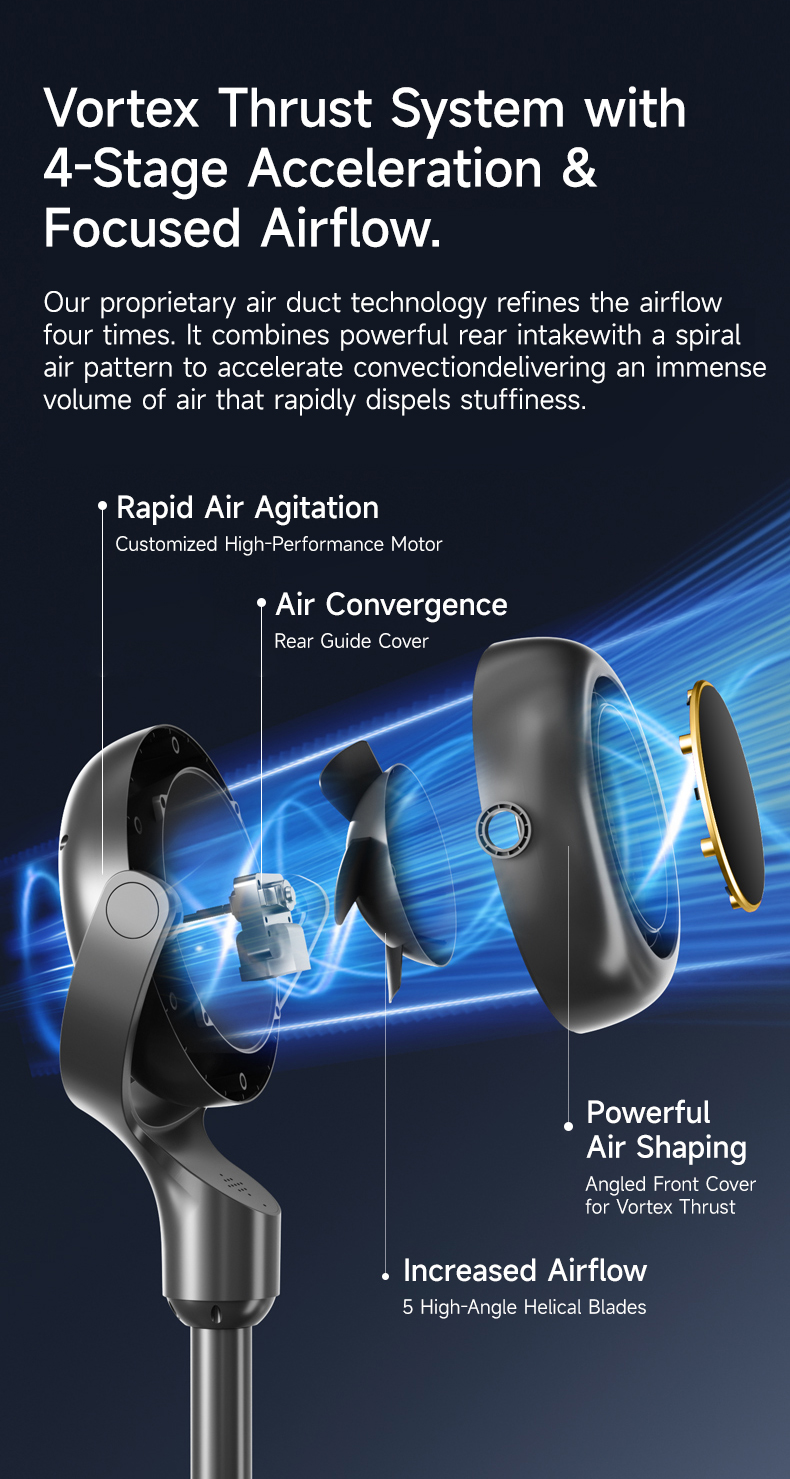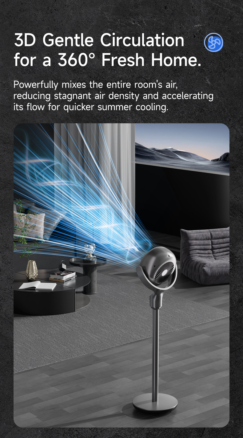 Its core innovation lies in the Vortex Flow Projection System. Inspired by aerodynamics, this technology, combined with a 4-Stage Acceleration Channel, projects a cohesive column of air that breaks down stagnant zones and activates the entire room’s atmosphere for true whole-air cycling.