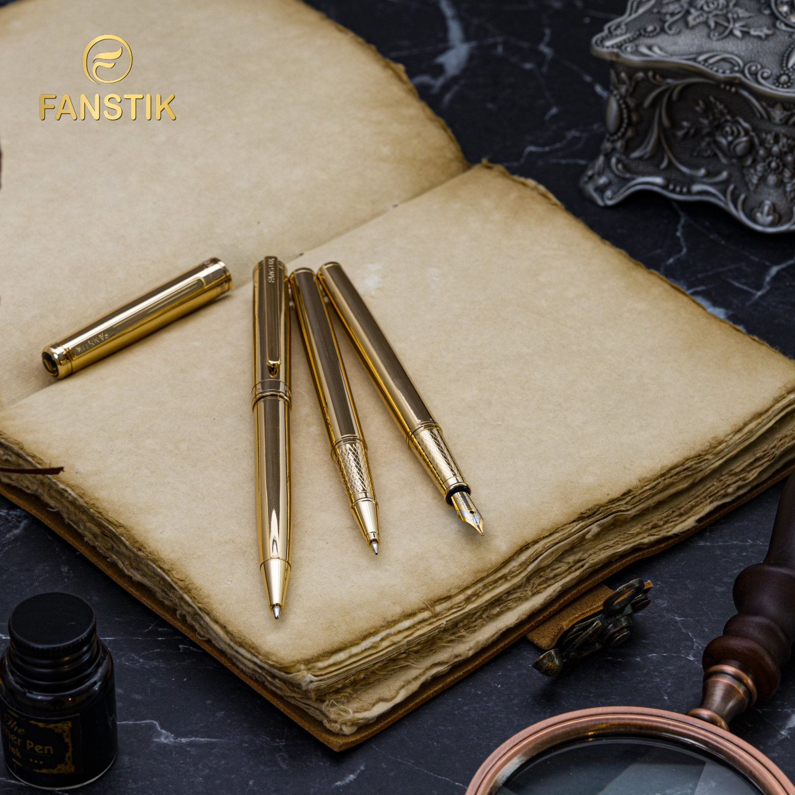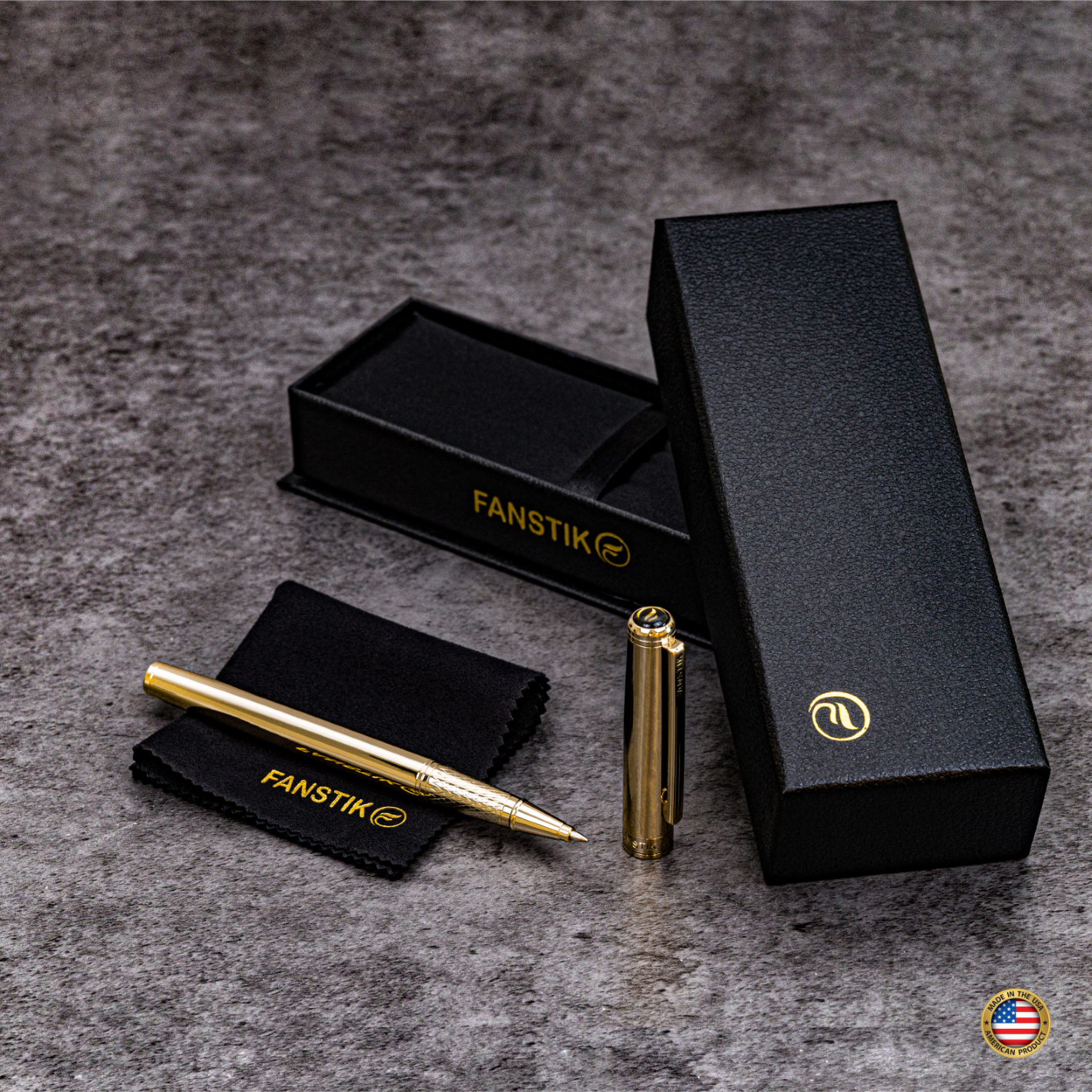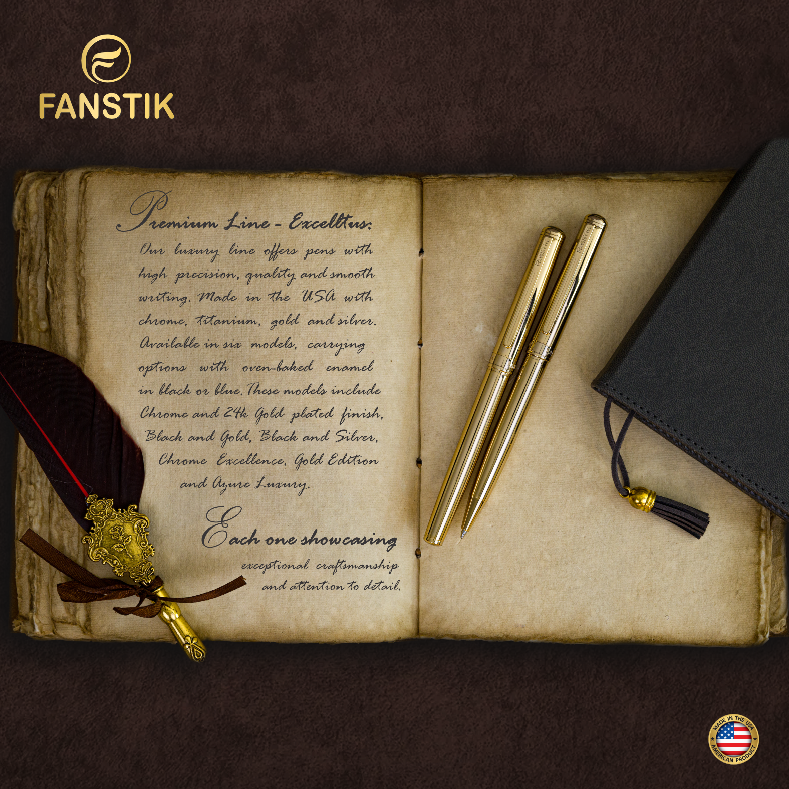 Luxury Gold RollerBall Pen Fanstik Excelltus Line, is a luxury collection of precision-crafted pens designed for smooth, refined writing. Made in the USA with chrome, titanium, gold, and silver, each of the six models showcases exceptional craftsmanship and detail. Finishes include 24k gold plating, black or blue oven-baked enamel, and elegant combinations like Black & Gold, Chrome Excellence, and Azure Luxury. This line celebrates timeless design, premium materials, and the art of writing elevated to its finest form