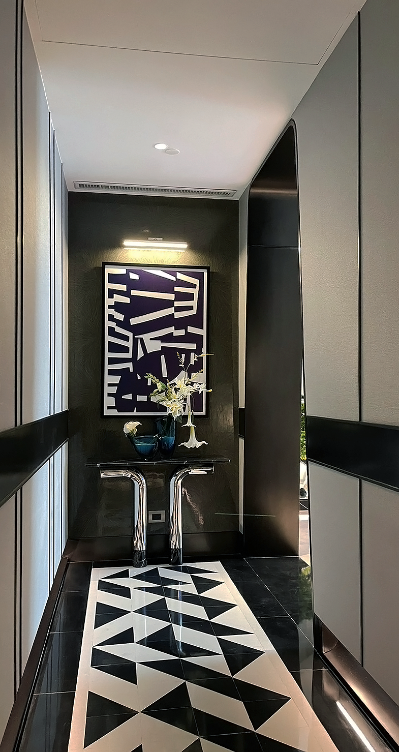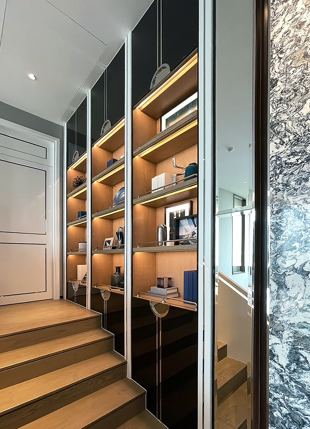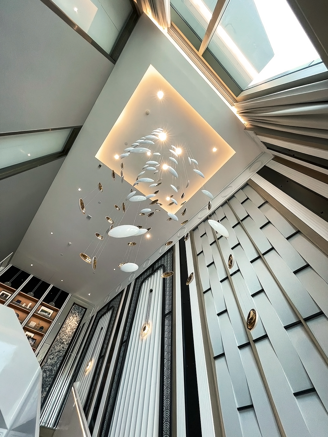 Every design element was carefully curated to express this narrative. A sculptural chandelier suspended in the main living area evokes the image of air bubbles rising through water, while the custom wall panels feature soft, streamlined curves reminiscent of a yacht’s elegant structure. The carpet pattern subtly mirrors rippling waves, enhancing the sense of motion throughout the space. Together, these elements create an atmosphere that is both dynamic and tranquil.