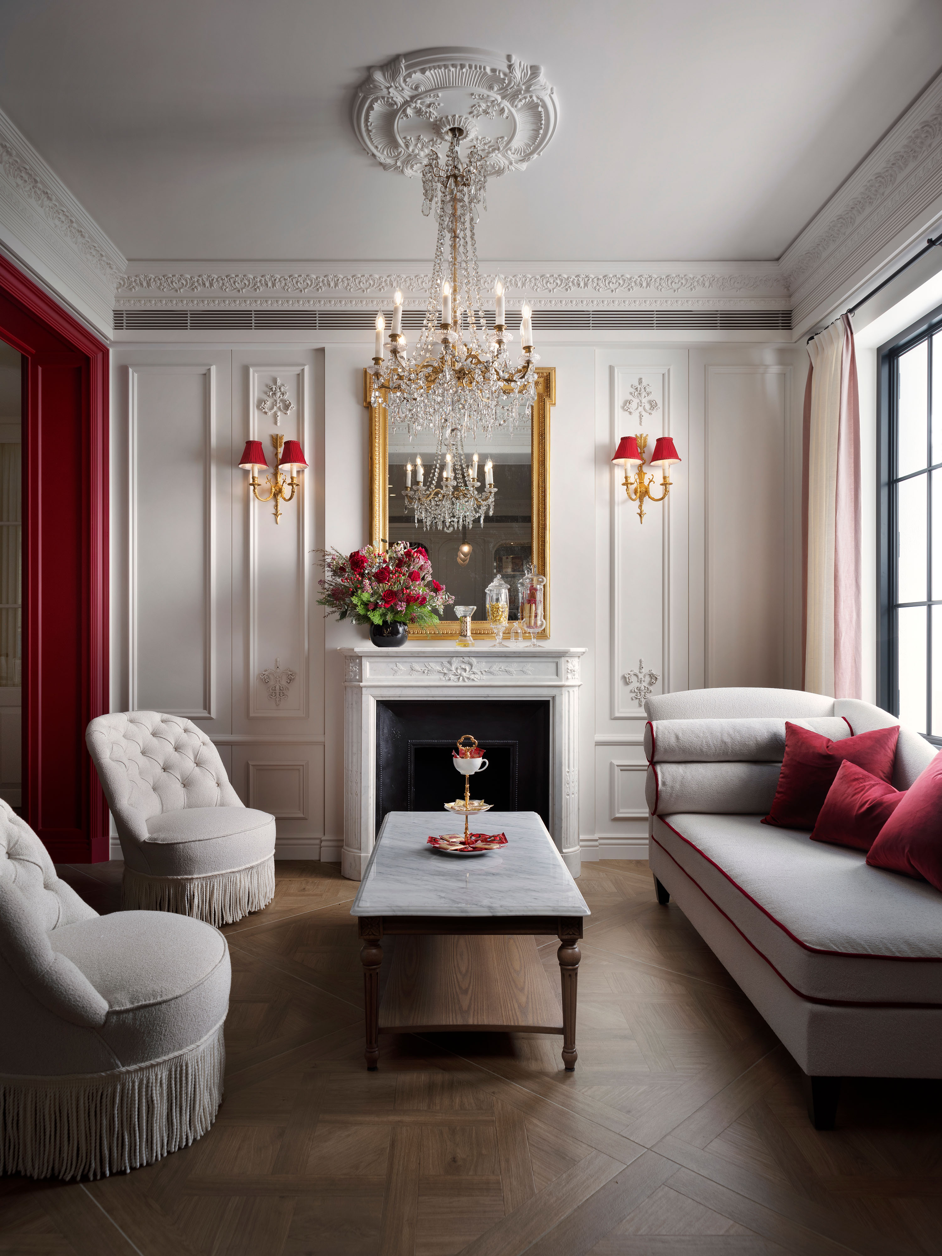 This project uses large expanses of pure white moldings and classical carvings as an elegant foundation. Within this clean, understated backdrop, the brand's featured red appears at key points, such as the doorframes and the sofa. Behind the reception counter, the display area adopts vintage-style mirrors with traces of time. Symmetrical shelving stands at the centerline, creating a sense of ordered beauty reminiscent of a French palace. The setting performs an antique focal point where time flows backward and echoes the classical French aesthetic of the entire space. Through the purity of white and the romance of red, the design transforms the brand spirit into a tangible experience. Customers immerse themselves in a joyous atmosphere, and the refined yet restrained spatial quality leaves a lasting, profound visual impression.