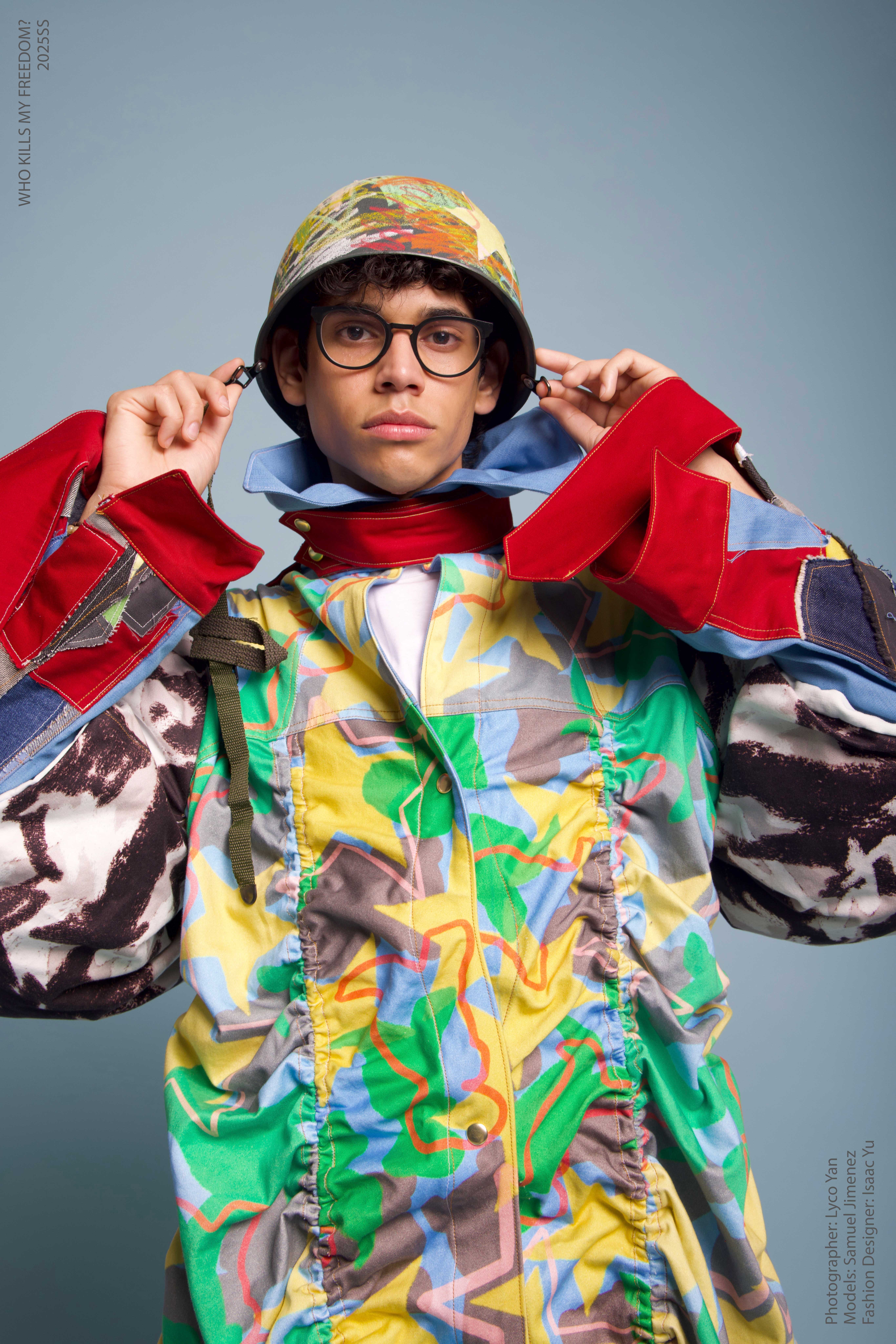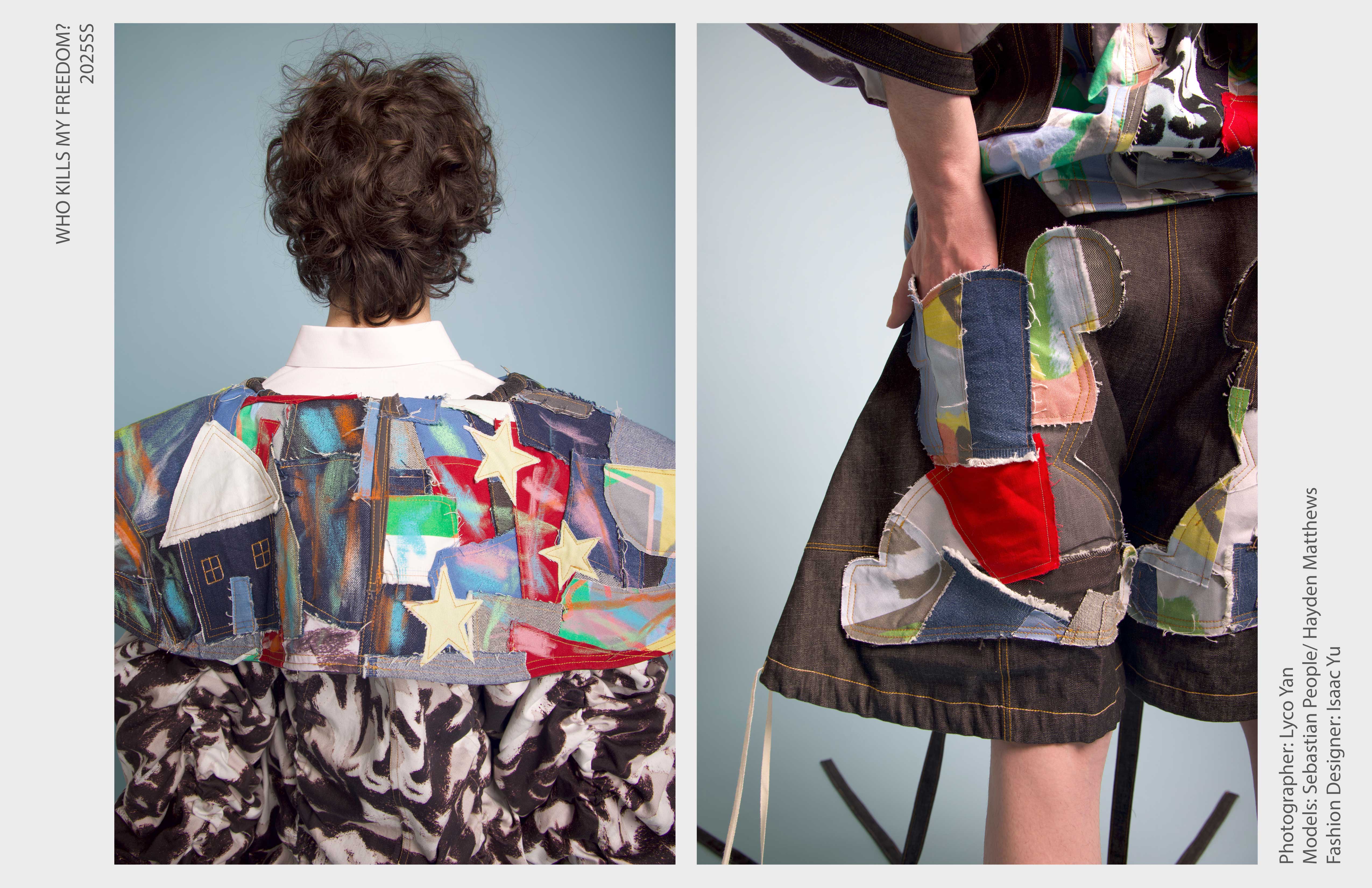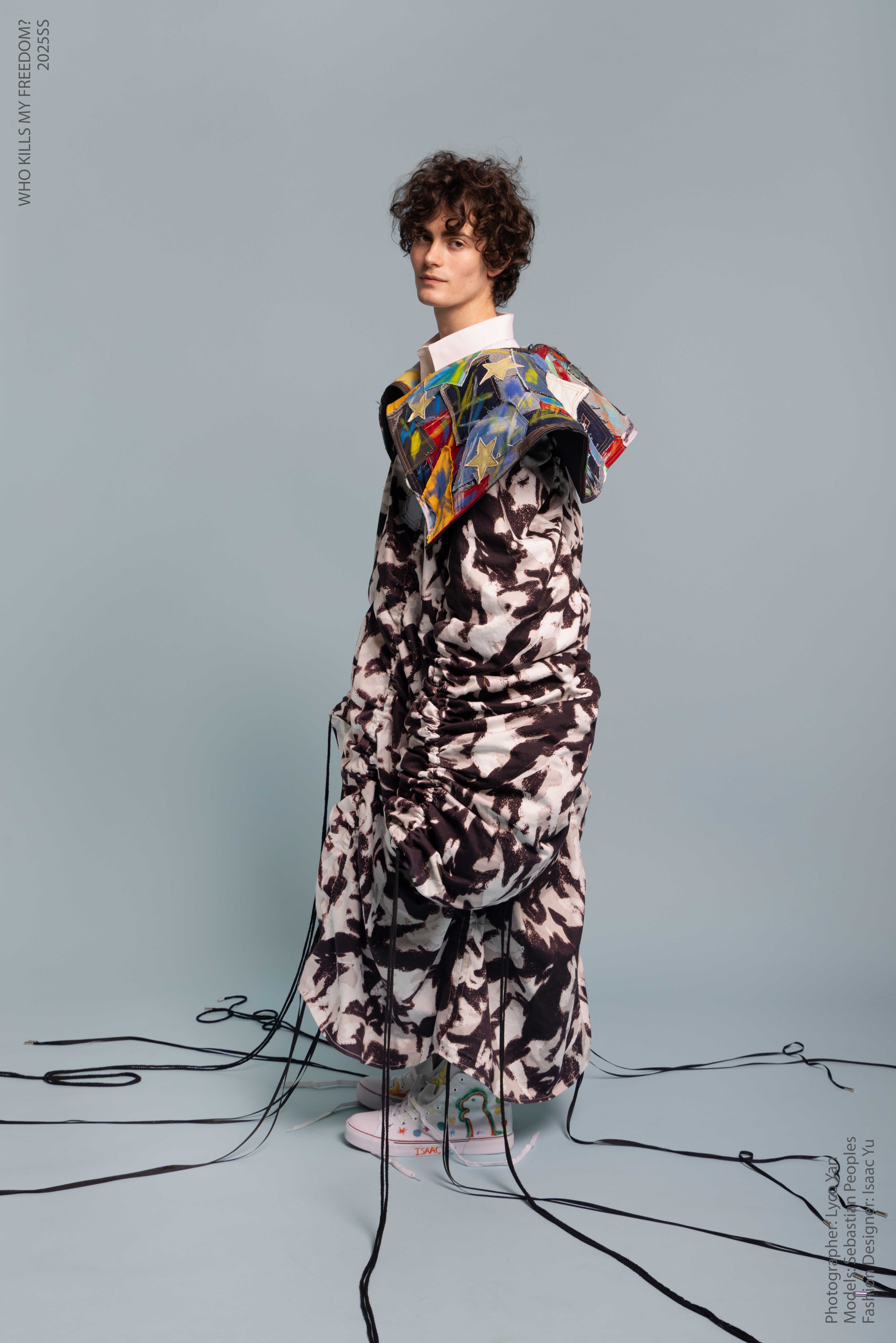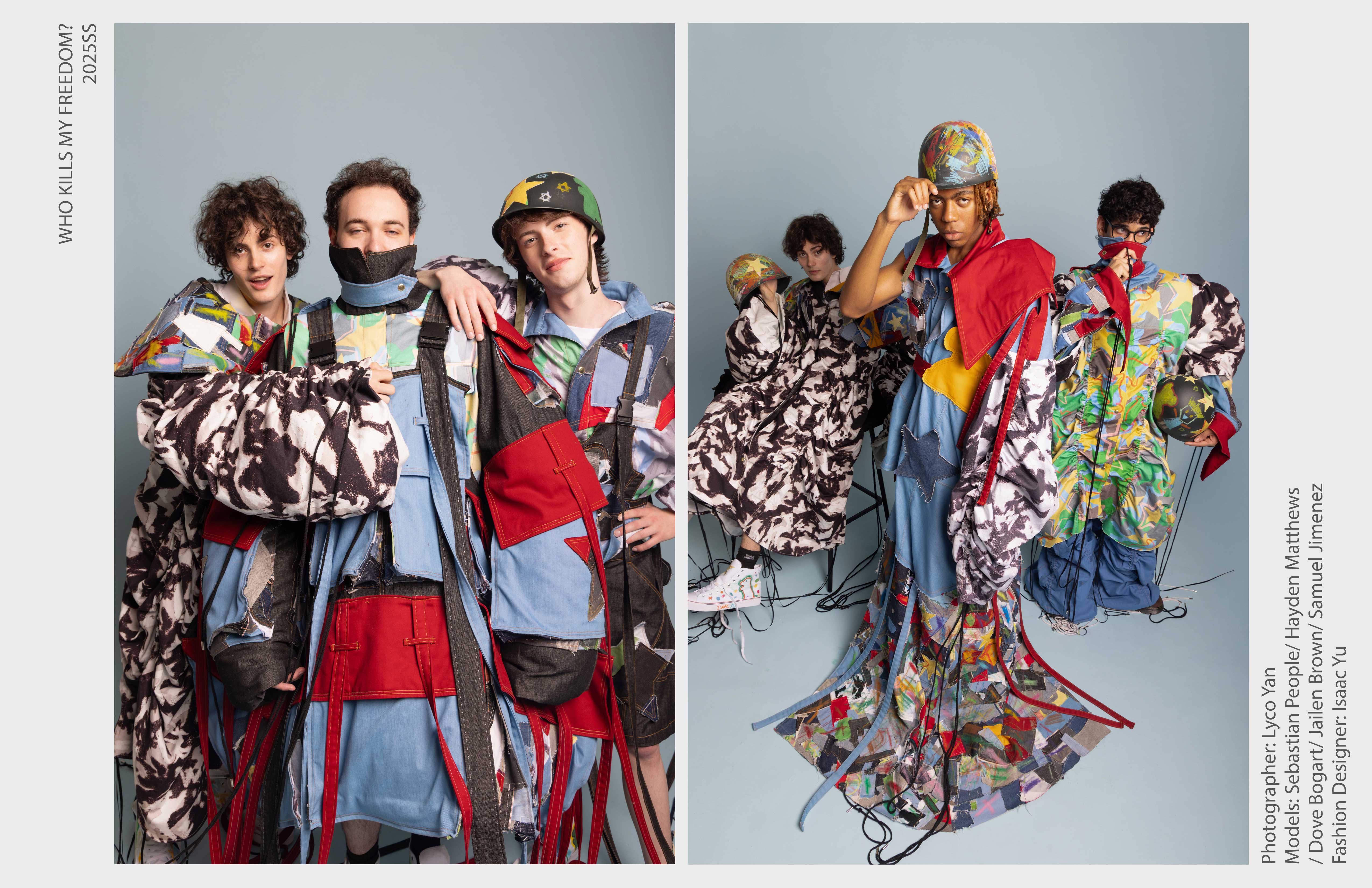 “Who Kills My Freedom?” is an innovative 2025 men’s streetwear SS collection that serves as a personal odyssey— bridging the rigid discipline of Taiwanese military service with the boundless imagination of my childhood. I grew up surrounded by love and freedom, encouraged by my parents to create, play, and dream without limits. But in the military, that freedom was replaced with structure and silence. My identity blurred beneath the weight of uniformity, until I discovered fashion.