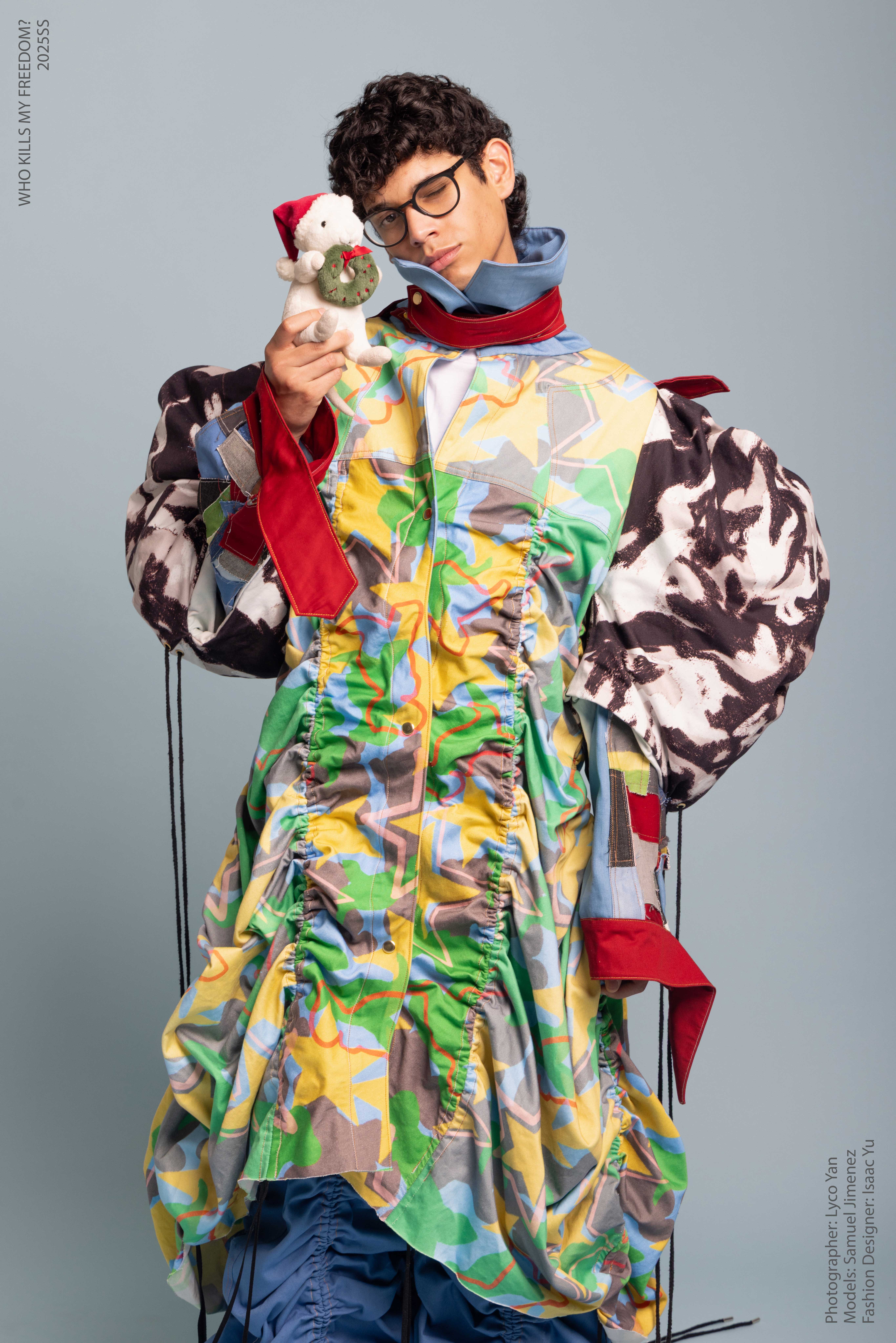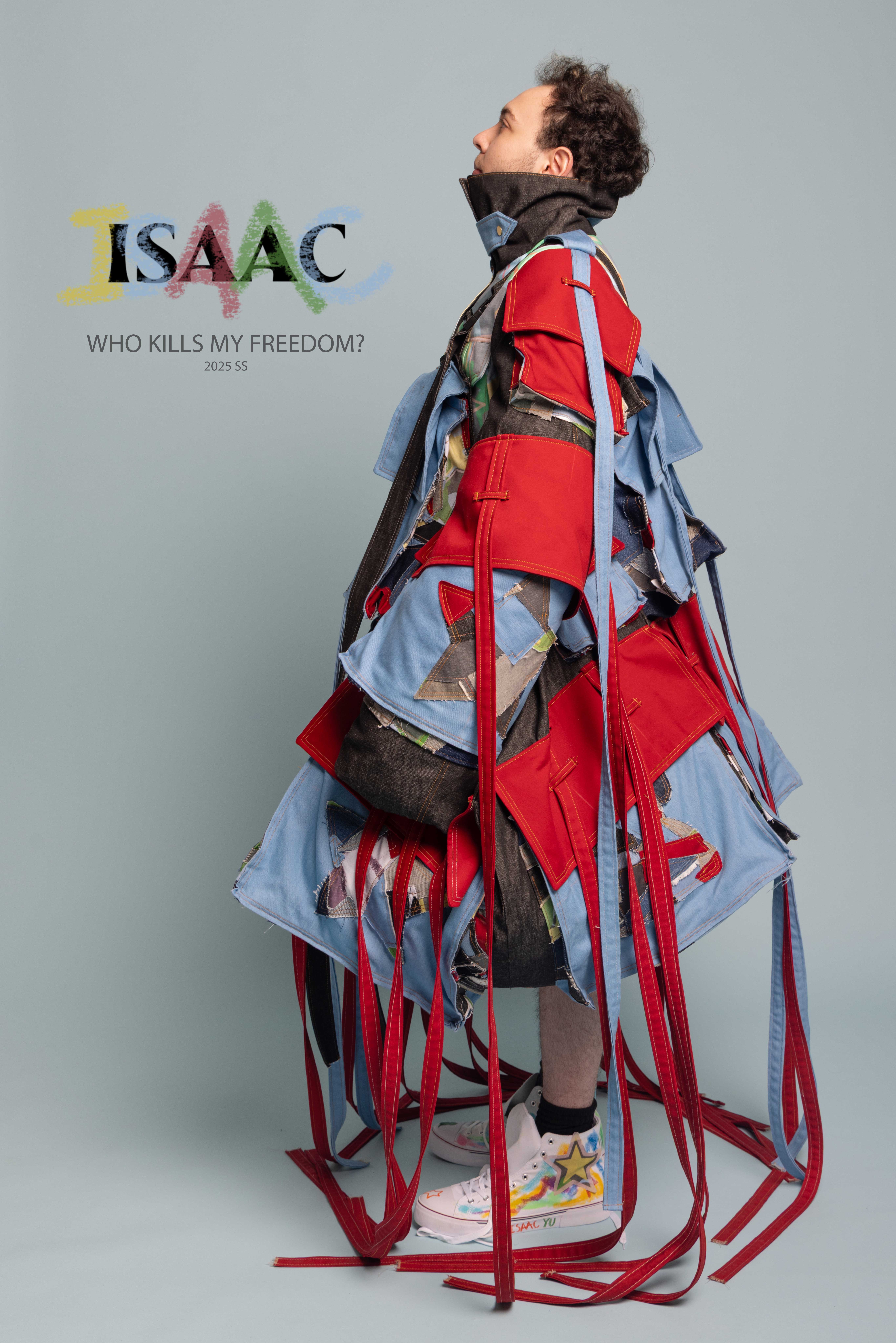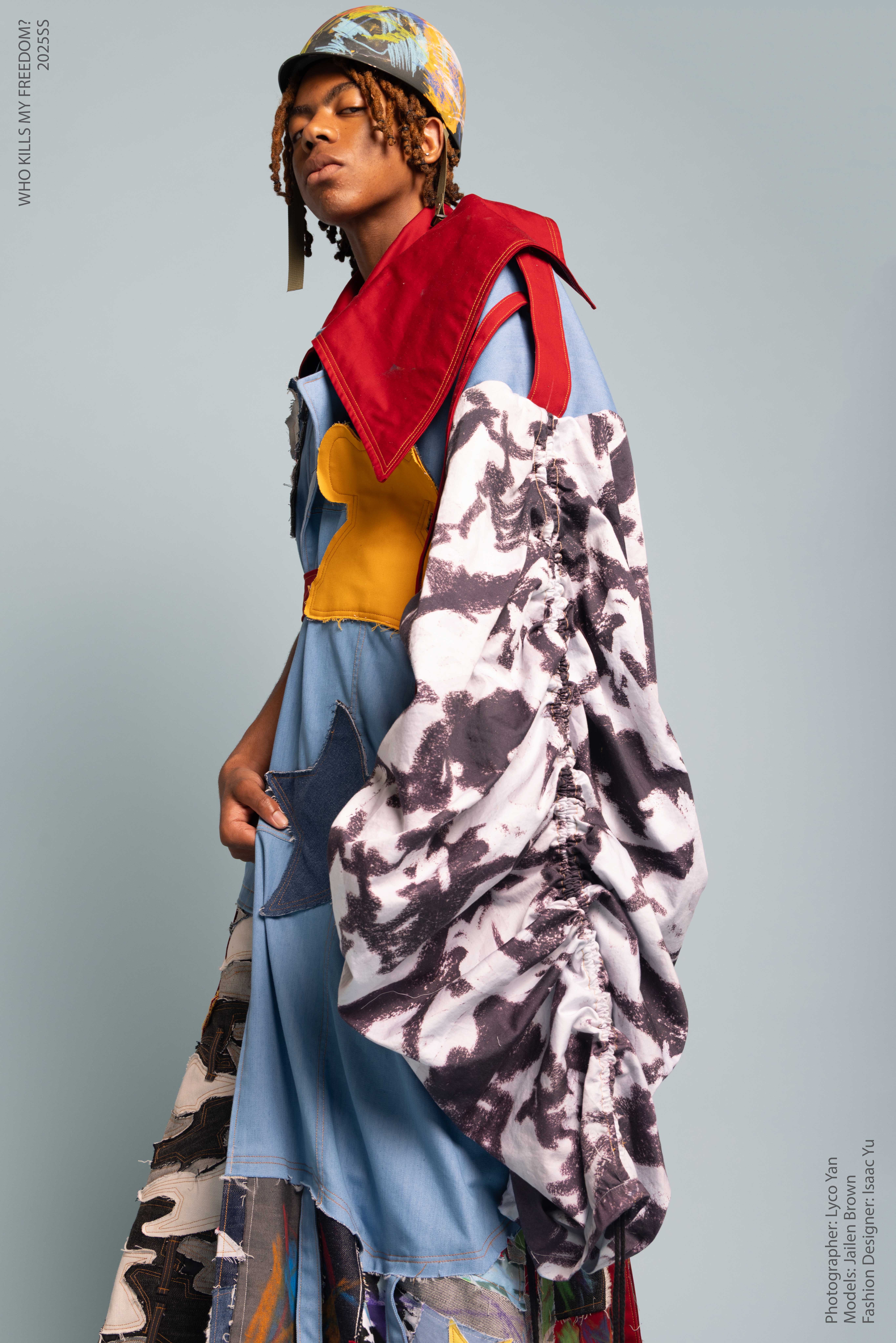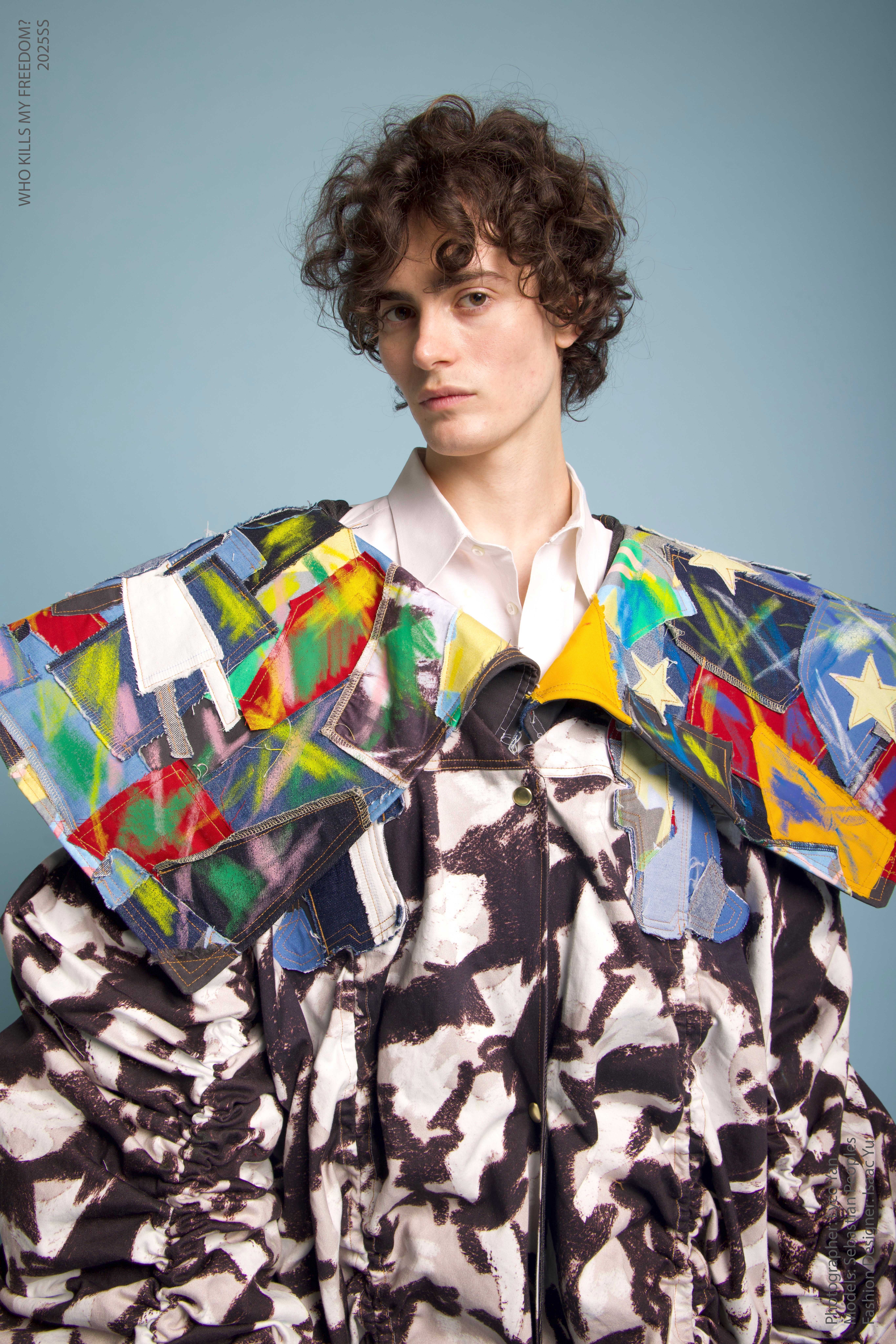 “Who Kills My Freedom?” is an innovative 2025 men’s streetwear SS collection that serves as a personal odyssey— bridging the rigid discipline of Taiwanese military service with the boundless imagination of my childhood. I grew up surrounded by love and freedom, encouraged by my parents to create, play, and dream without limits. But in the military, that freedom was replaced with structure and silence. My identity blurred beneath the weight of uniformity, until I discovered fashion.