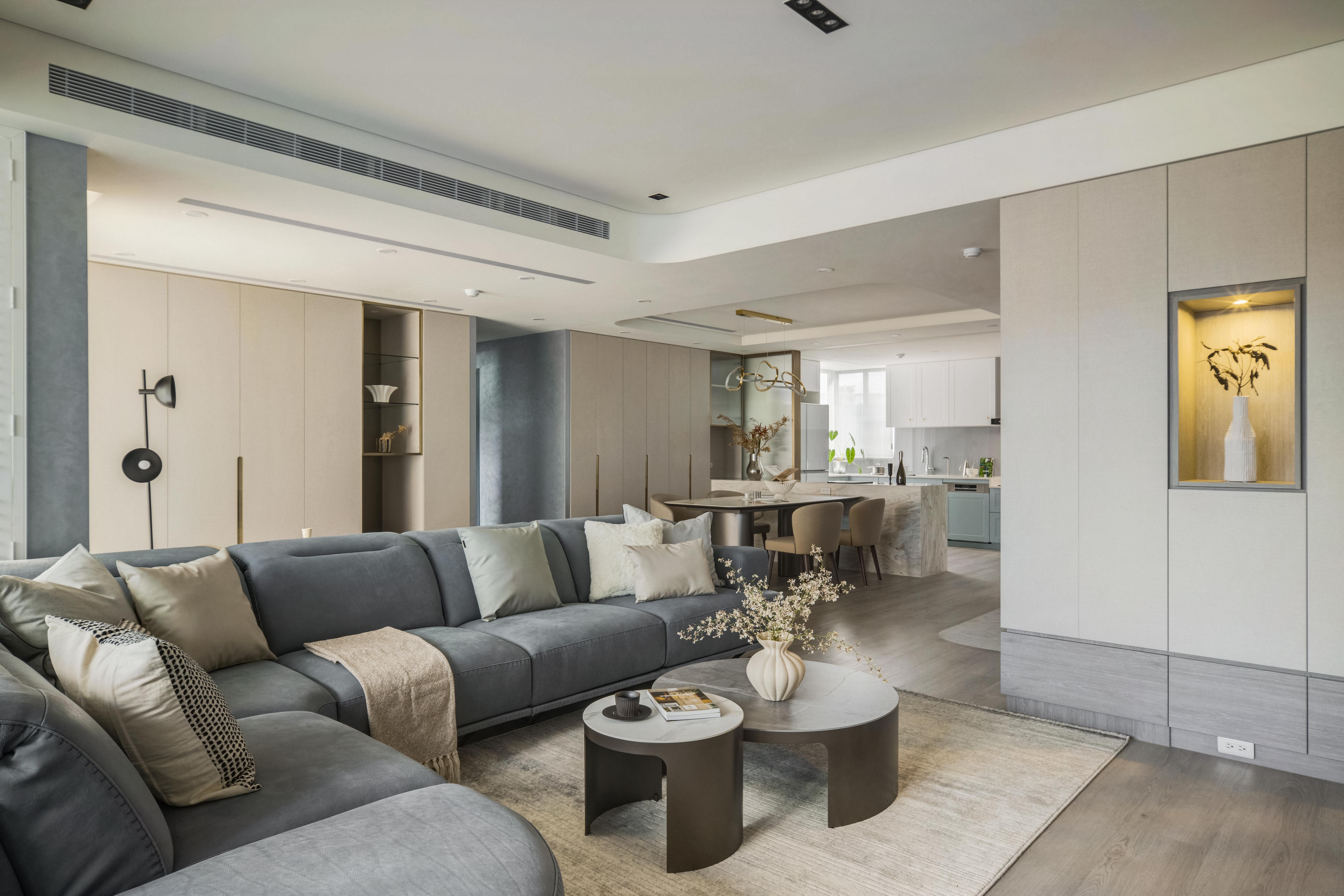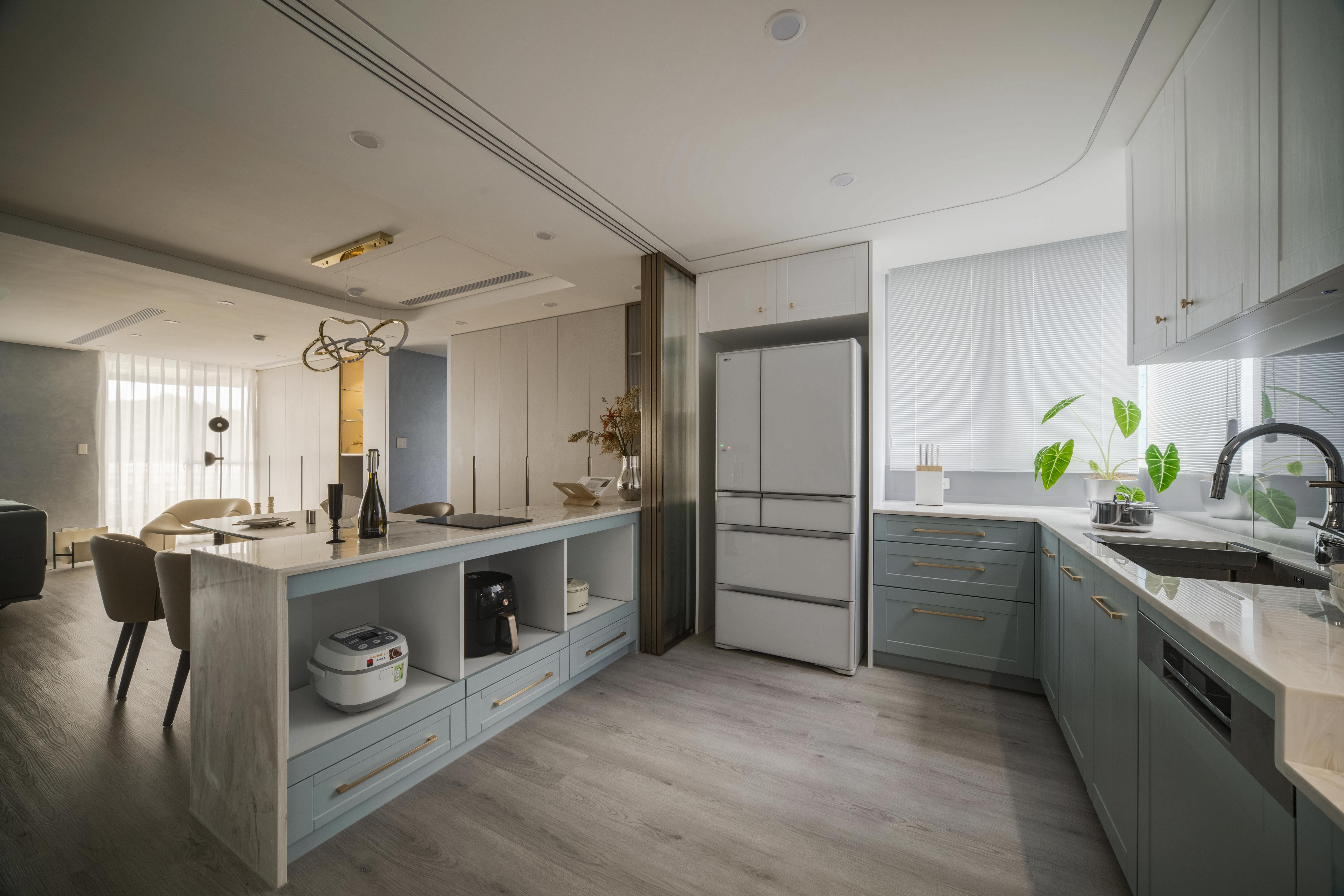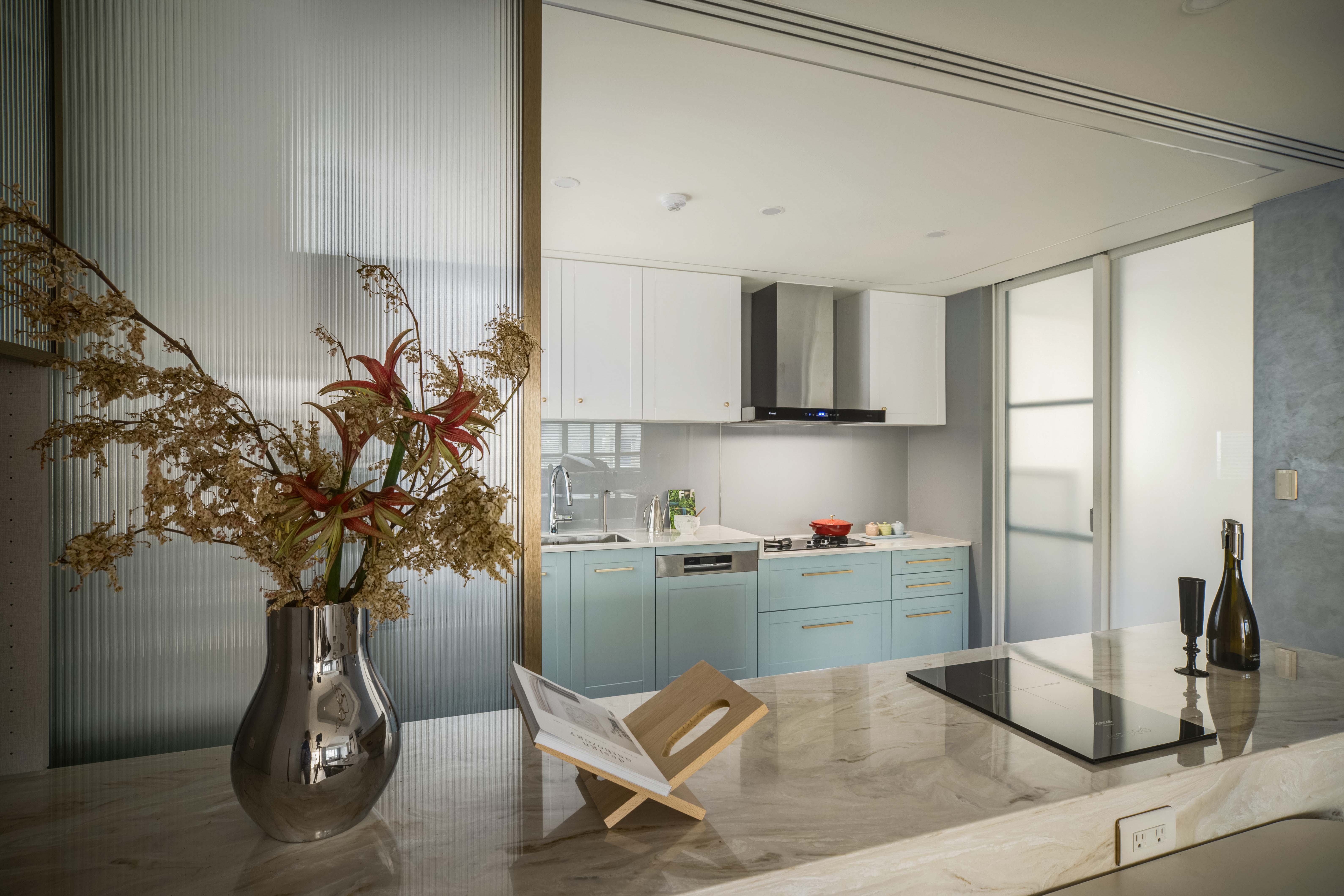 The plan features ”spatial openness” and “shared presence.” A significant design decision was the removal of one bedroom, which released space for a flexible area that seamlessly integrates the living and dining spaces into a borderless layout. The circulation flows continuously, enabling children’s play or yoga practice to unfold naturally. In the kitchen and dining area, the glass sliding door defines borders, blocking cooking odors while maintaining transparency. This strategy further enhances the overall spatial cohesion and improves the efficiency of living.