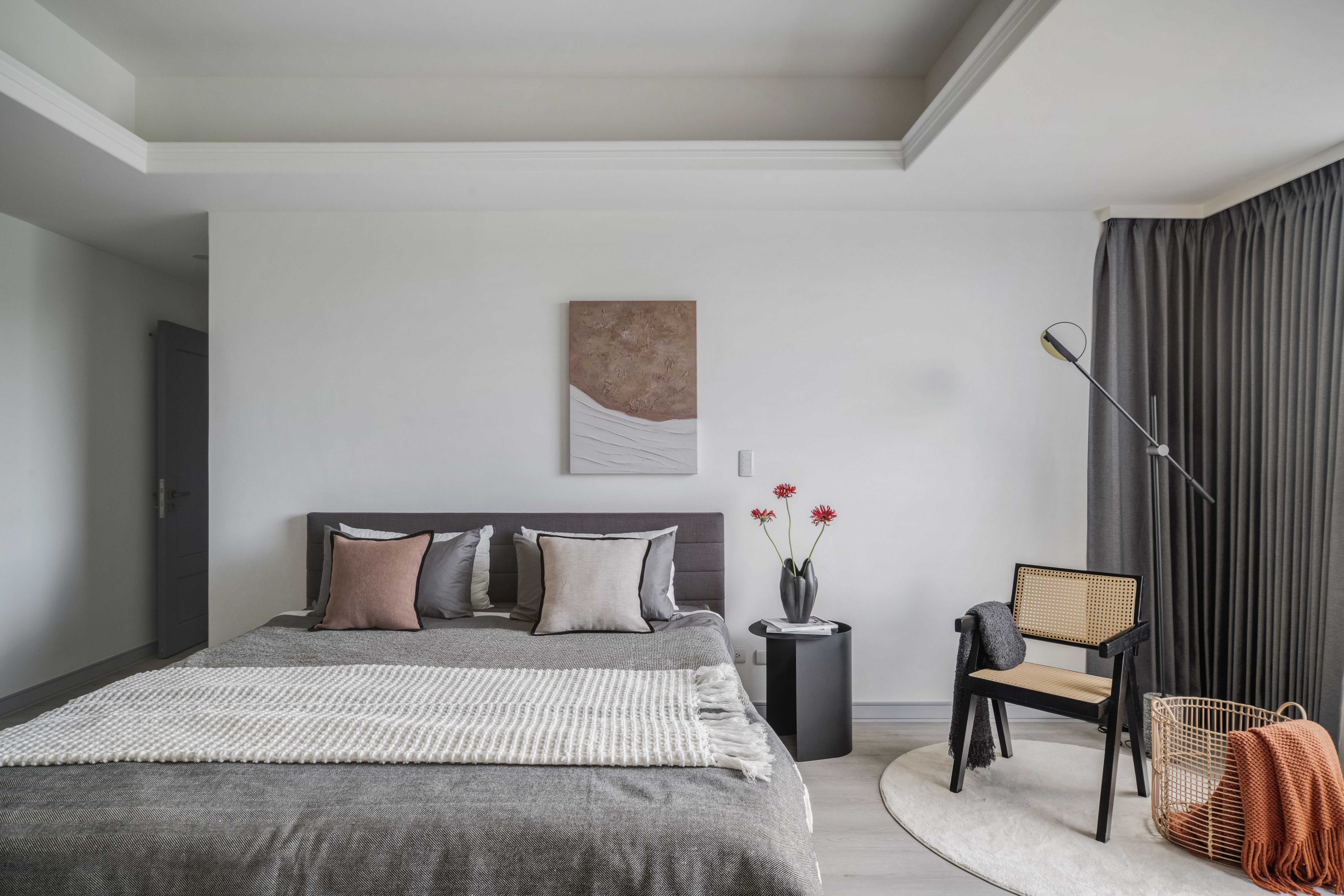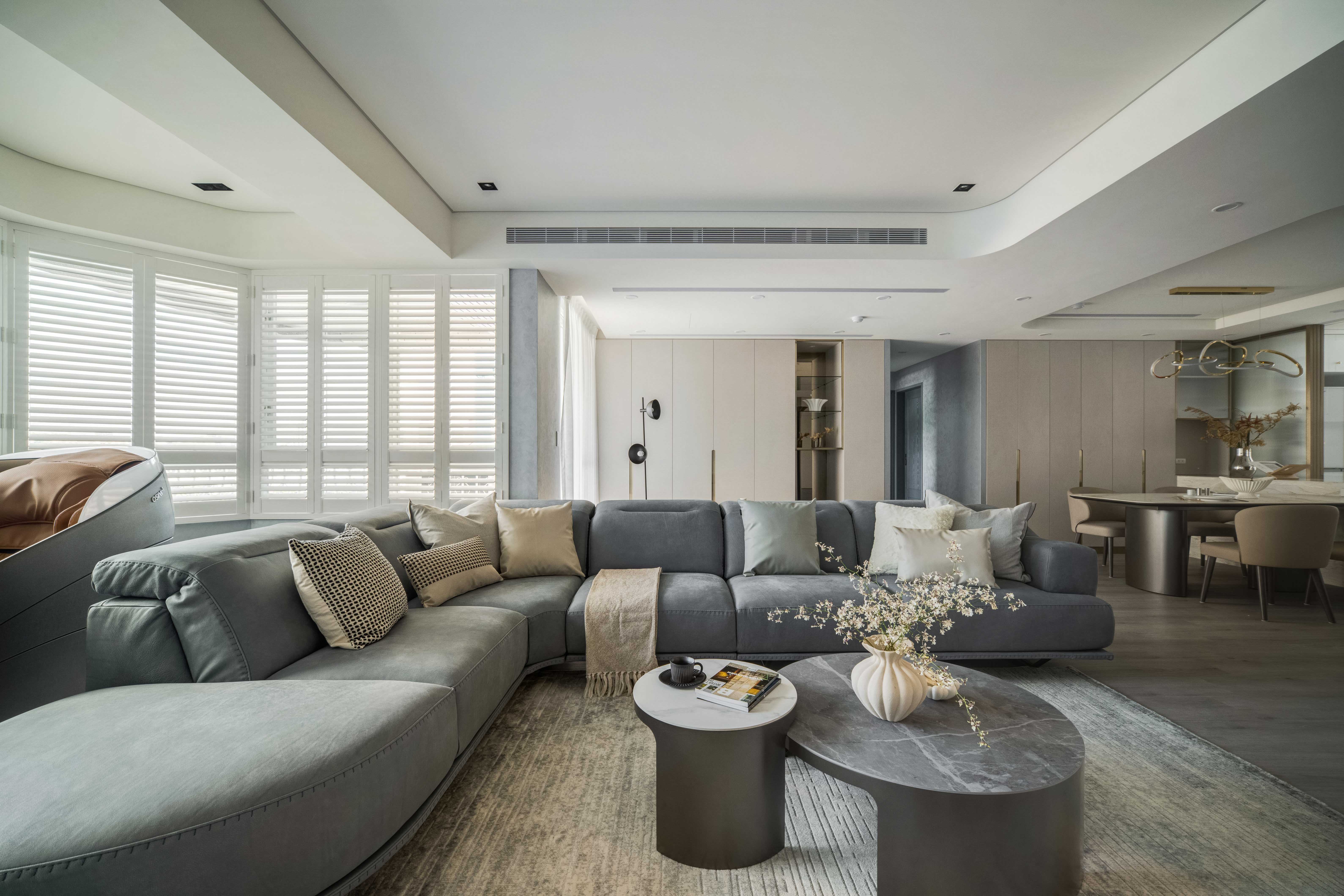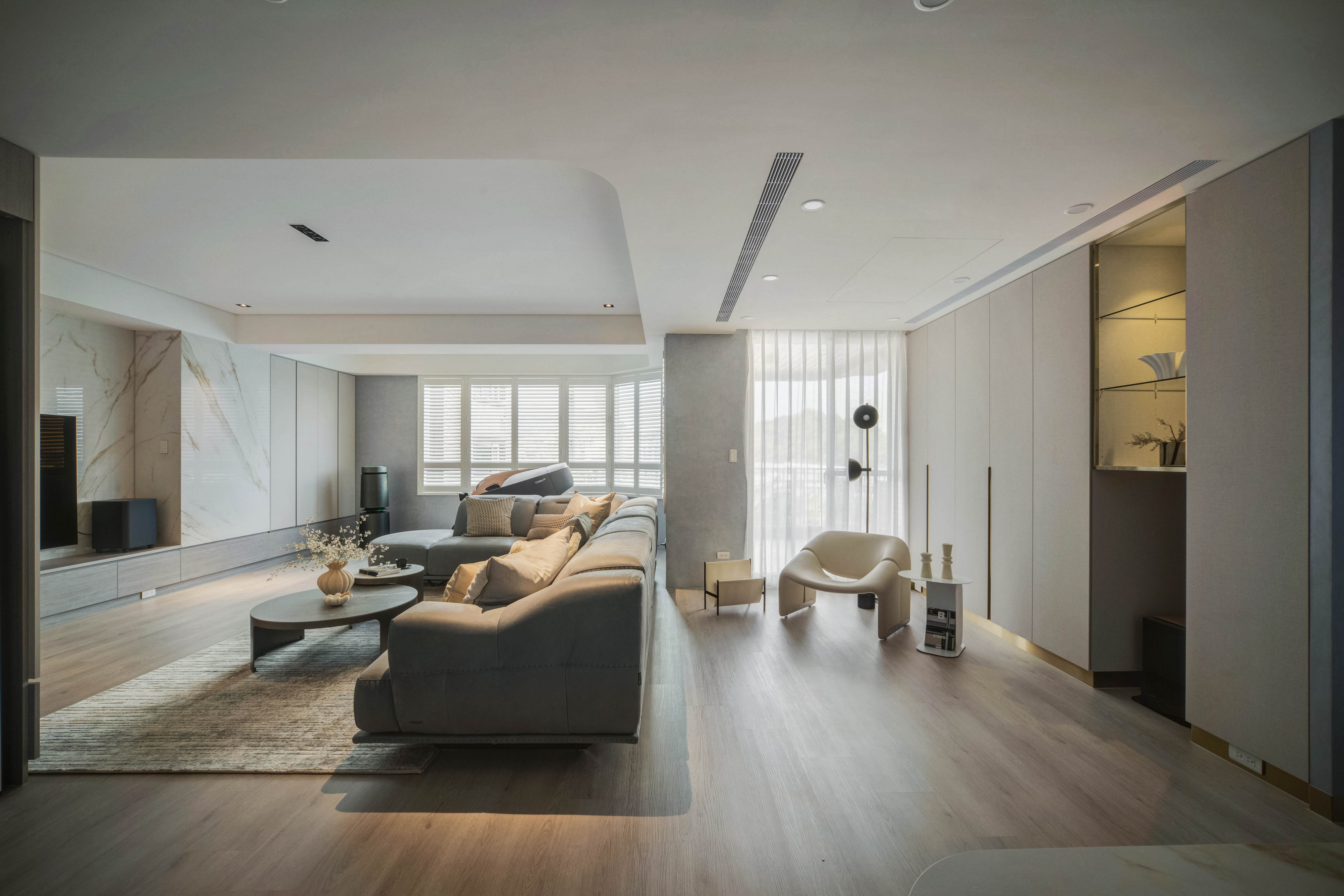 The plan features ”spatial openness” and “shared presence.” A significant design decision was the removal of one bedroom, which released space for a flexible area that seamlessly integrates the living and dining spaces into a borderless layout. The circulation flows continuously, enabling children’s play or yoga practice to unfold naturally. In the kitchen and dining area, the glass sliding door defines borders, blocking cooking odors while maintaining transparency. This strategy further enhances the overall spatial cohesion and improves the efficiency of living.