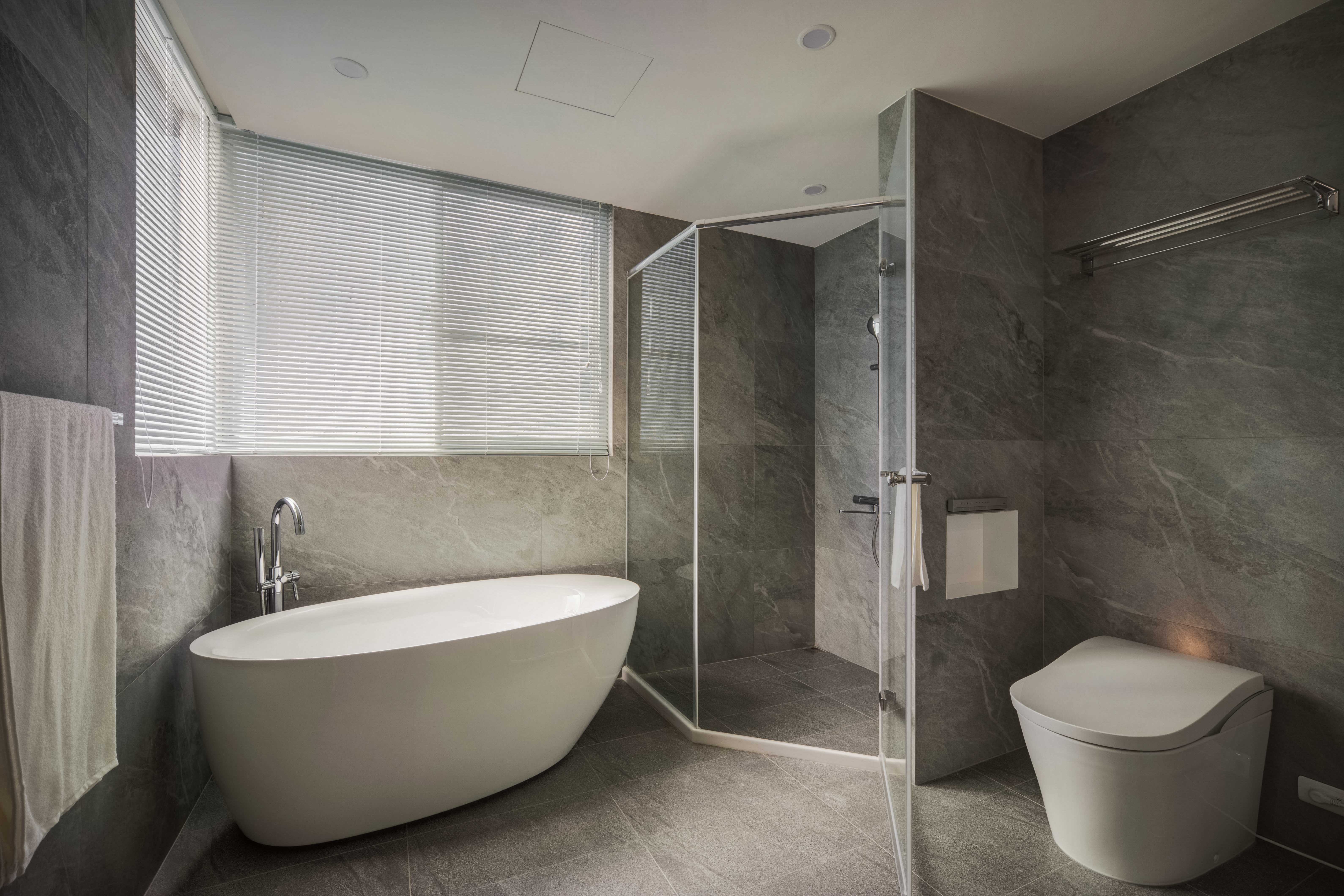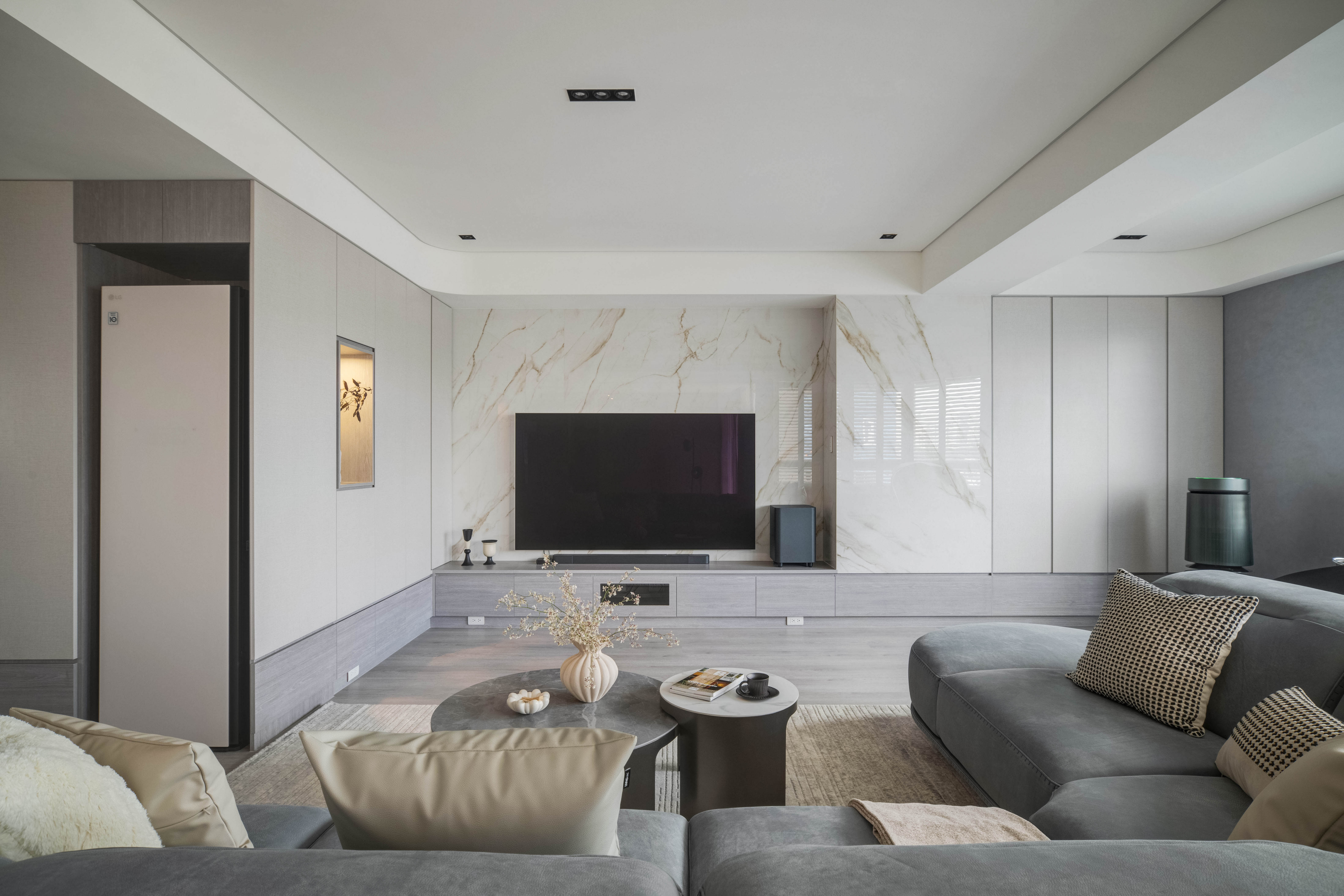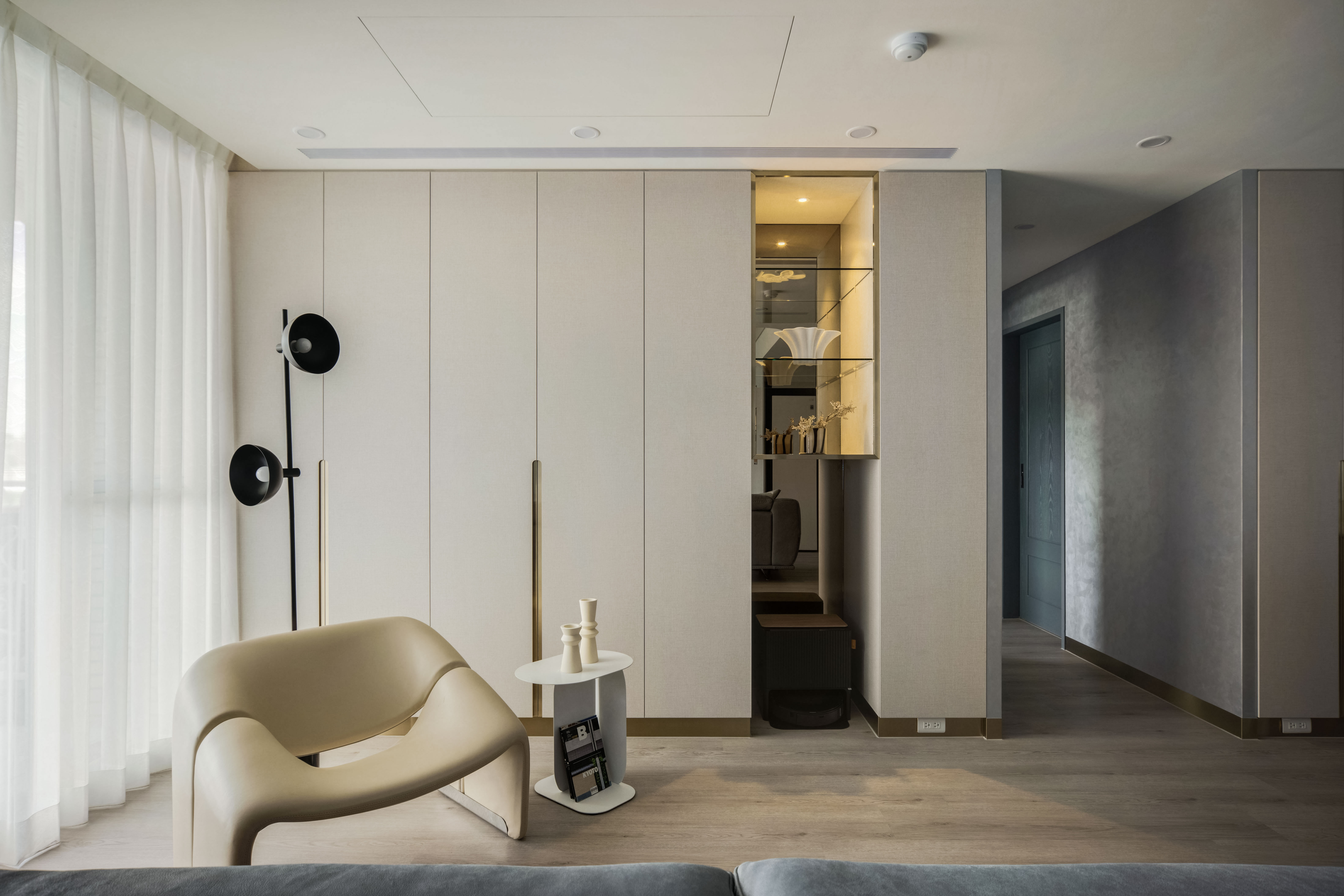 As the primary palette, neutral earthy tones flow throughout the project, rising vertically from dark brown flooring to gray-beige walls and a light-toned ceiling. This gradation grounds the space with calmness while extending its visual depth. The design team carefully balanced the use of stone-veined slabs and titanium-plated finishes with matte latex paint, creating textures that feel both cool and warm to the touch. This intentional balance enhances the effect of natural light, allowing it to trace along surfaces and materials, and in doing so, maintains a poised harmony between softness and serenity across the entire interior.