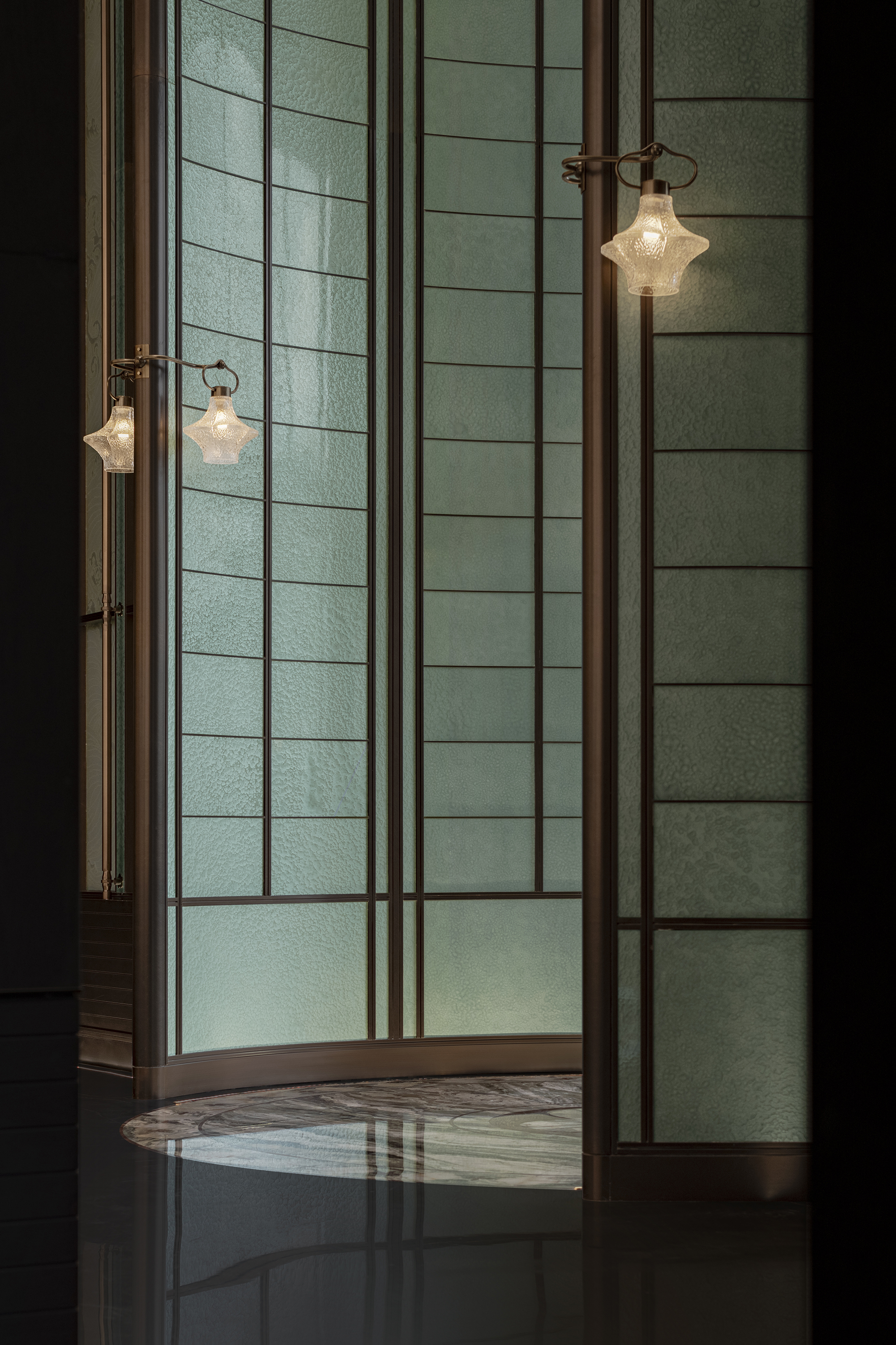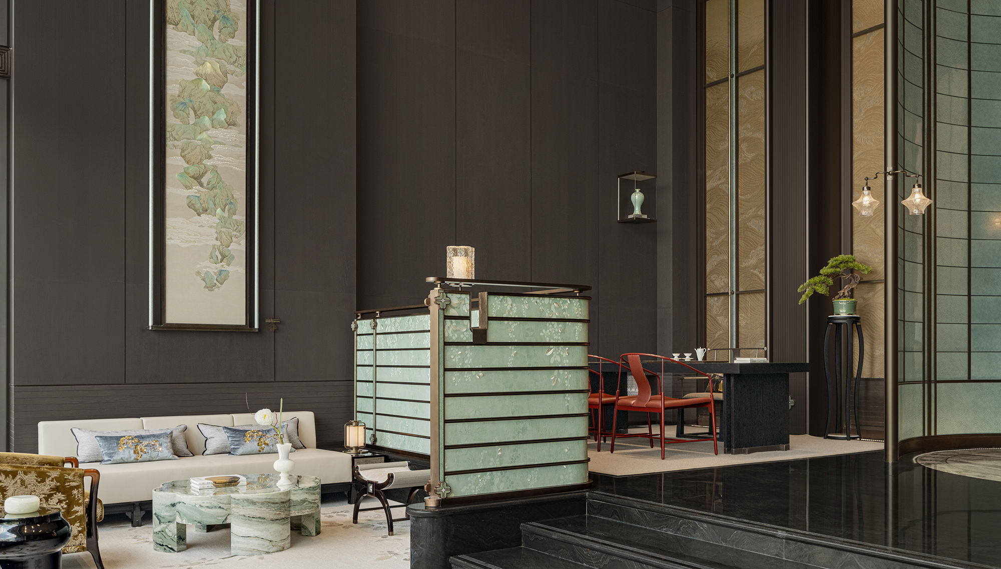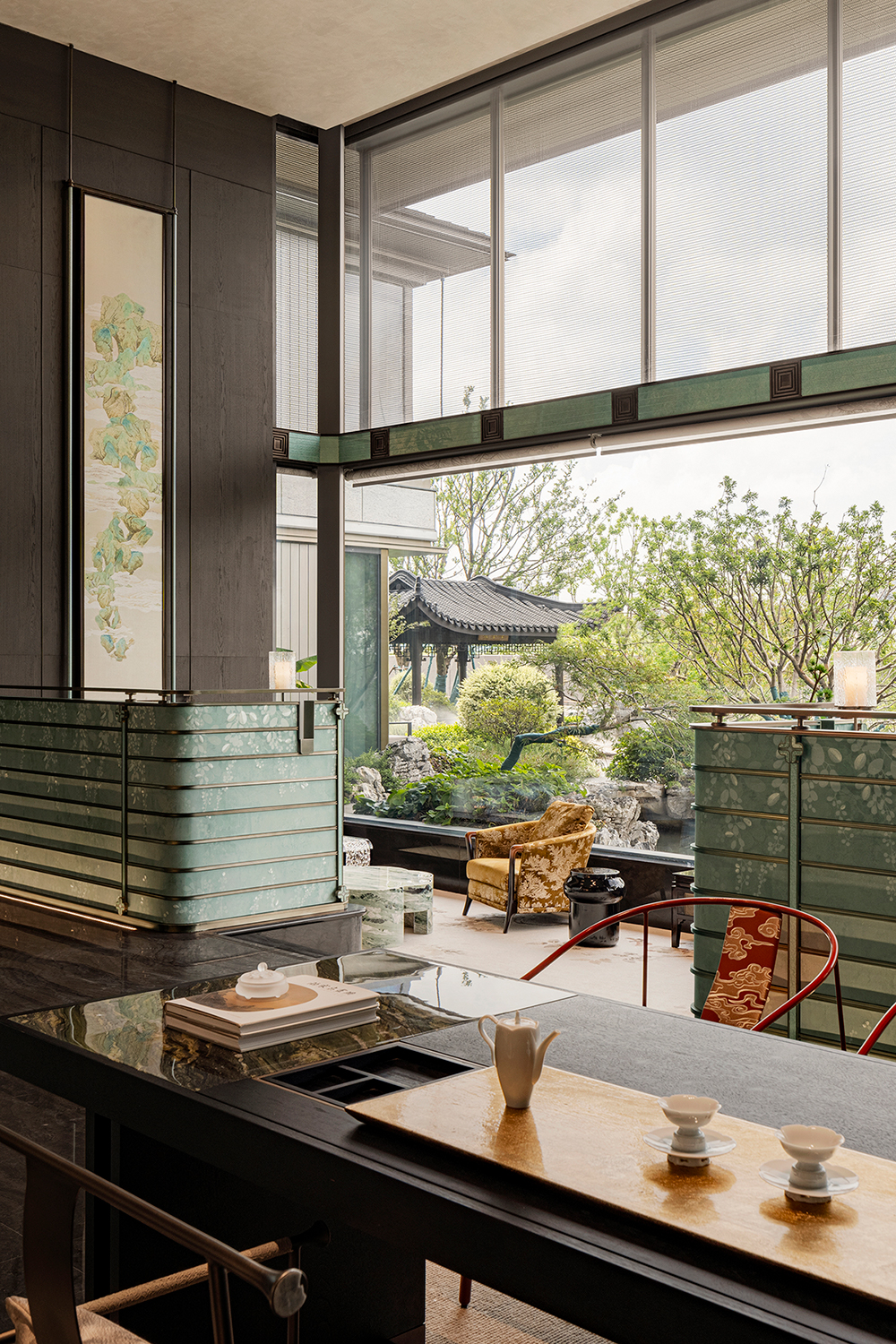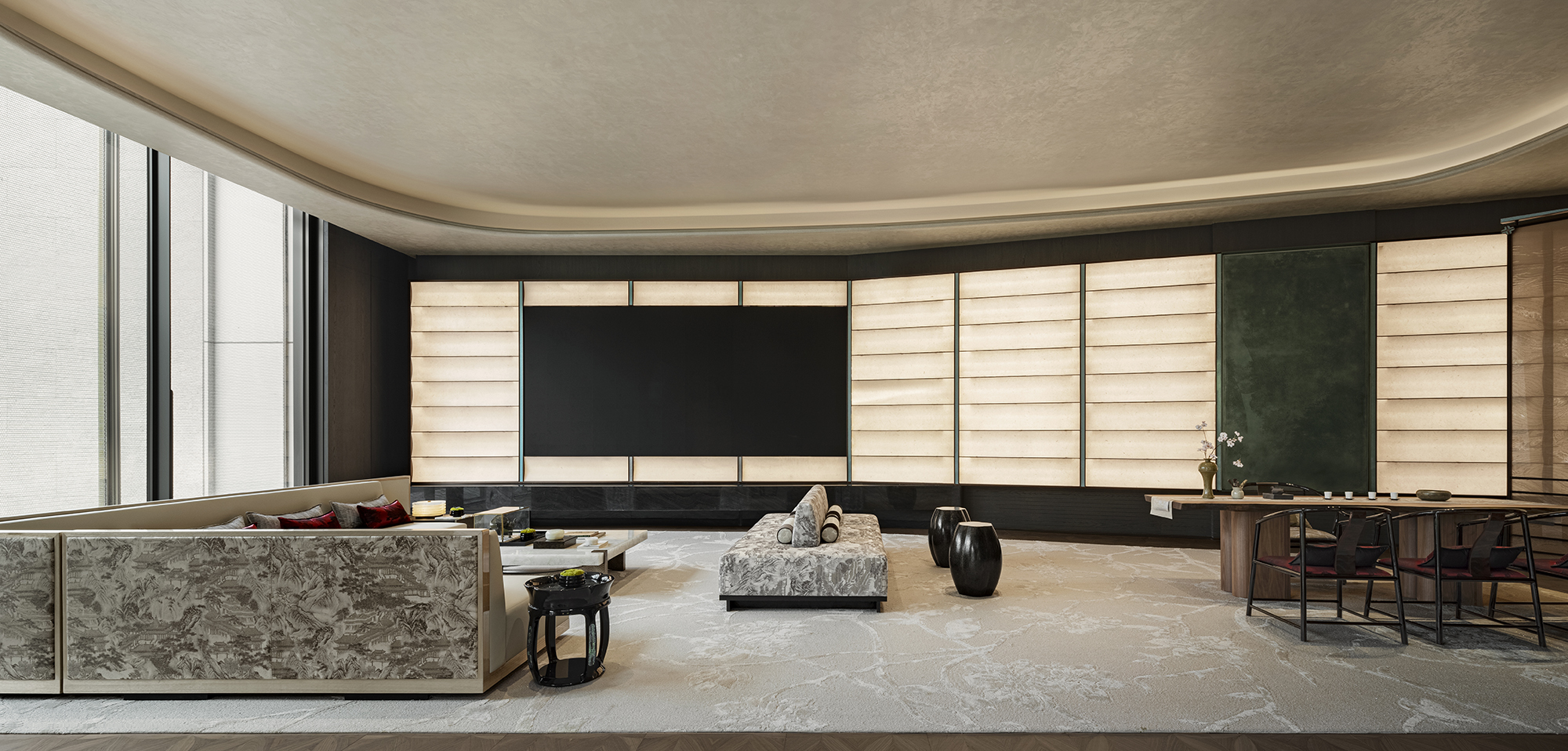 The in-depth negotiation area becomes a stage that evokes ancient literati gatherings. Overhead, the ceiling mimics a boat canopy, complemented by wood carvings, mother-of-pearl lacquer, and bronze accents—reimagining Jichang Garden’s “Fish-Watching Rail” through a contemporary lens.