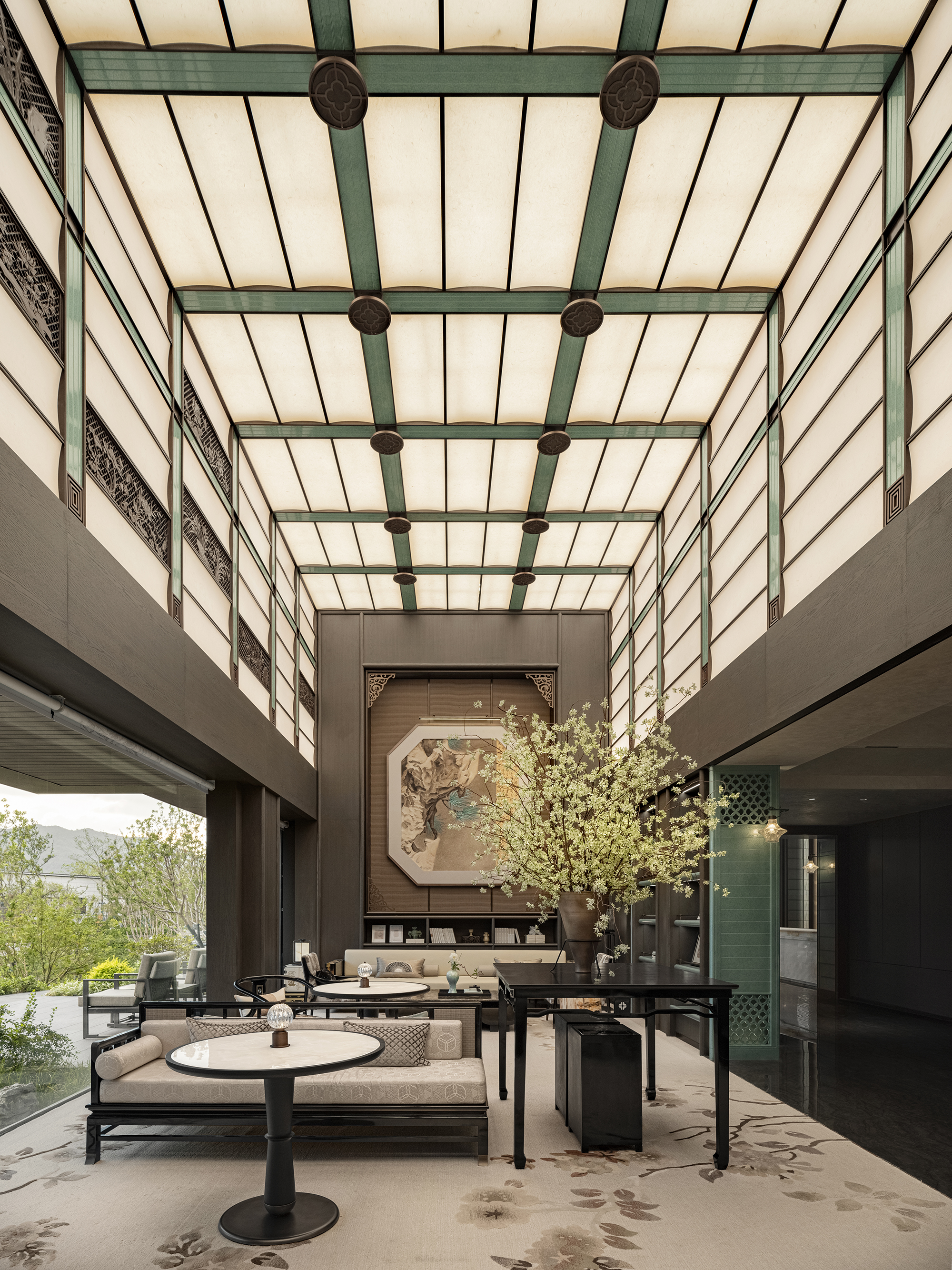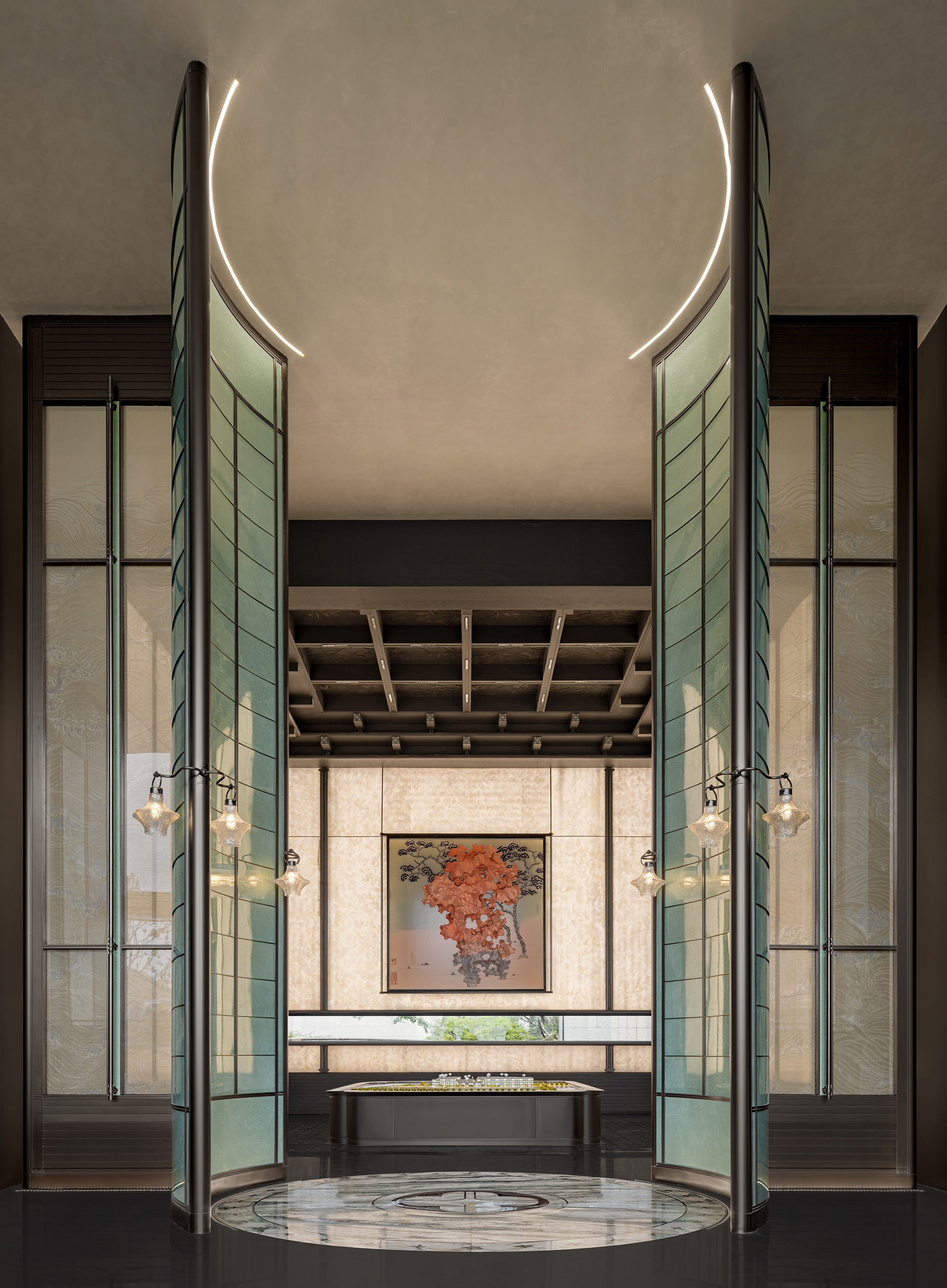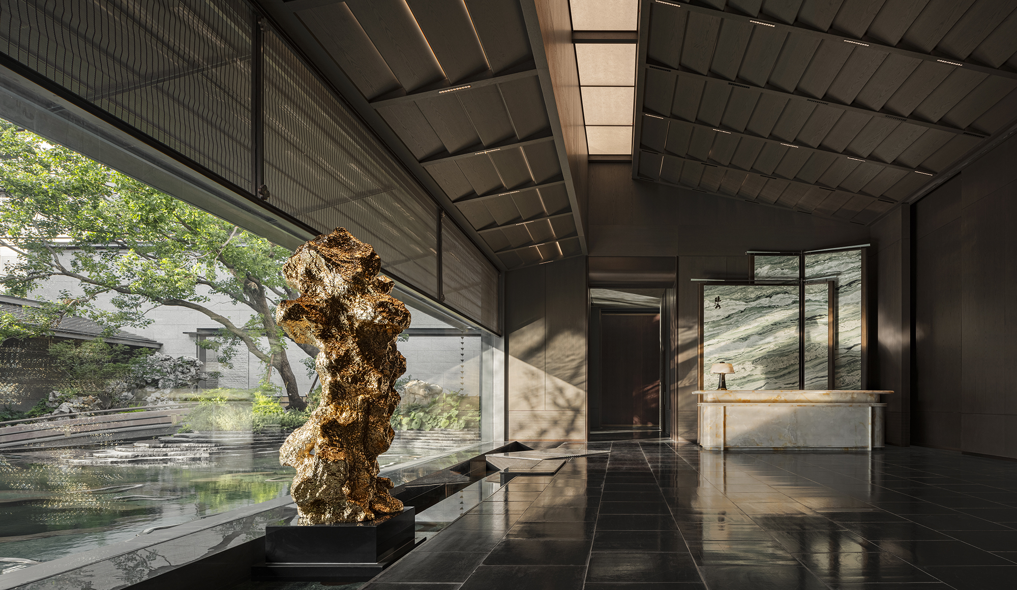 The entrance porch draws on the upturned eaves of Jichang Garden, while the spacious courtyard is envisioned with bamboo-textured metal grilles, evoking the ceremonial grace of ancestral mansions. Imperial kiln bricks pave the path home, while spring water in the garden is subtly revealed through curated window views.