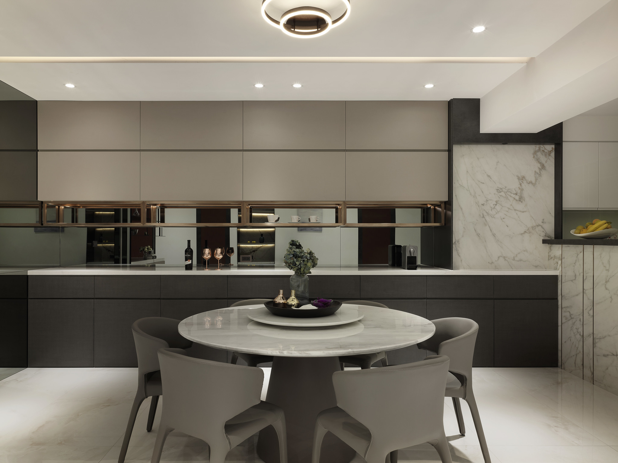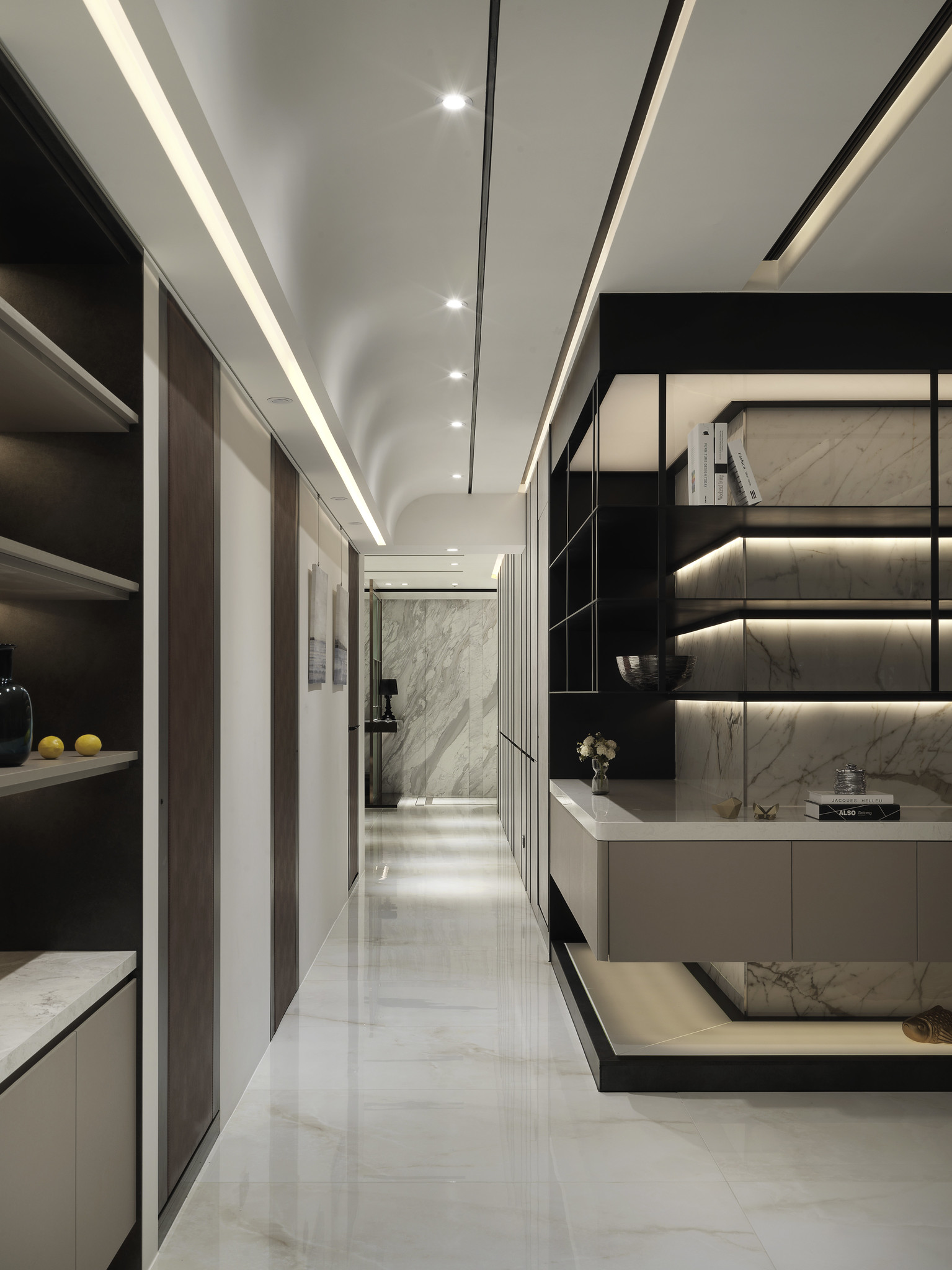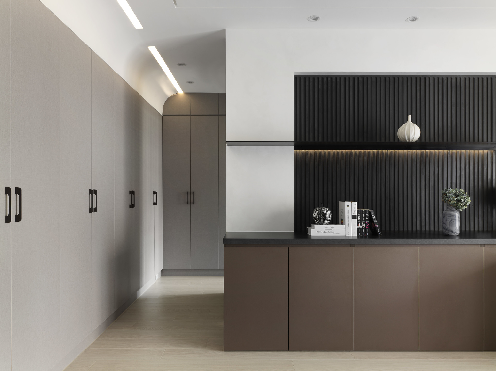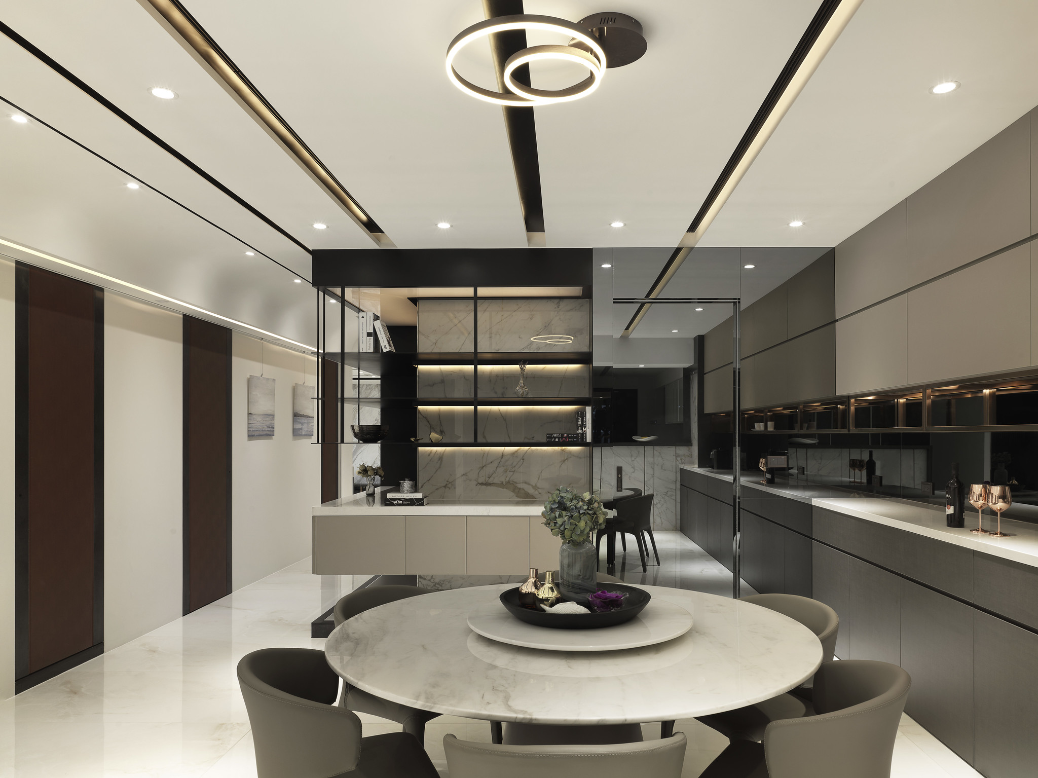 In the common areas, the designers integrated the living room, dining room, and kitchen into an open-plan layout, creating a spacious and comfortable environment that fosters family interaction and a sense of belonging. This not only provides ample space for residents to move around, but also enhances their comfort and overall experience. It also reflects the owner's personal taste for understated luxury and elegance.