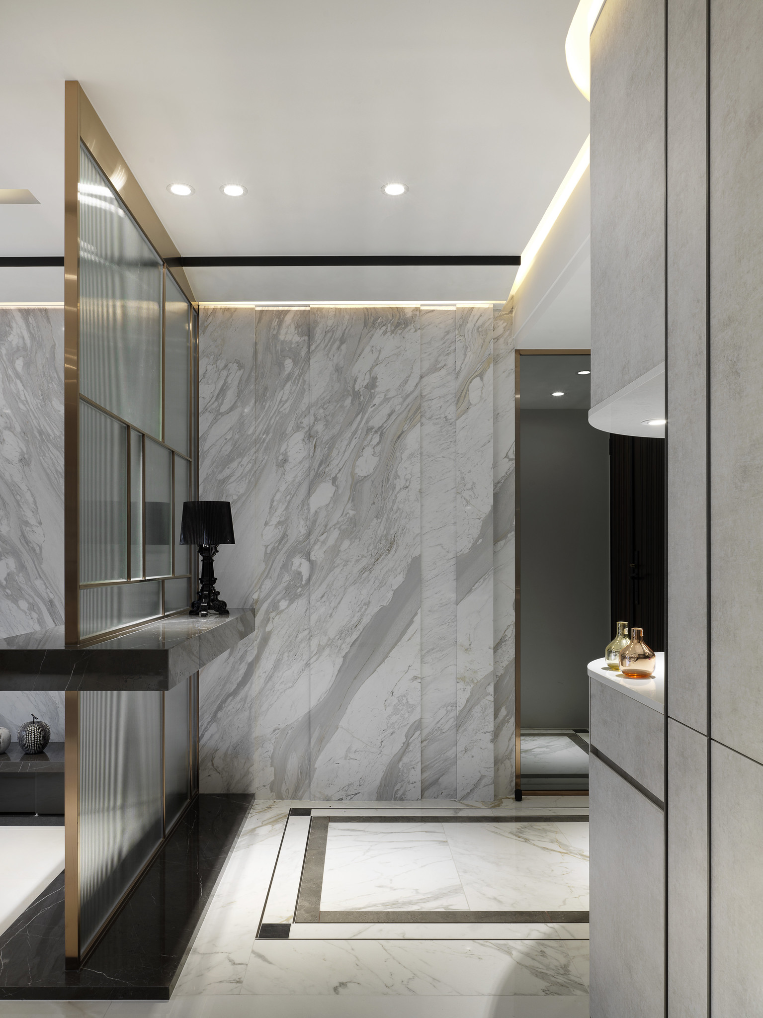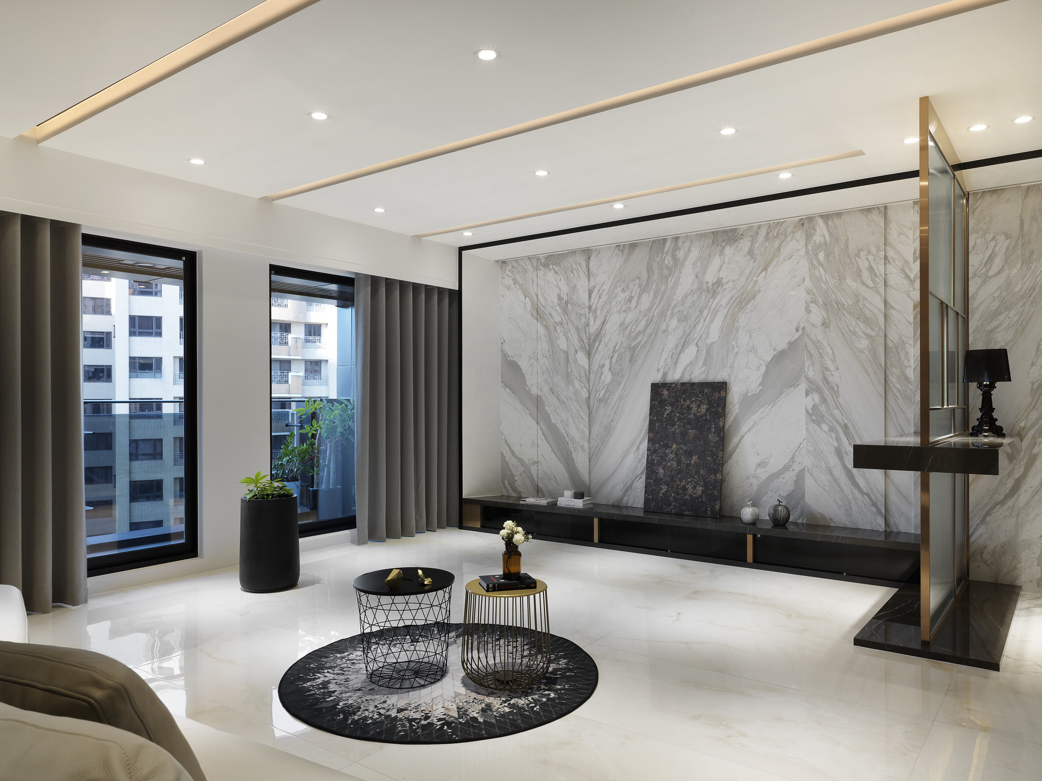 The owner's preference for golden tones and unique taste inspired the designers to incorporate elements and techniques such as marble, golden metal, and curved lines in the common areas. A light, bold palette is used as the foundation, complemented by darker accents, imbuing the living space with a sophisticated charm.
