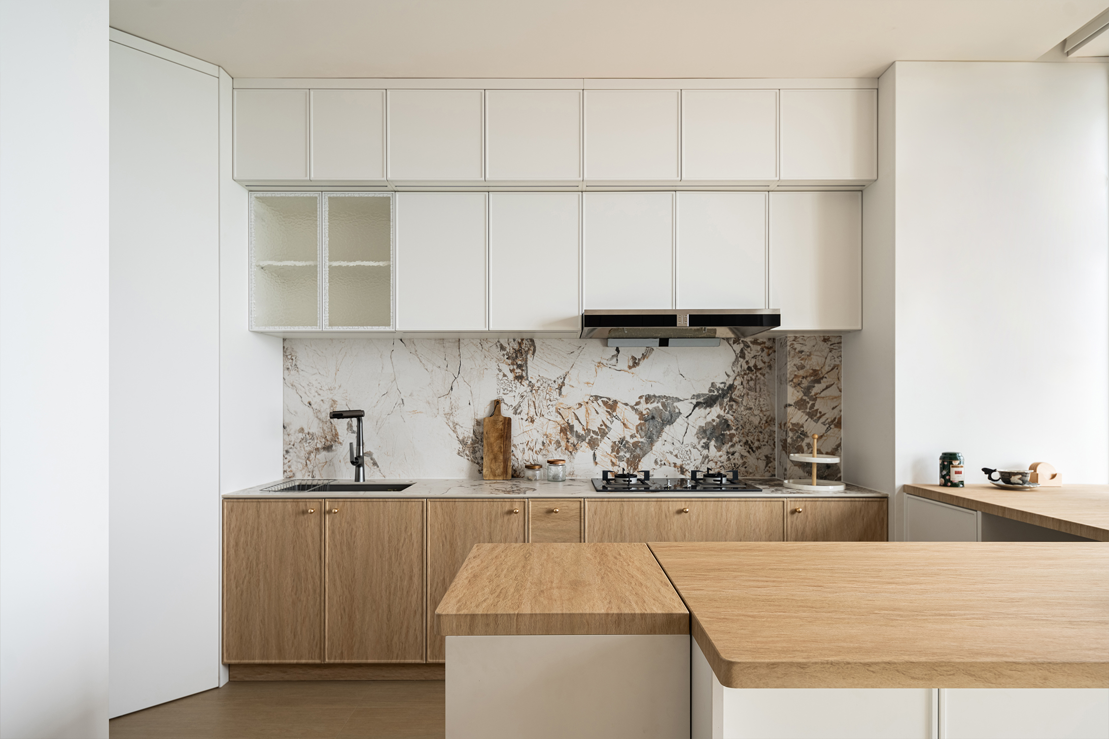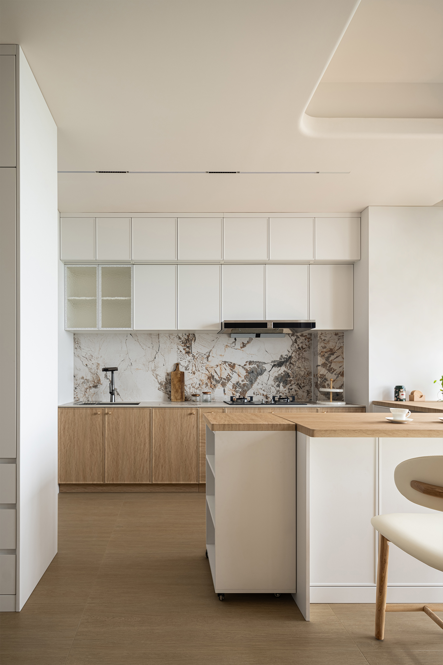 Furthermore, the kitchen stands out with its modern and minimalist design approach. The island extends seamlessly into a dining surface, effectively overcoming the challenges of compact space. This design choice transforms the kitchen into the heart of family life, where three generations can engage in natural, fluid interactions.