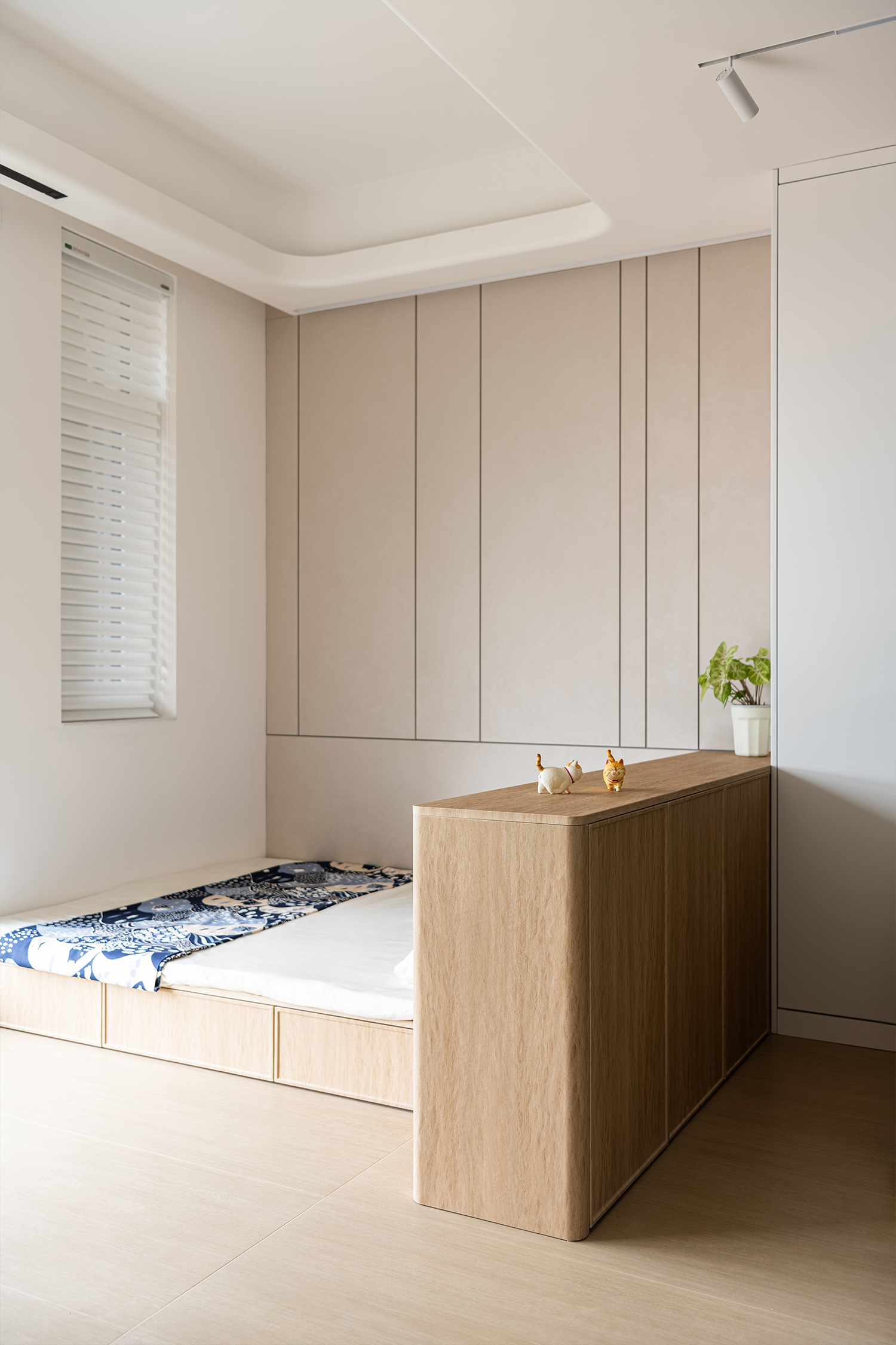This thoughtfully designed residential space is specifically tailored for seniors, with a strong emphasis on the principles of “warm minimalism and daily care.” At the same time, it addresses the shared living needs of multi-generational families, effectively creating a harmonious living environment. The foundation of the design features a soothing palette of natural wood tones complemented by crisp white, which together evoke tranquility and invite a sense of modern elegance. To enhance safety and comfort, the design incorporates carefully considered elements, such as rounded corners, low-level flooring, and concealed handles, ensuring smooth and secure mobility for all residents. The approach to storage is equally intentional, prioritizing aesthetics that enable everyday items to blend seamlessly into the overall decor, thereby maintaining a clean and uncluttered appearance. Additionally, the abundant natural light flooding through the windows, paired with vibrant greenery, transforms this residence into a safe and nurturing space.