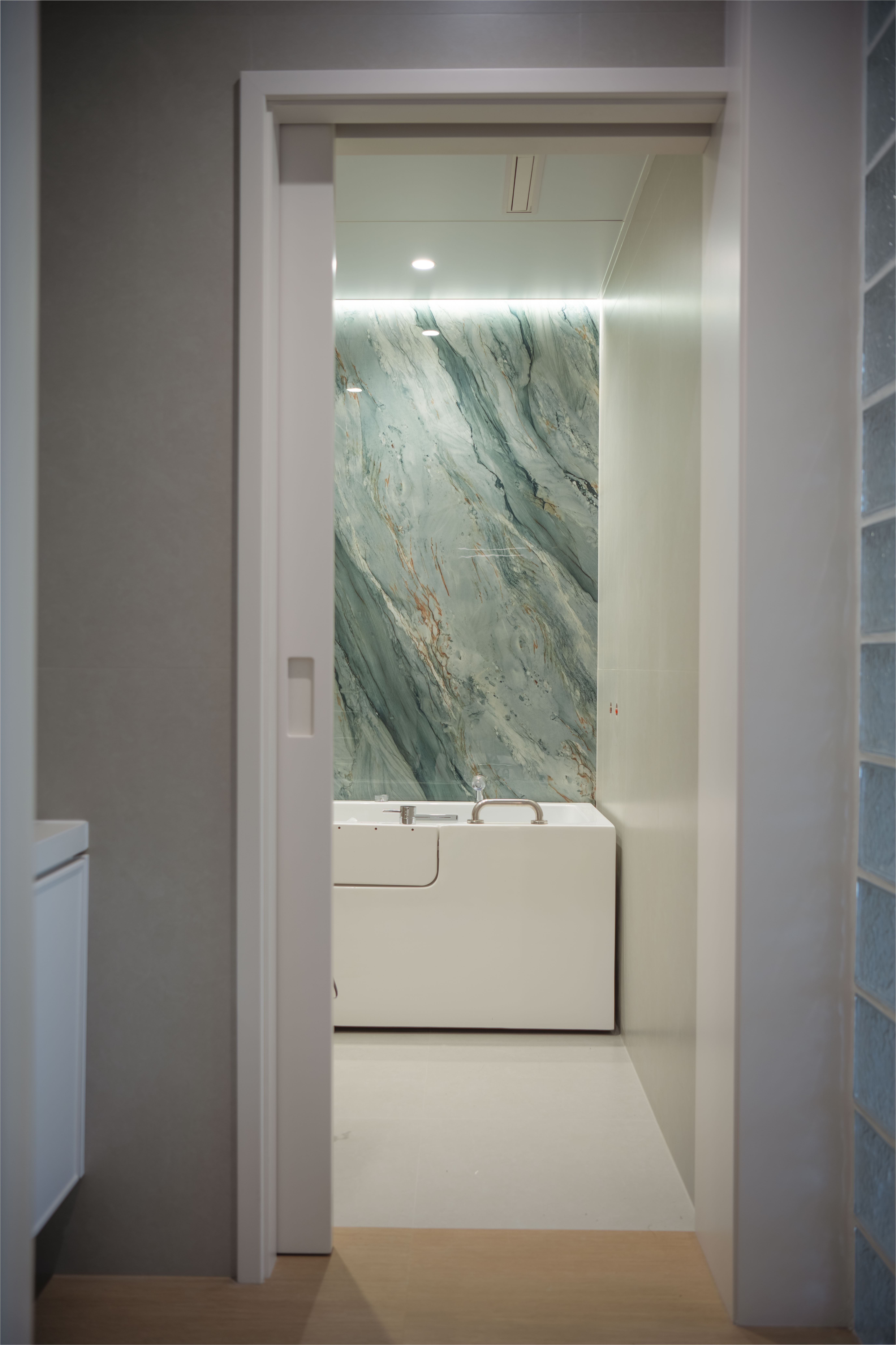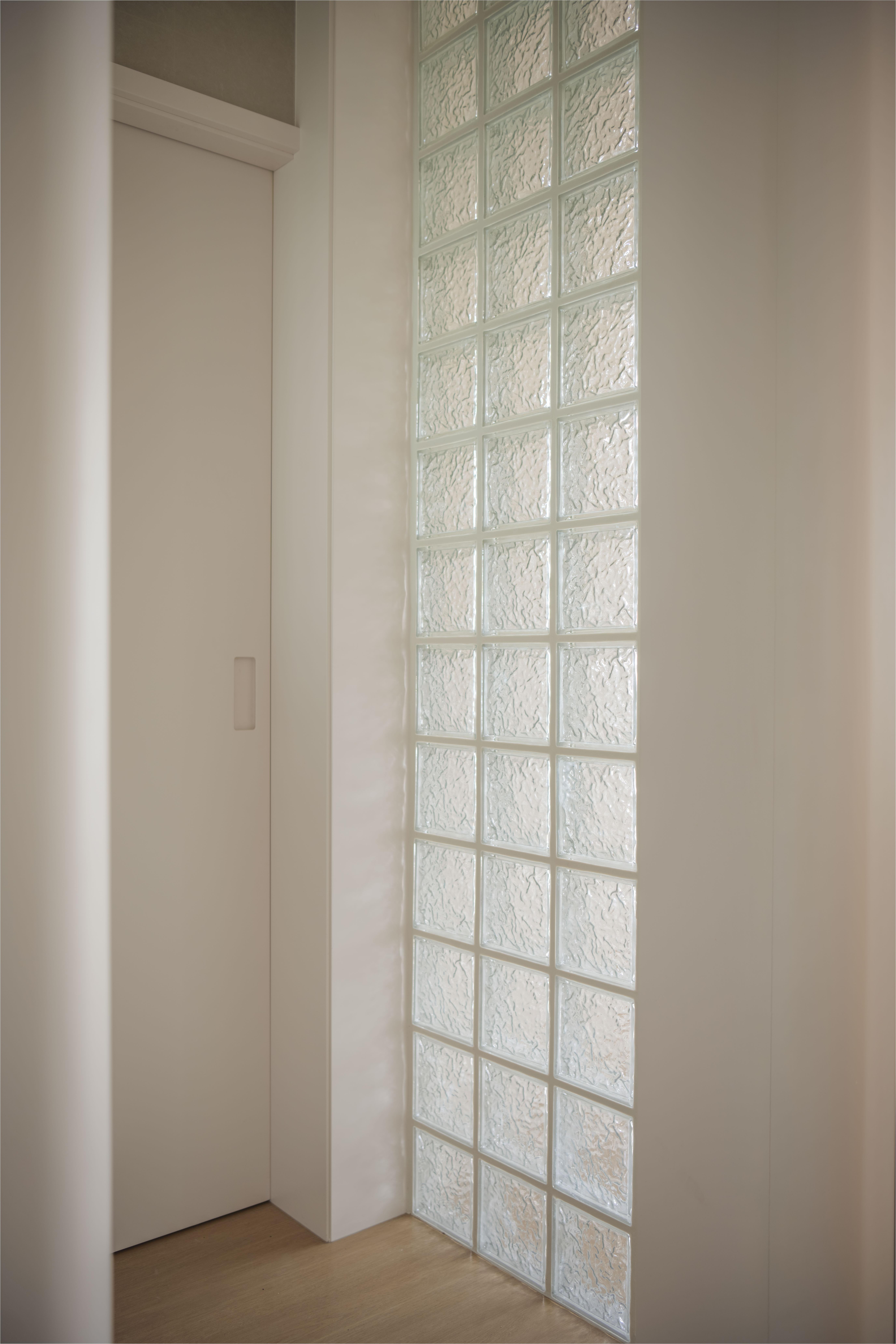 Upon entering, one is greeted by an elegant entryway that features a tall, integrated white cabinet, artfully combining a mirrored surface with a dedicated shoe storage area. On the opposite side, a striking semi-translucent glass brick partition gracefully guides you to the bathroom hallway, perfectly balancing the elements of light and privacy.
