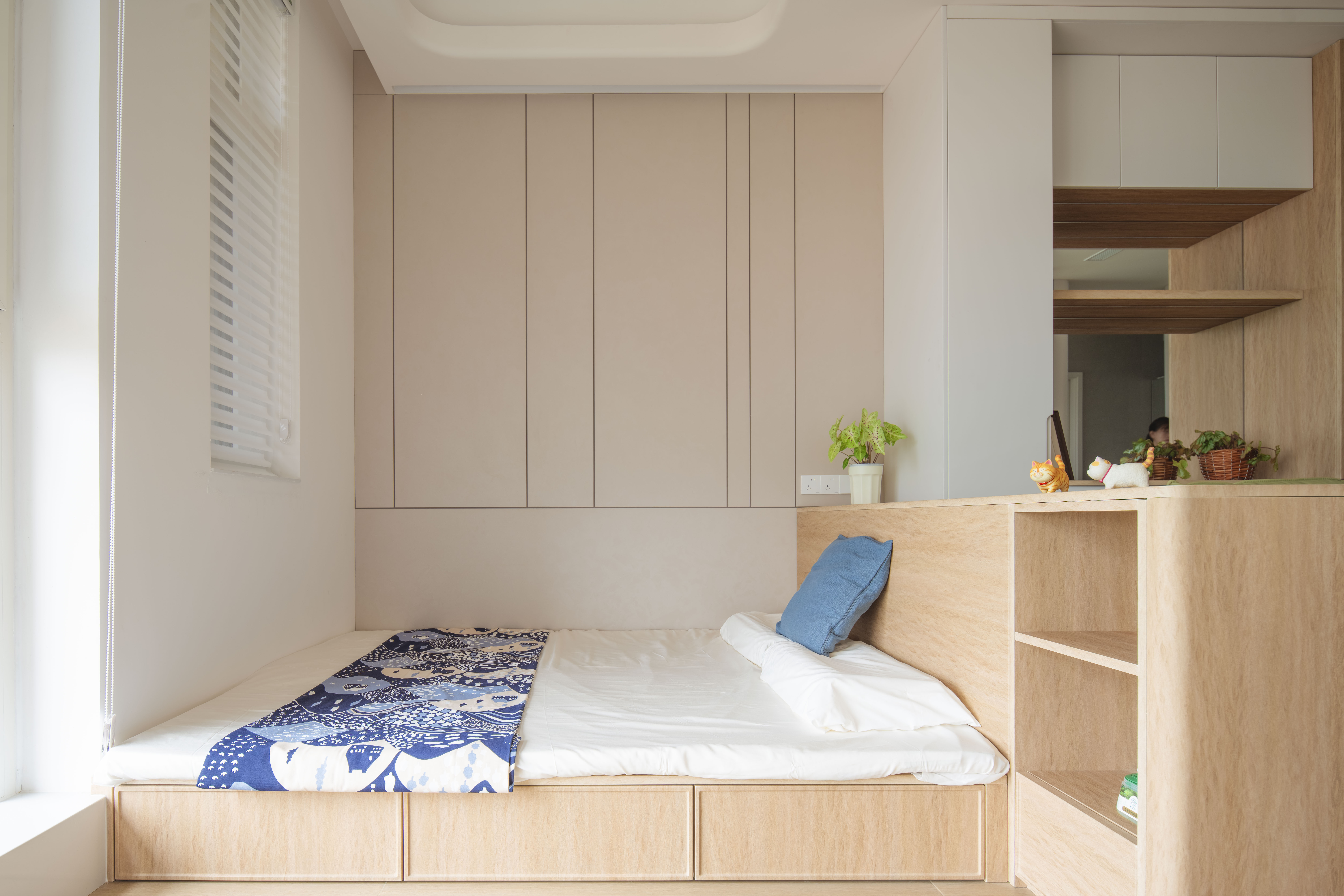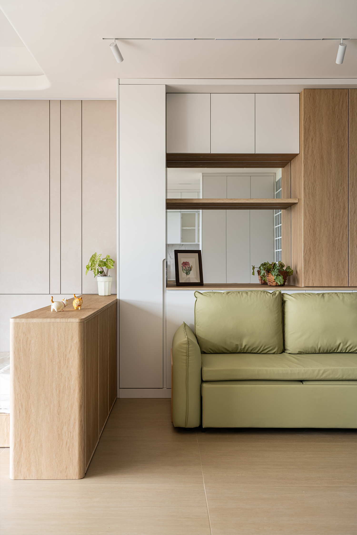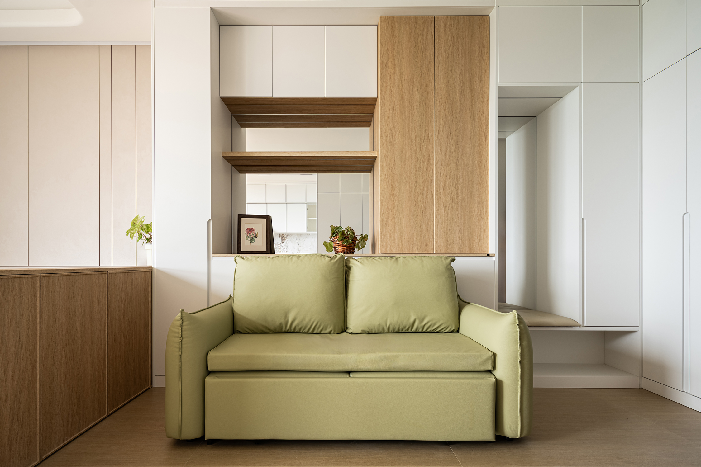 Transitioning into the living room, one will notice that the focal point is a richly hued mustard green sofa, which is harmoniously complemented by a composite wall. This wall integrates wood-grain cabinets, open shelving, and strategically placed mirrors that enhance the sense of spatial continuity throughout the room. Moving into the open-plan bedroom, differentiation is achieved through a half-height, gracefully curved cabinet paired with a low wooden platform bed. This thoughtful design choice not only preserves an airy openness but also offers concealed storage solutions, cleverly merging aesthetics with functionality.