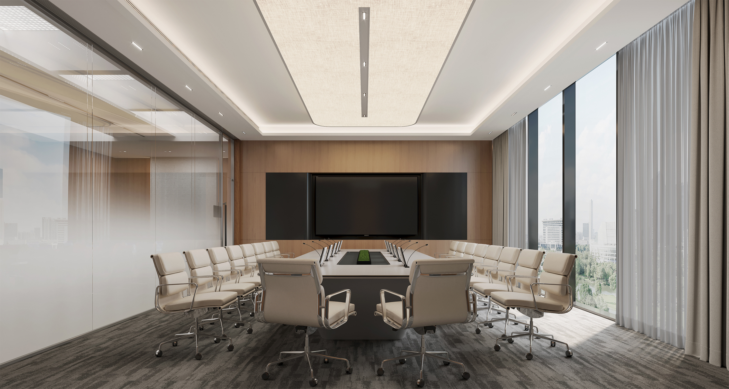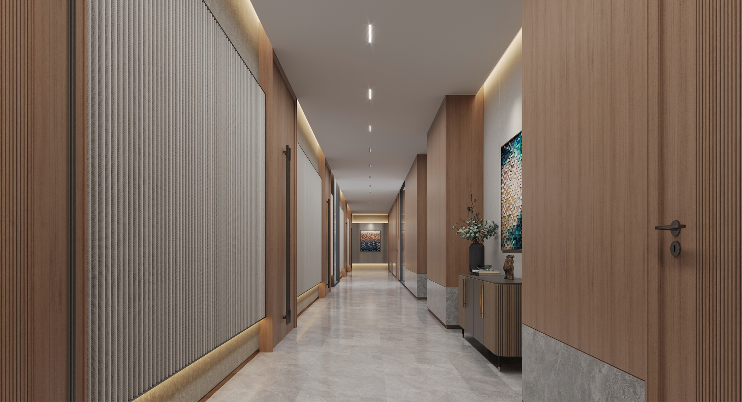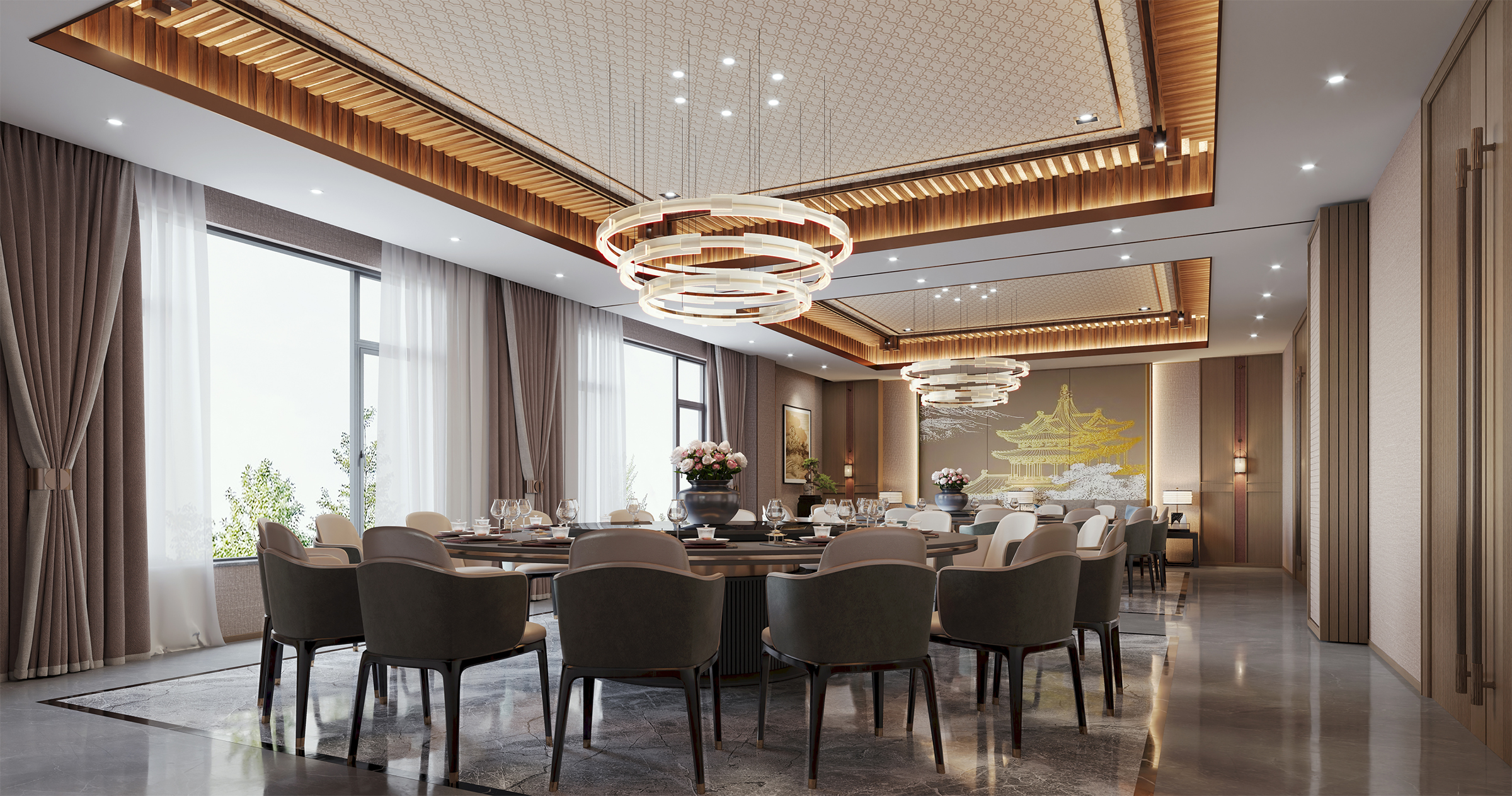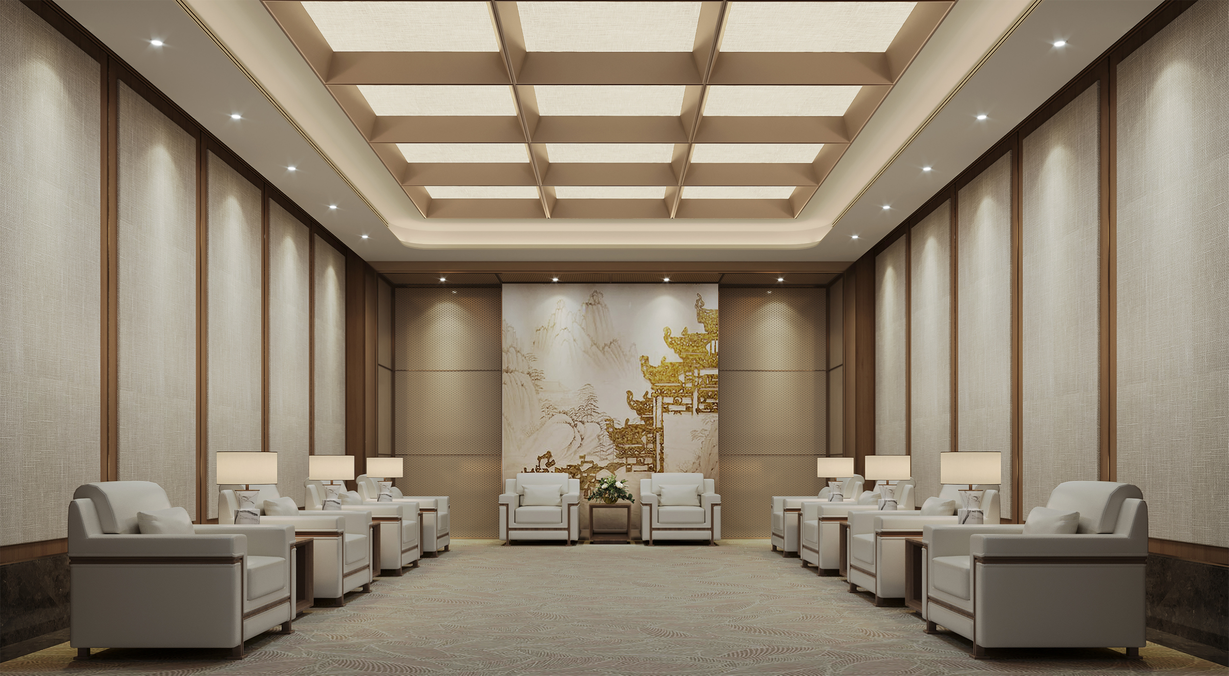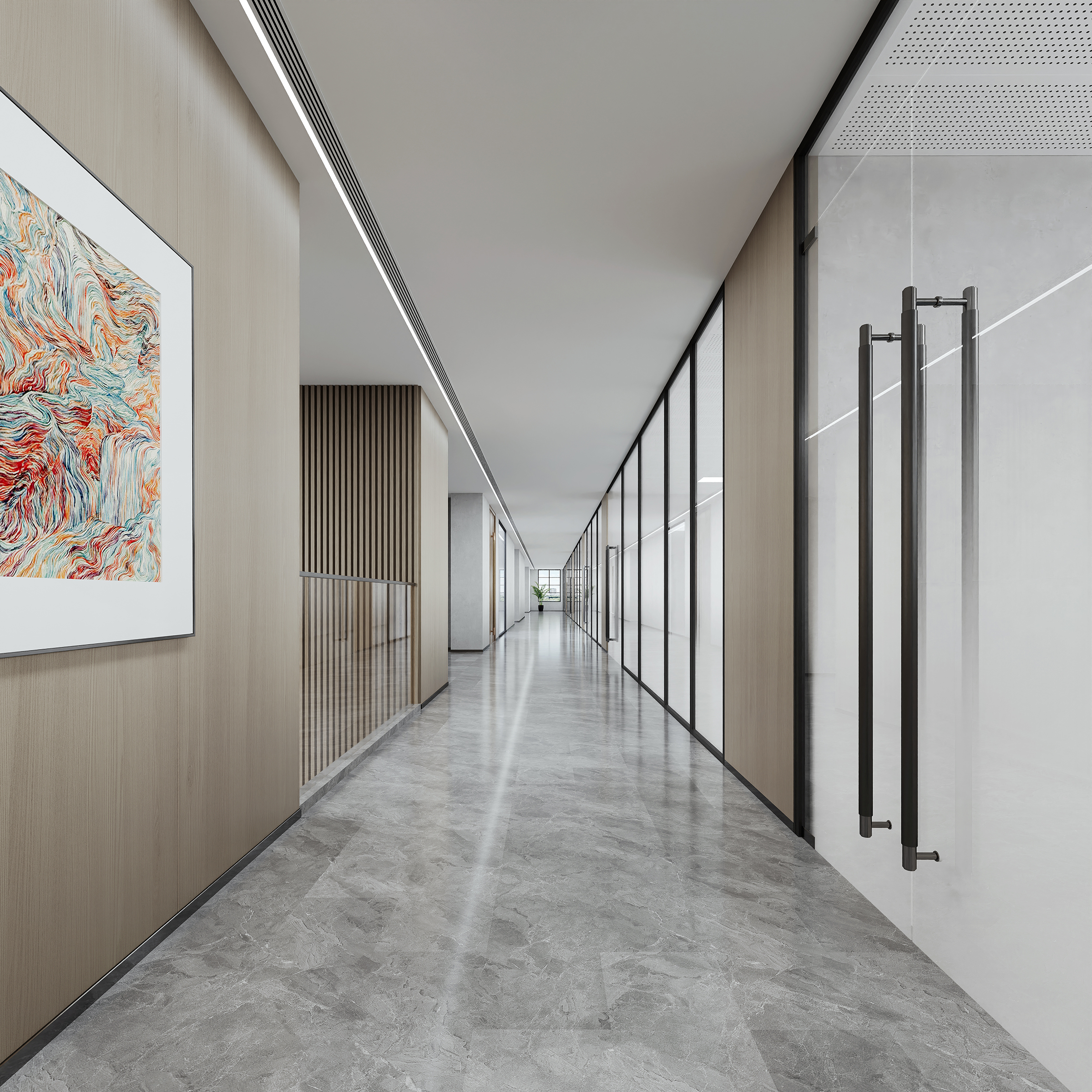 The decoration and renovation project of Bailin Park 1 # and 2 # is located in Bailin Park, Yubei District, Chongqing. The total construction area is about 5100 square meters, with four floors, one underground and three above ground. This project is carefully planned based on the diversified needs of the fund company, and the first floor will create an internal cafeteria and supporting facilities for the fund company, providing employees with a convenient and comfortable dining environment; On the first floor, a grand entrance hall for fund companies is set up, and a coffee shop that can be opened to the public is also planned. The open multi-functional staircase communication area running through the two floors at the end of the coffee shop not only becomes a visual focus, but also creates an open space for diverse communication. The second floor focuses on the office and conference functions of fund companies to ensure efficient work; The third floor is responsible for external reception and meetings, showcasing the corporate image. The design style is deeply in line with the characteristics of the fund industry, with a modern, efficient, and concise tone, using simple and smooth lines and high-quality materials to create a professional and stylish spatial atmosphere.