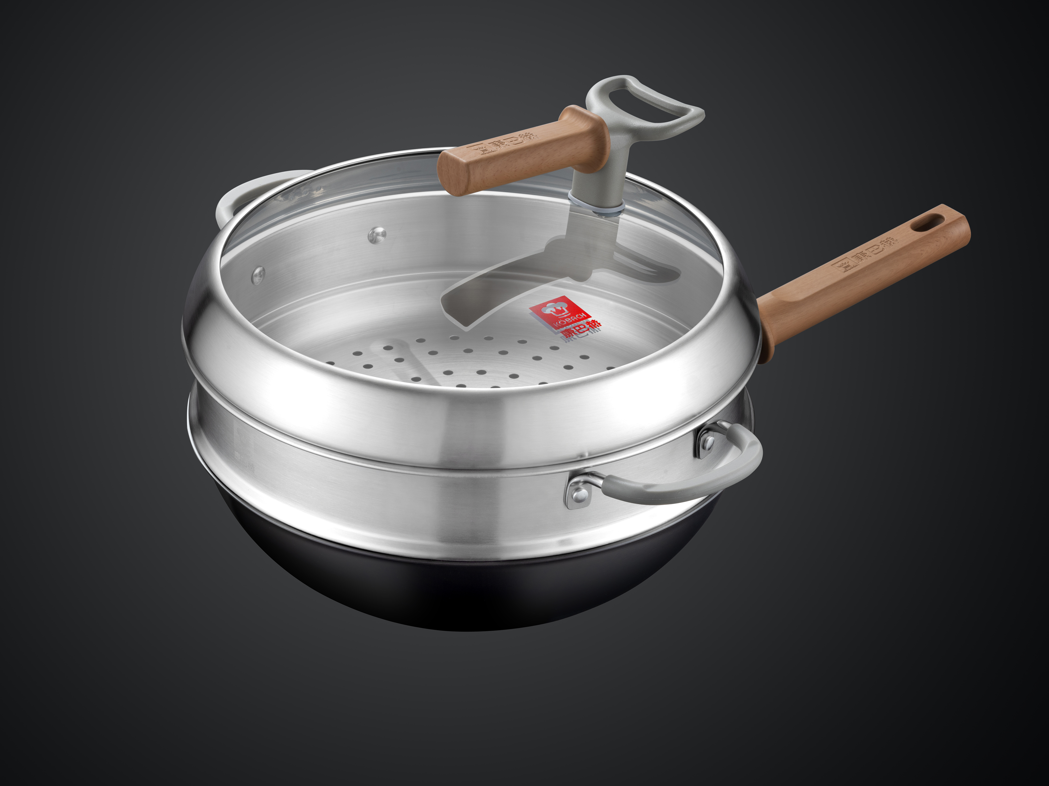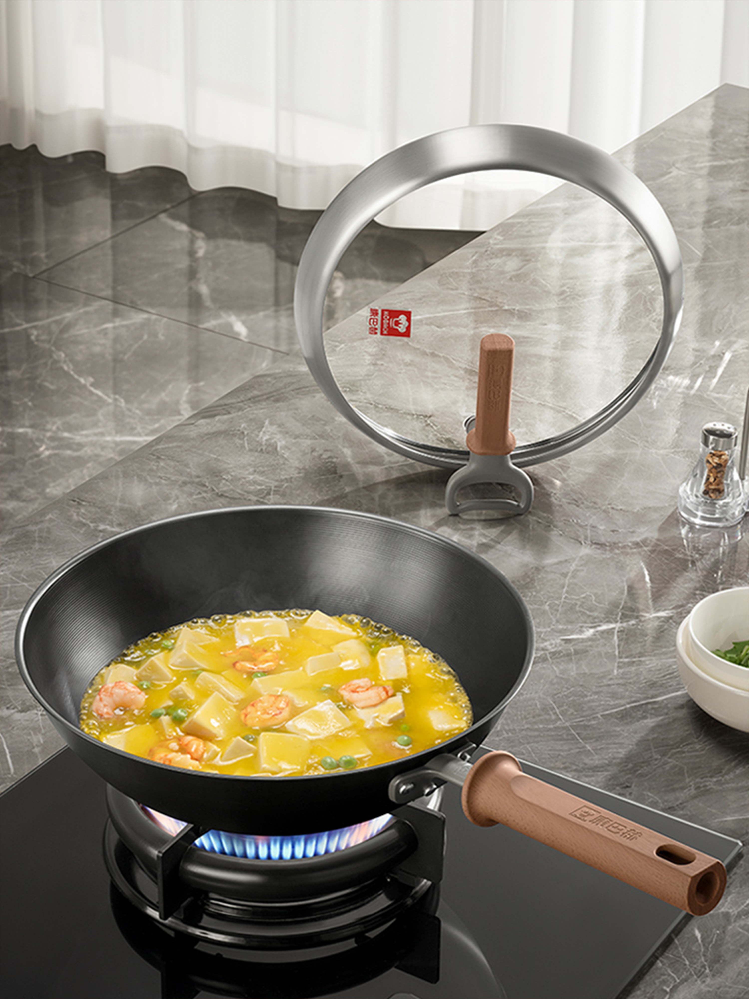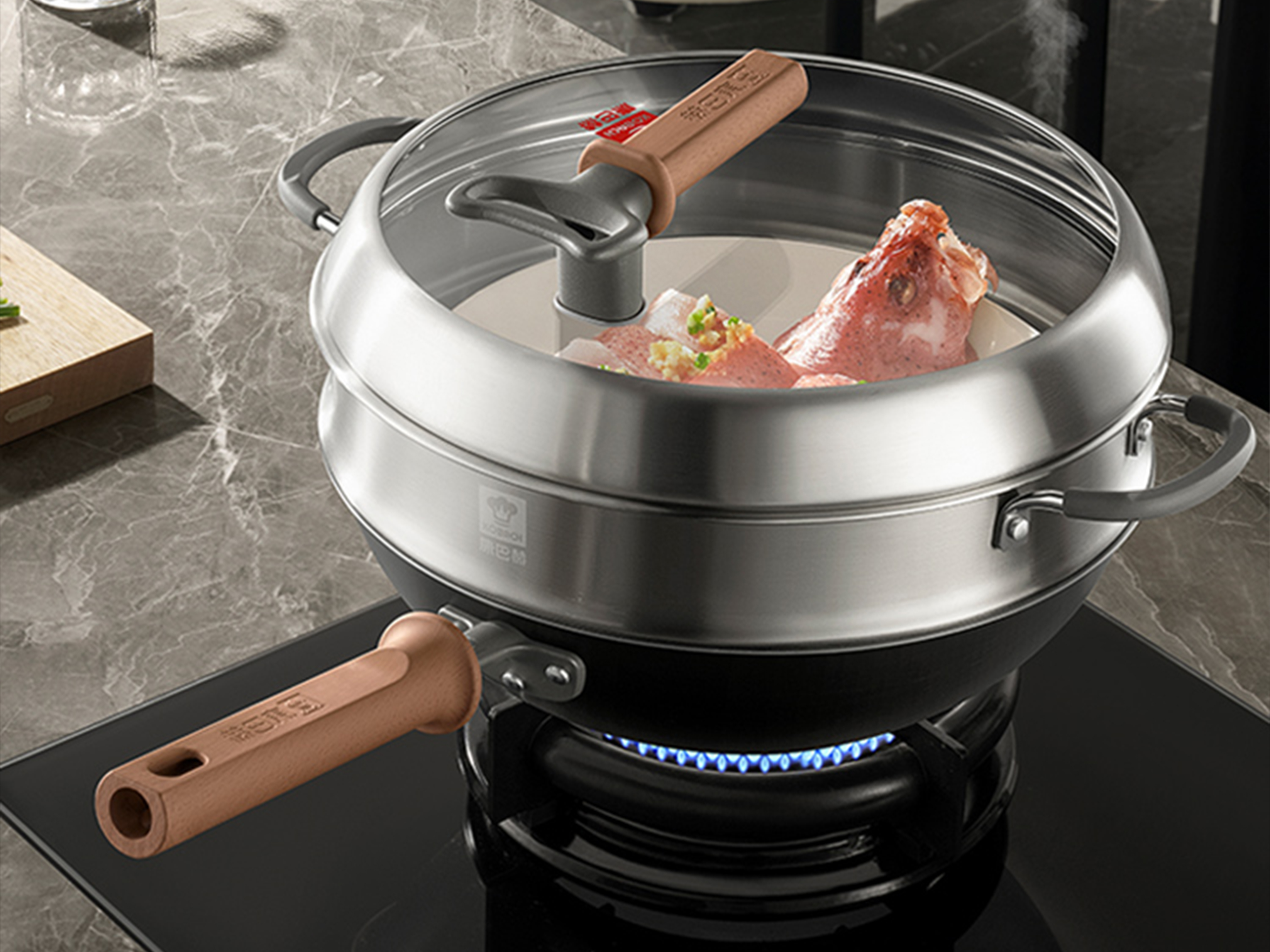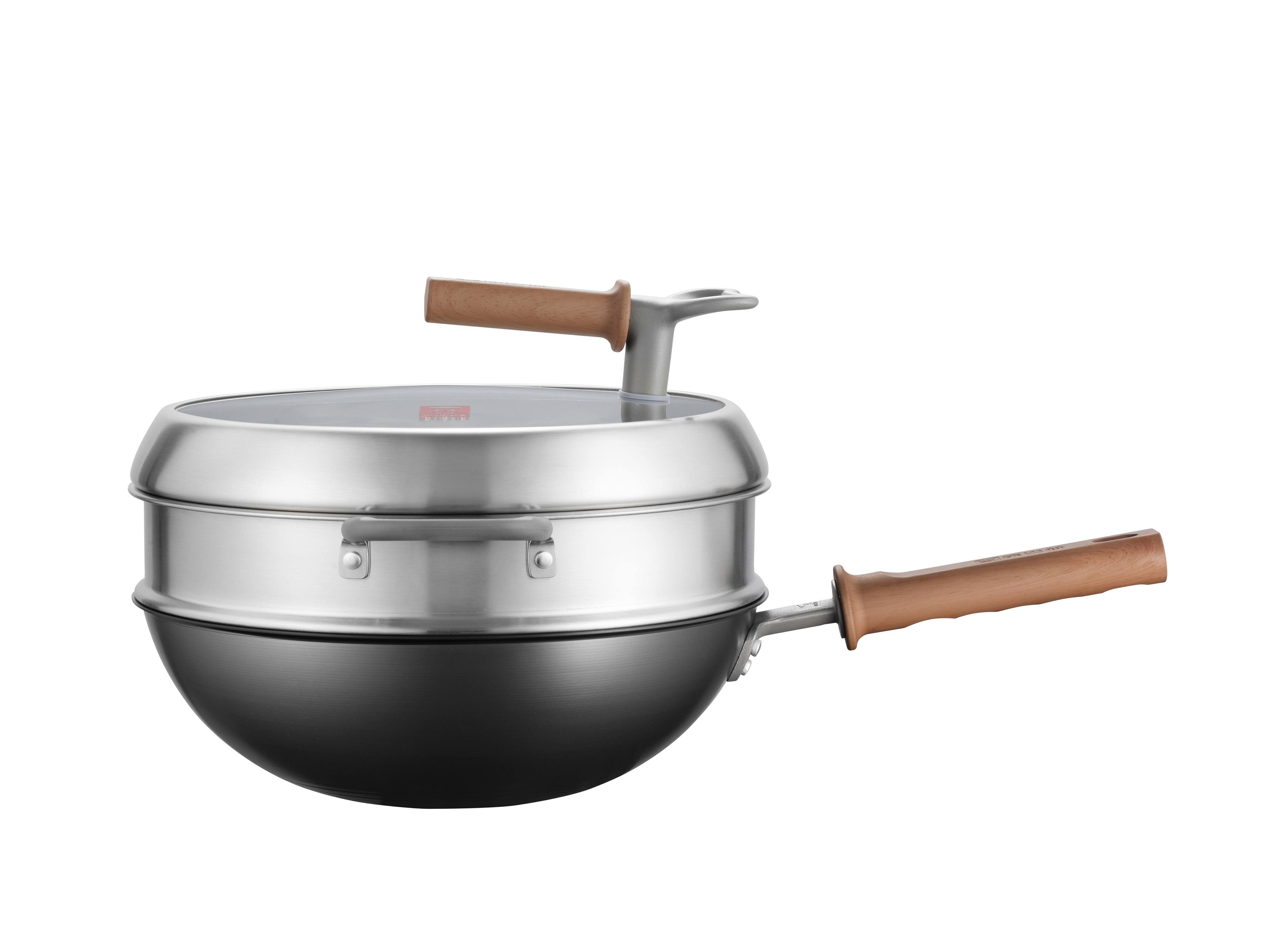 Structurally, the wok handle is ergonomically designed with a finger positioning groove and a 7mm front-end heat-insulating wall, offering a secure grip and reliable protection during vigorous tossing. The wok body is optimized for efficient thermal performance, with a 1.8mm thick base and 0.6mm thin walls formed by CNC spinning for even heat distribution and noticeably reduced smoke. In addition, the high-arch lid and deep steam rack provide 13cm of usable height, easily accommodating a whole chicken or multi-tier dim sum—making it fully suited to a wide range of Chinese cooking techniques.