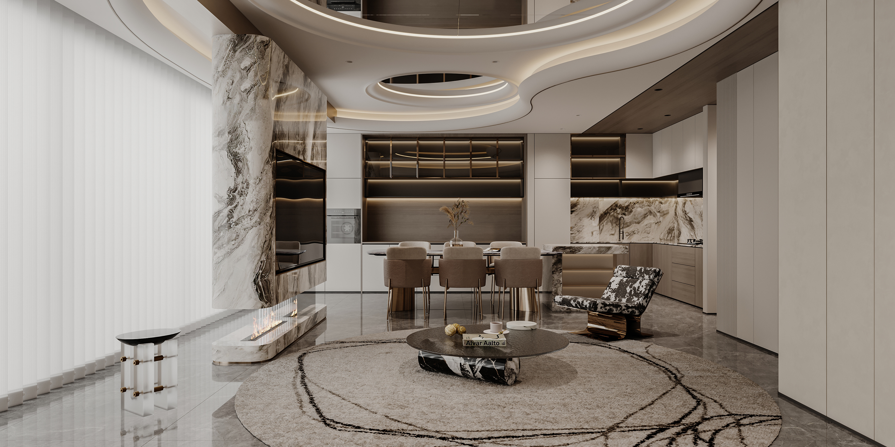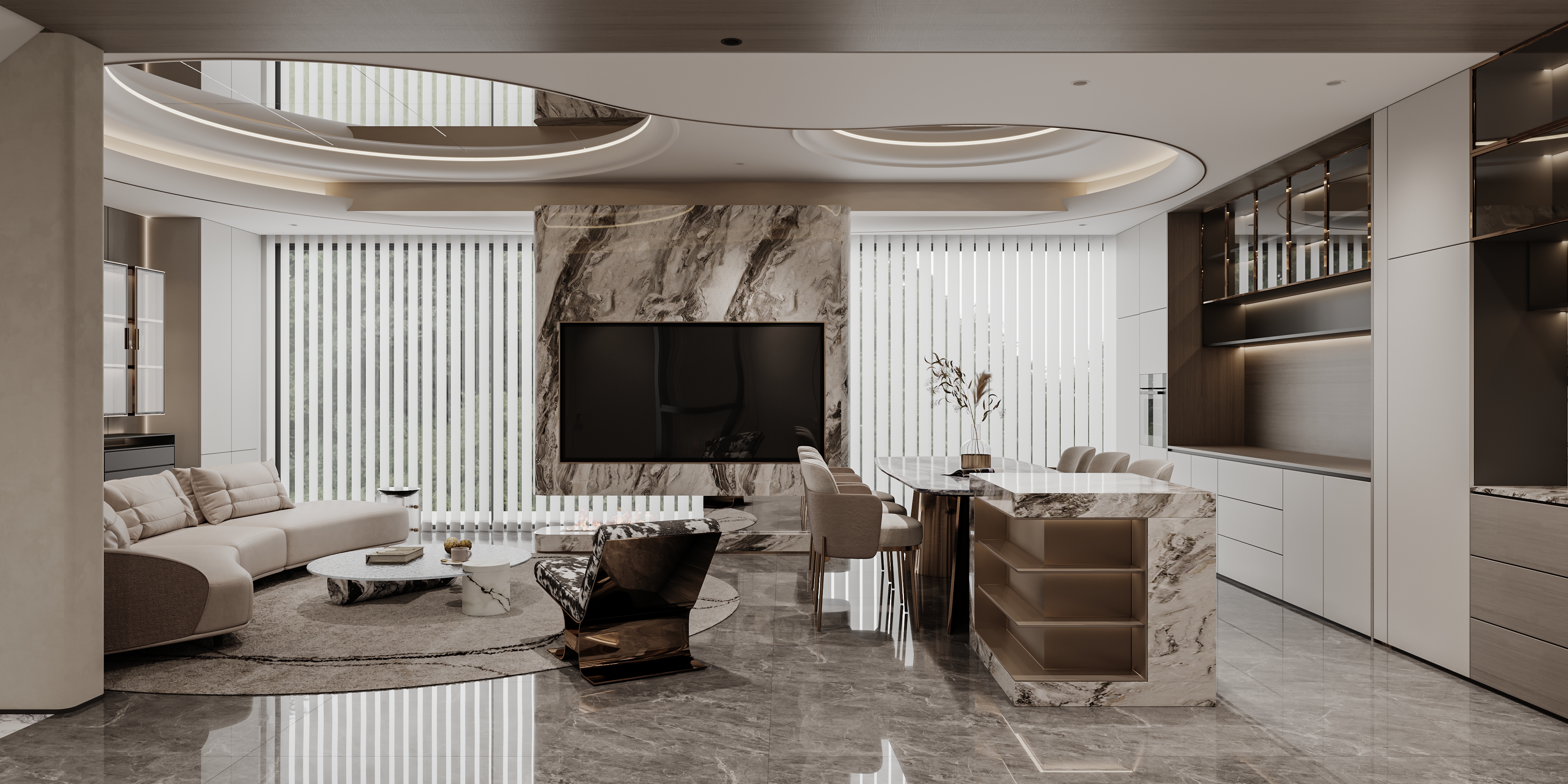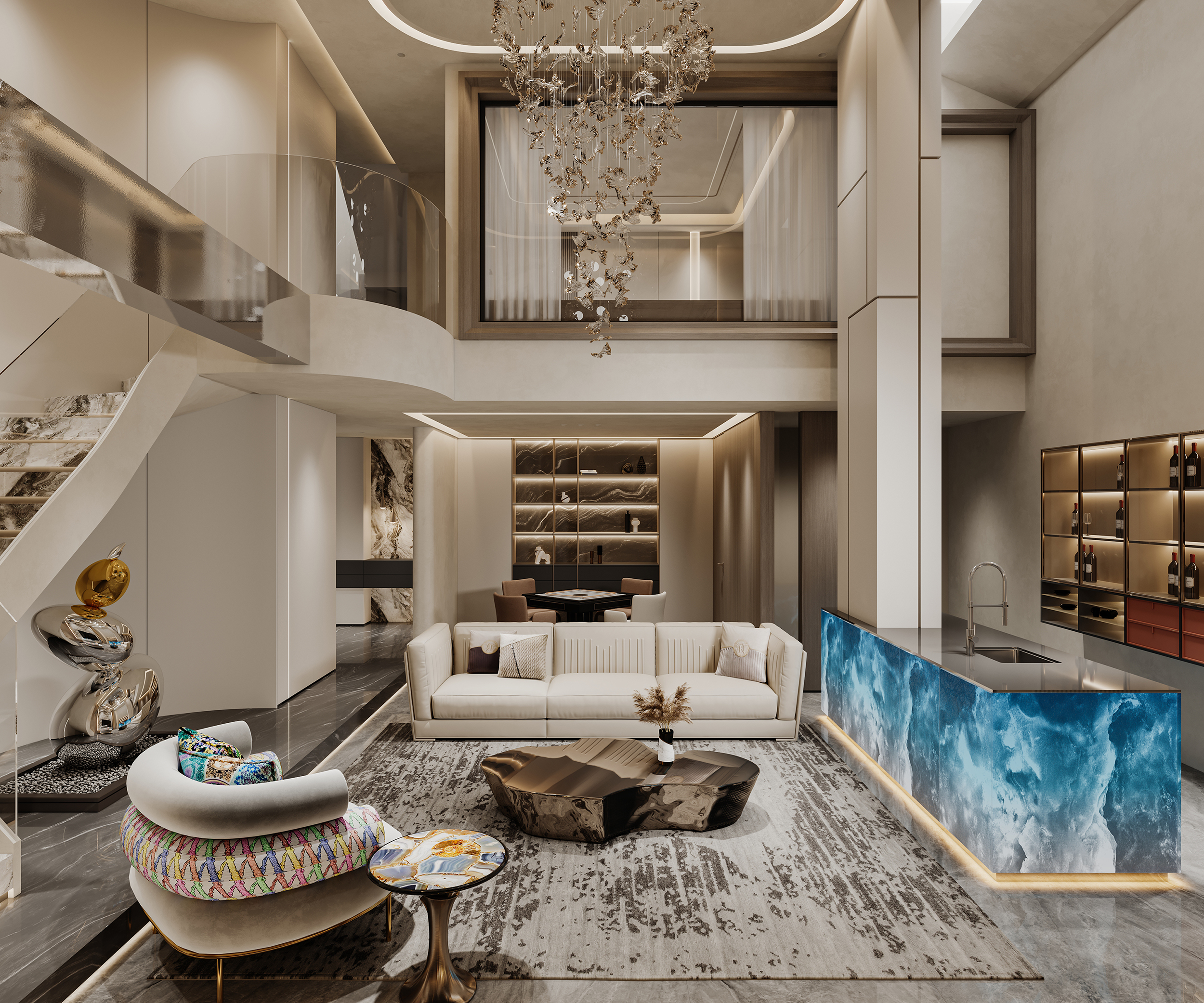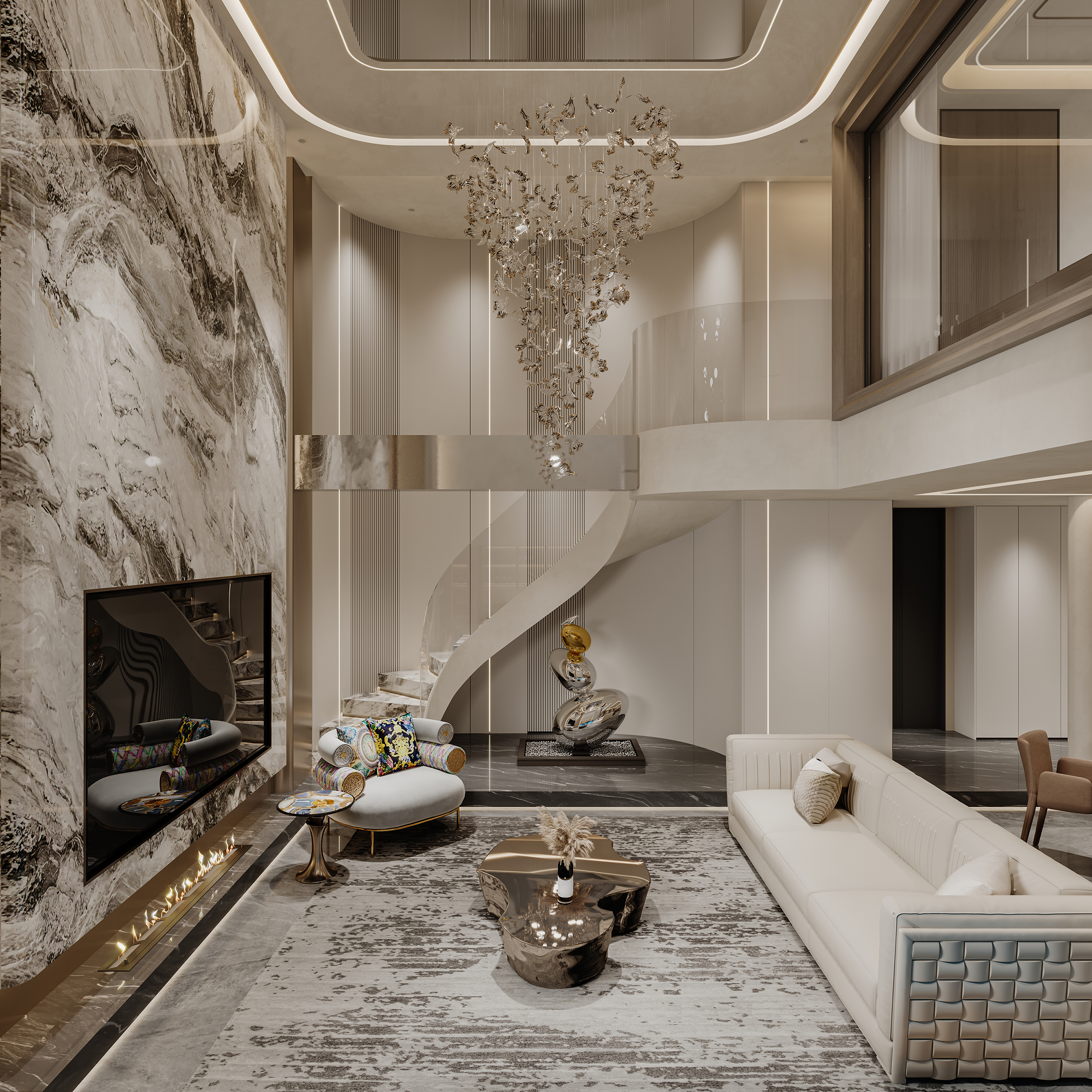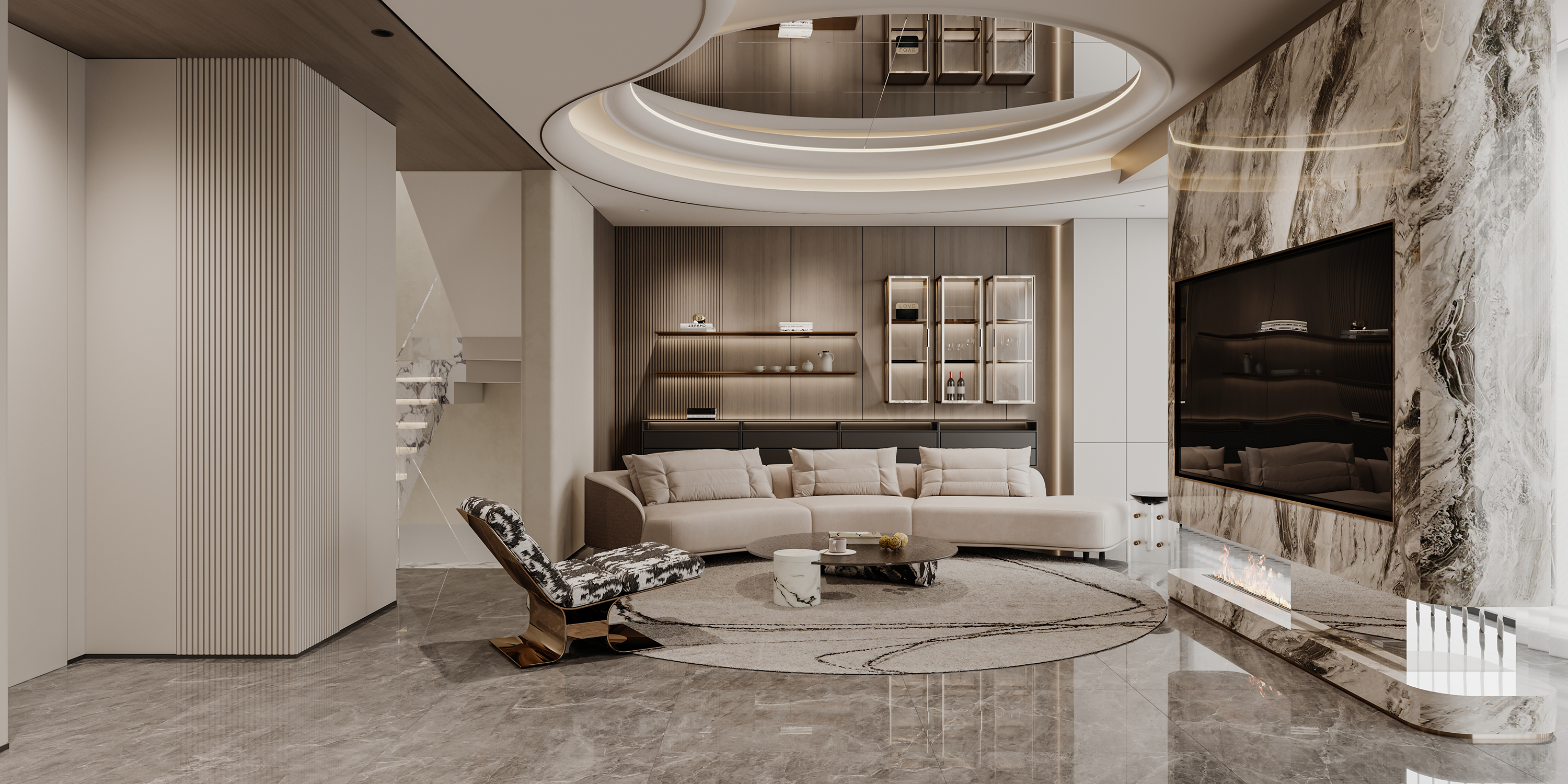 In its planning, the double-height living room and the floating spiral staircase establish a vertically extended, flowing circulation path, maximizing spatial tension. The landscape-like veining of the feature stone wall echoes the crystalline transparency of the sodalite bar counter, reinforcing thematic cohesion.