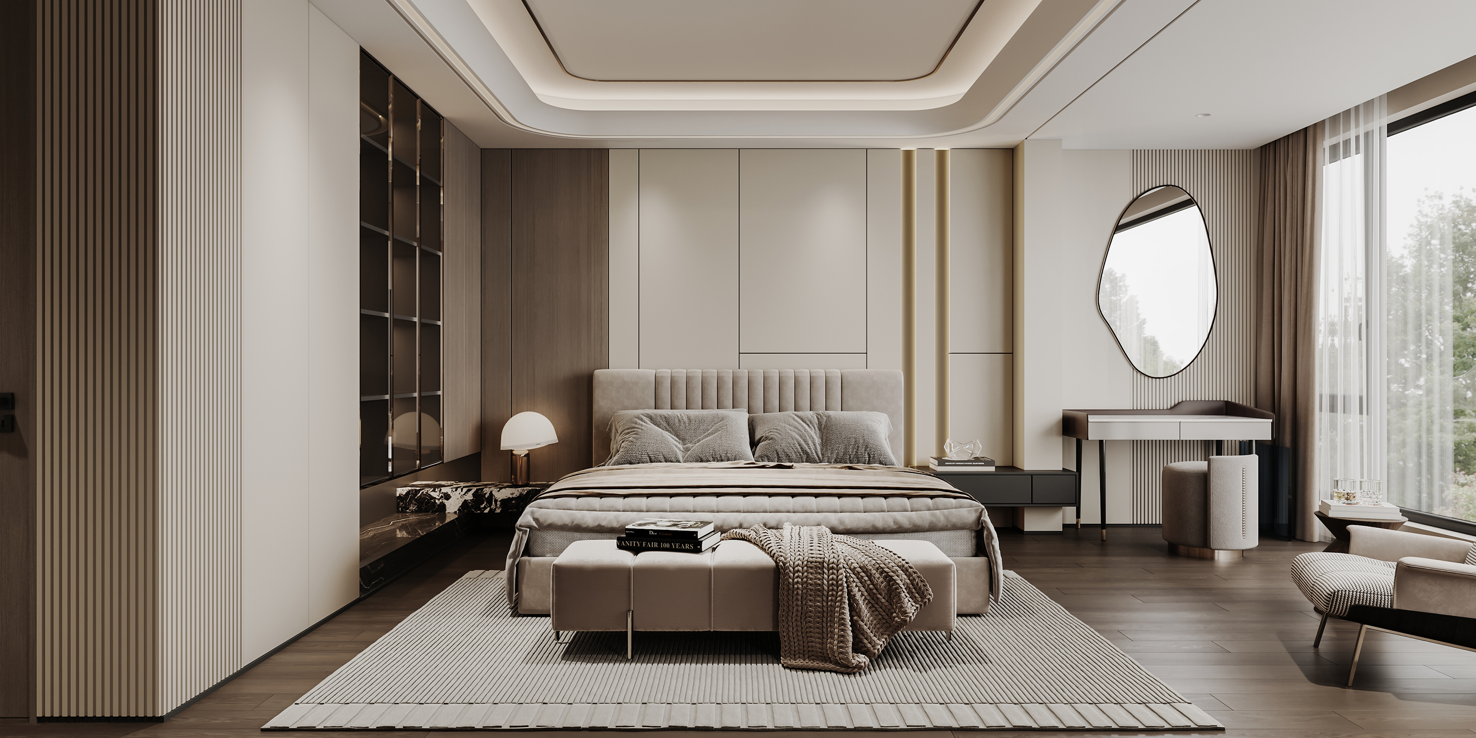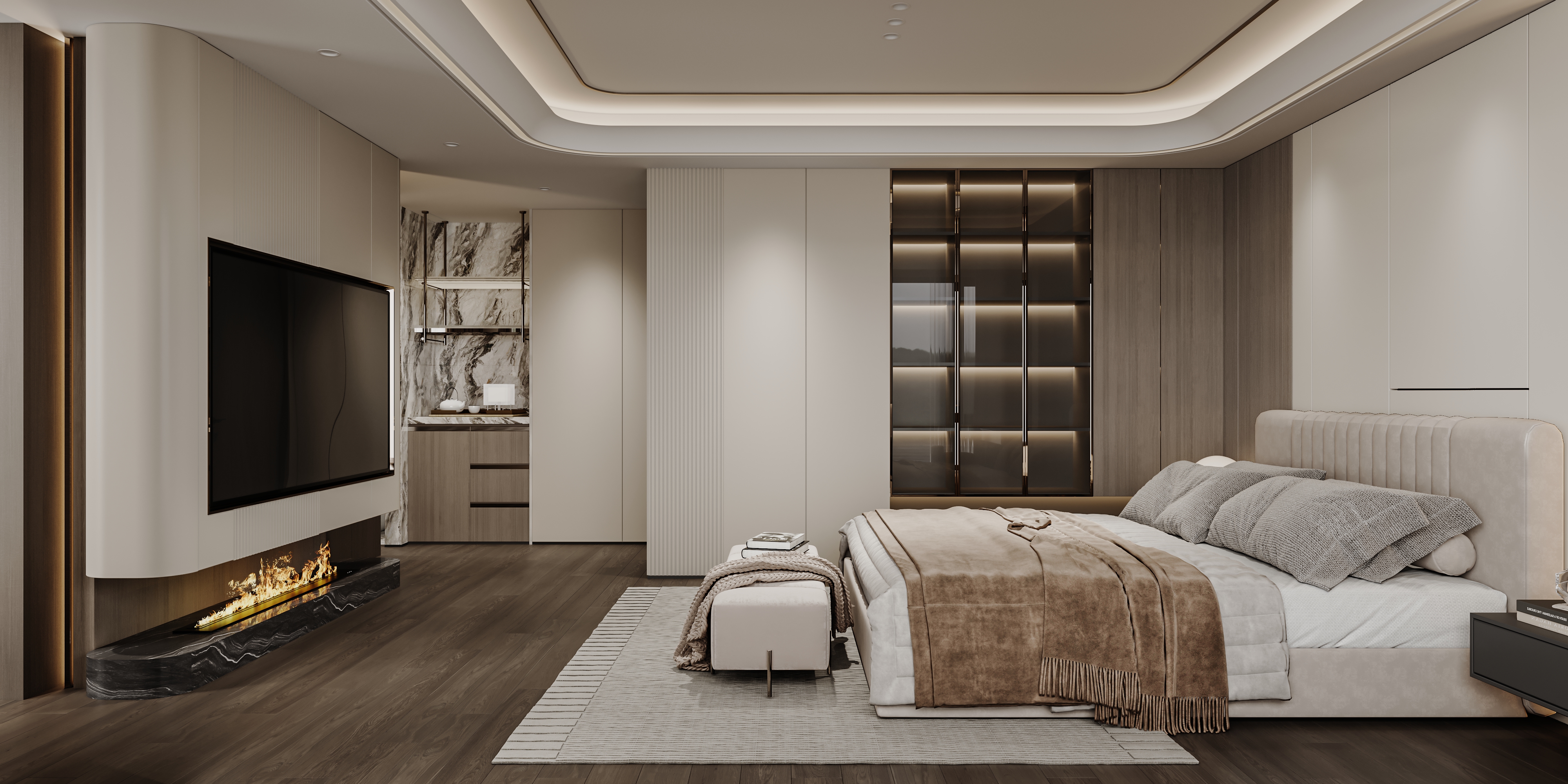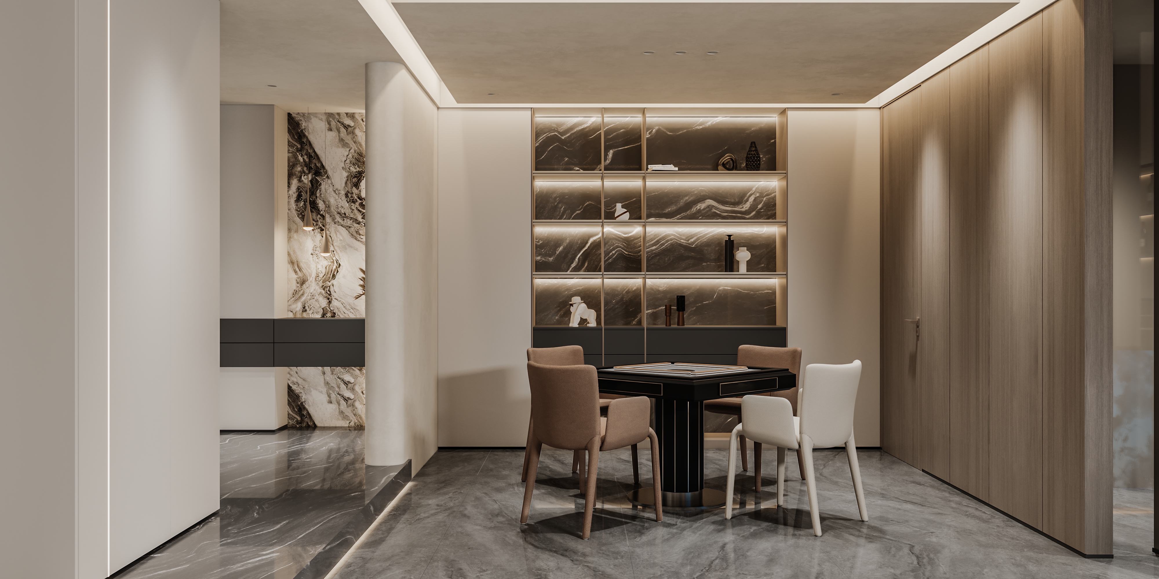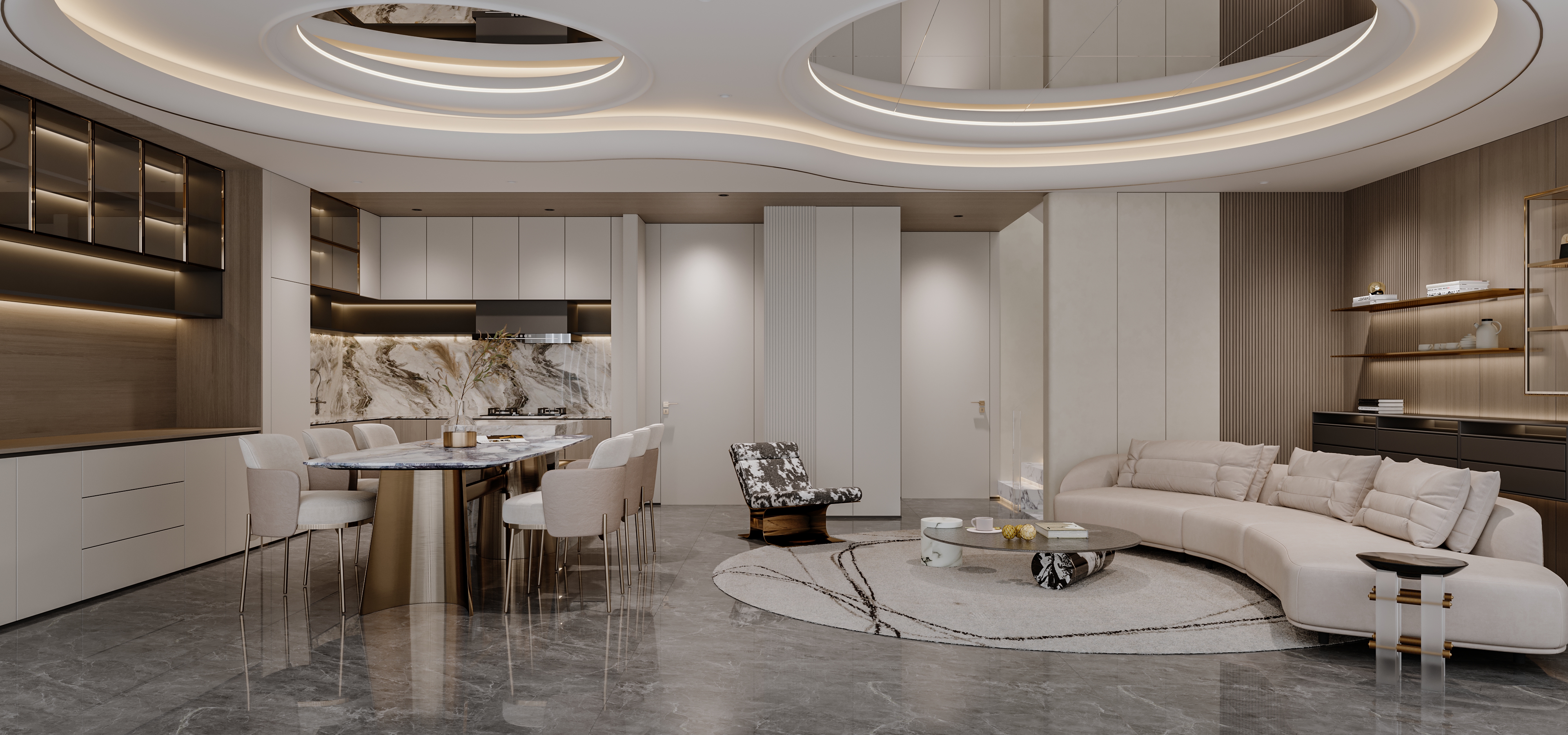 This project, titled "Rhythm of Light," employs a groundbreaking design concept that transcends static spatial definitions to create a contemporary luxury residence that seamlessly blends artistic aesthetics with lived-in warmth. A base palette of beige and warm grey is accentuated by metallic finishes and natural stone textures, achieving a delicate balance between rational order and the emotional interplay of light and shadow.