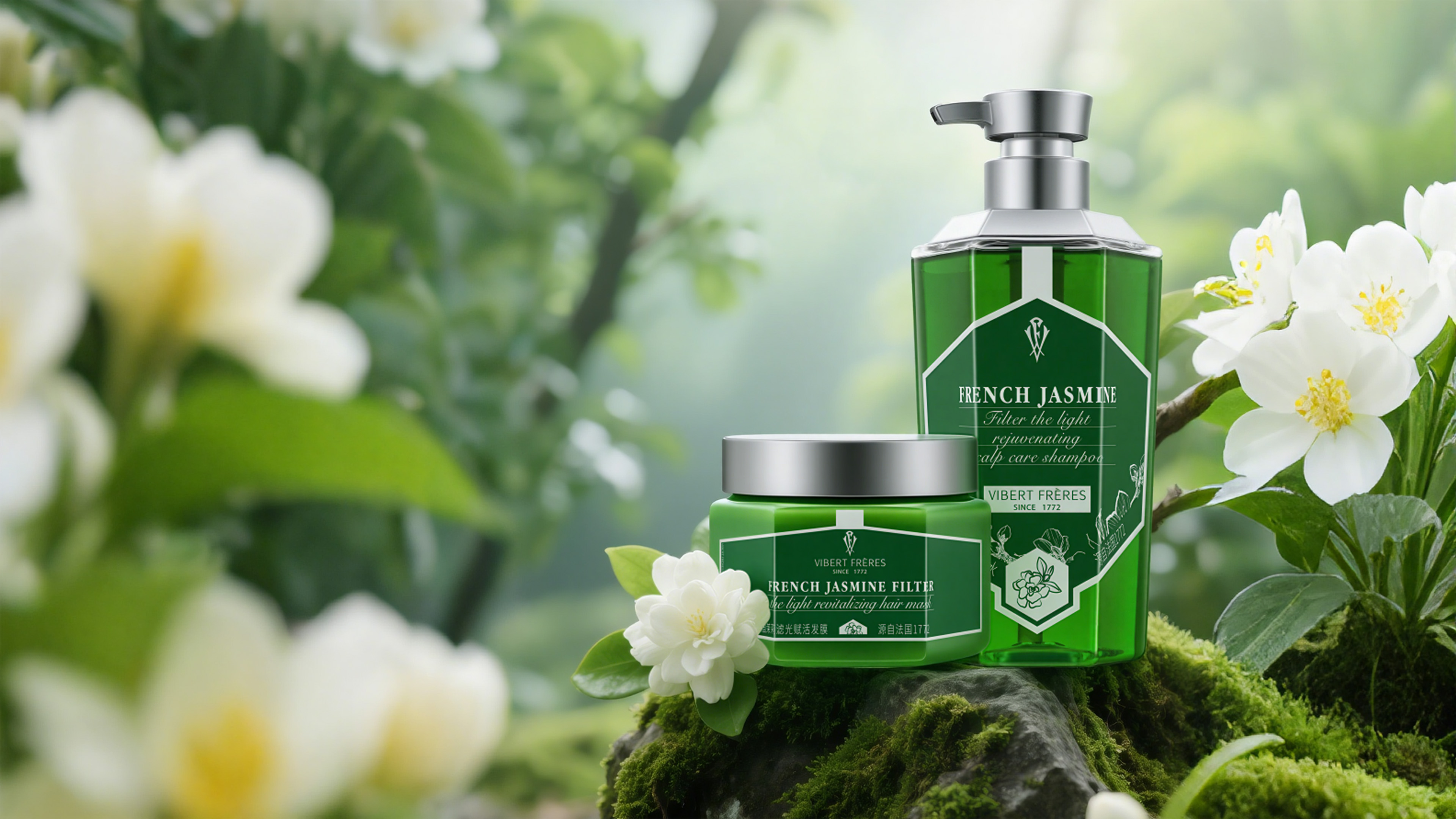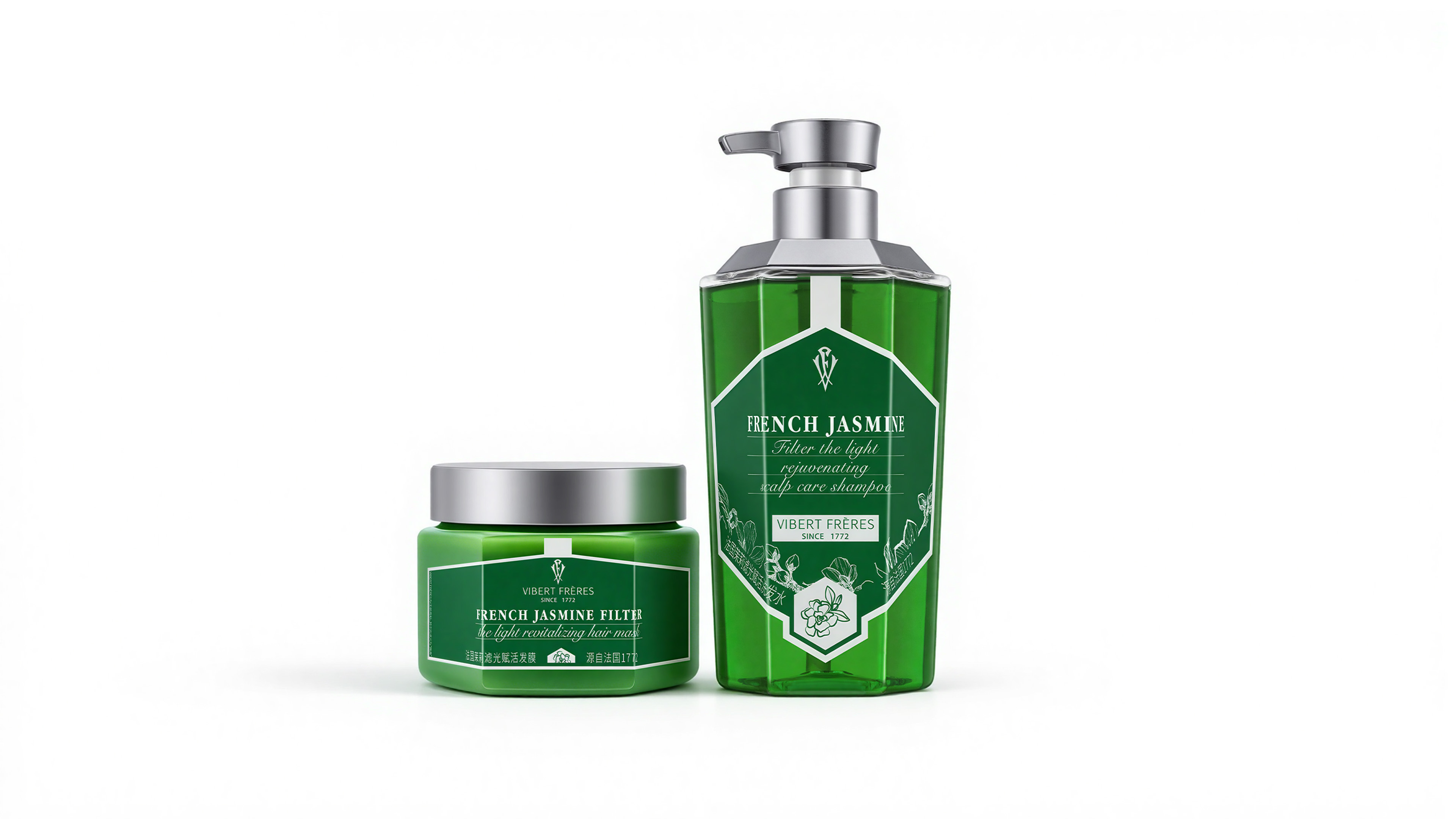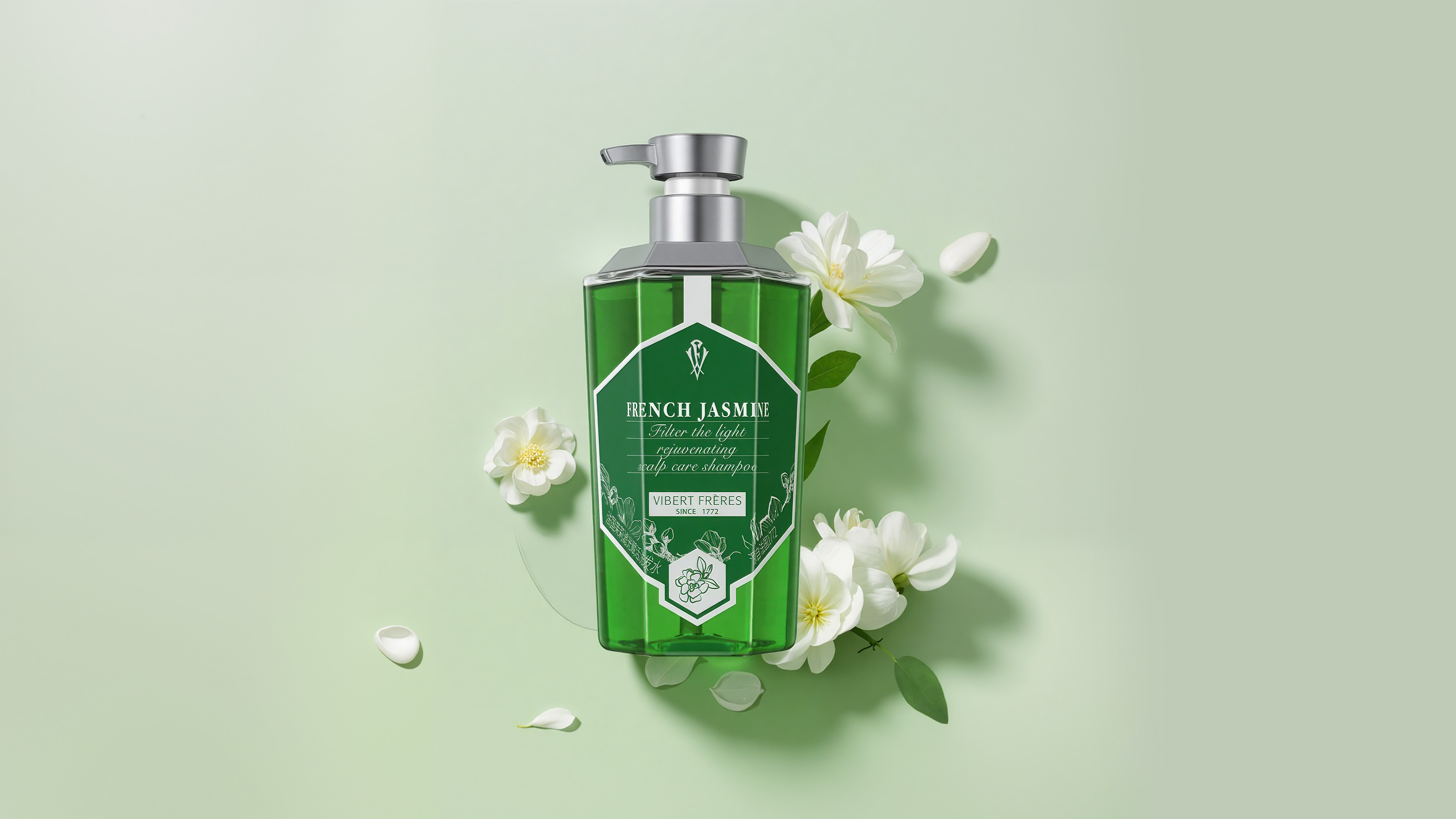 The primary color of the series is a deep, vibrant emerald green, symbolizing nature, botanicals, and purification. It precisely communicates the oil-controlling and clarifying efficacy of the jasmine essence. This highly saturated hue, distinct from common pale greens, underscores the product's premium and high-performance positioning.
