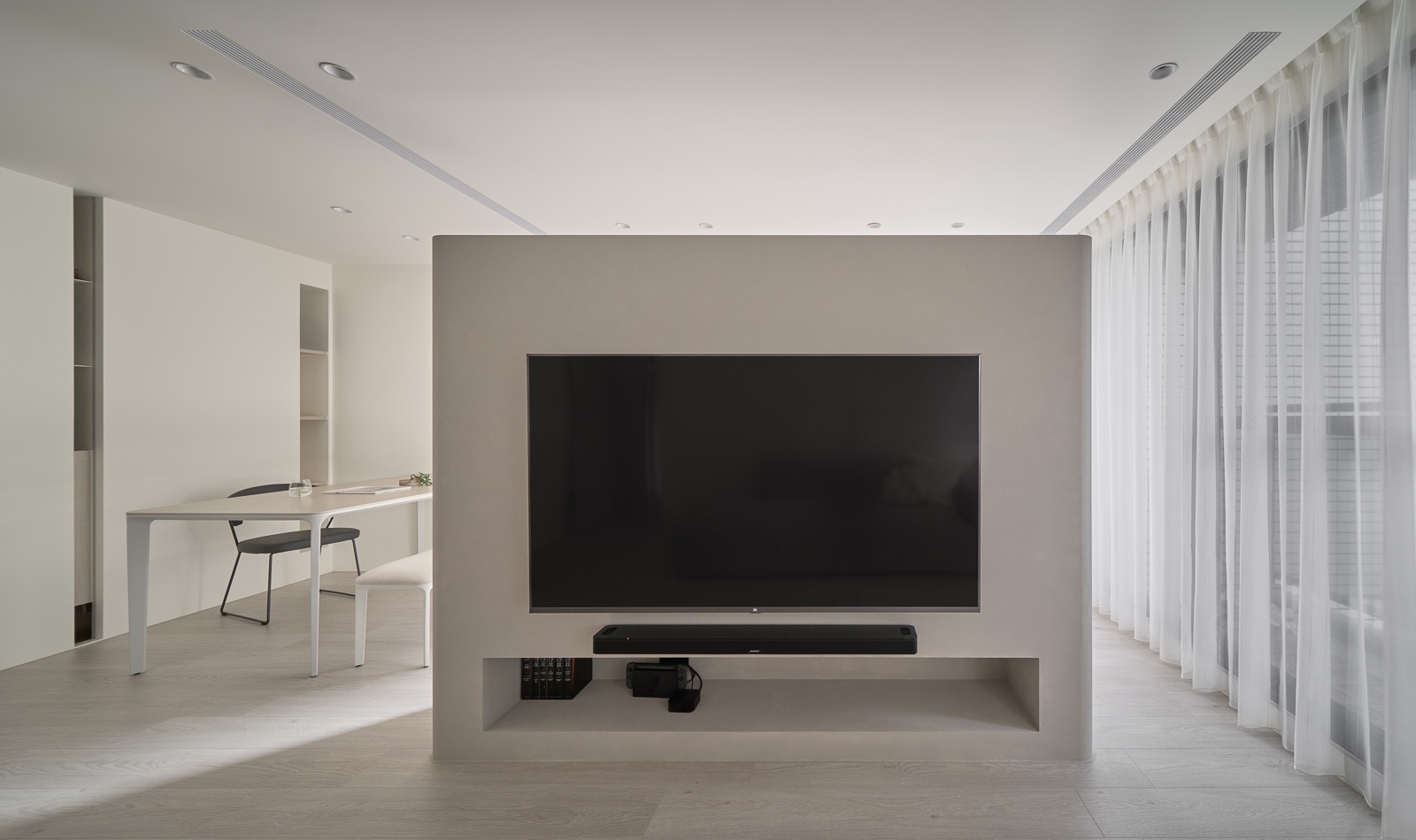 為了突破傳統格局限制,我們將客廳電視牆昇華為一座多功能雙面中島。它不僅承載了影音娛樂功能,更成為界定客廳與後方區域的核心動線與視覺端景。巧妙地區隔了空間使用,卻又透過其獨立結構,保持了視覺上的輕盈與流動,避免了實體牆面的壓迫感。