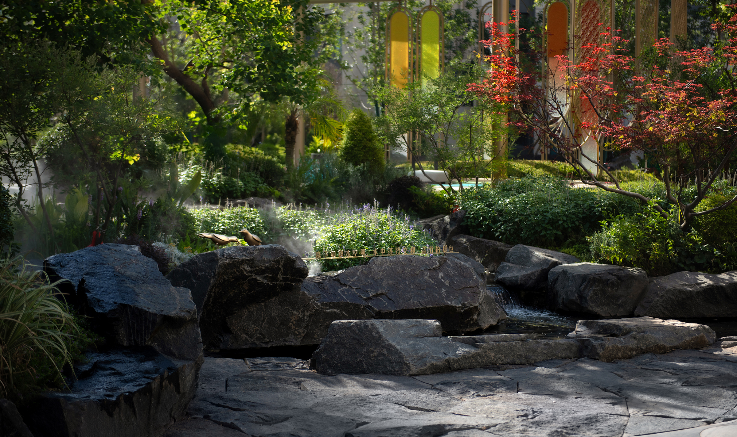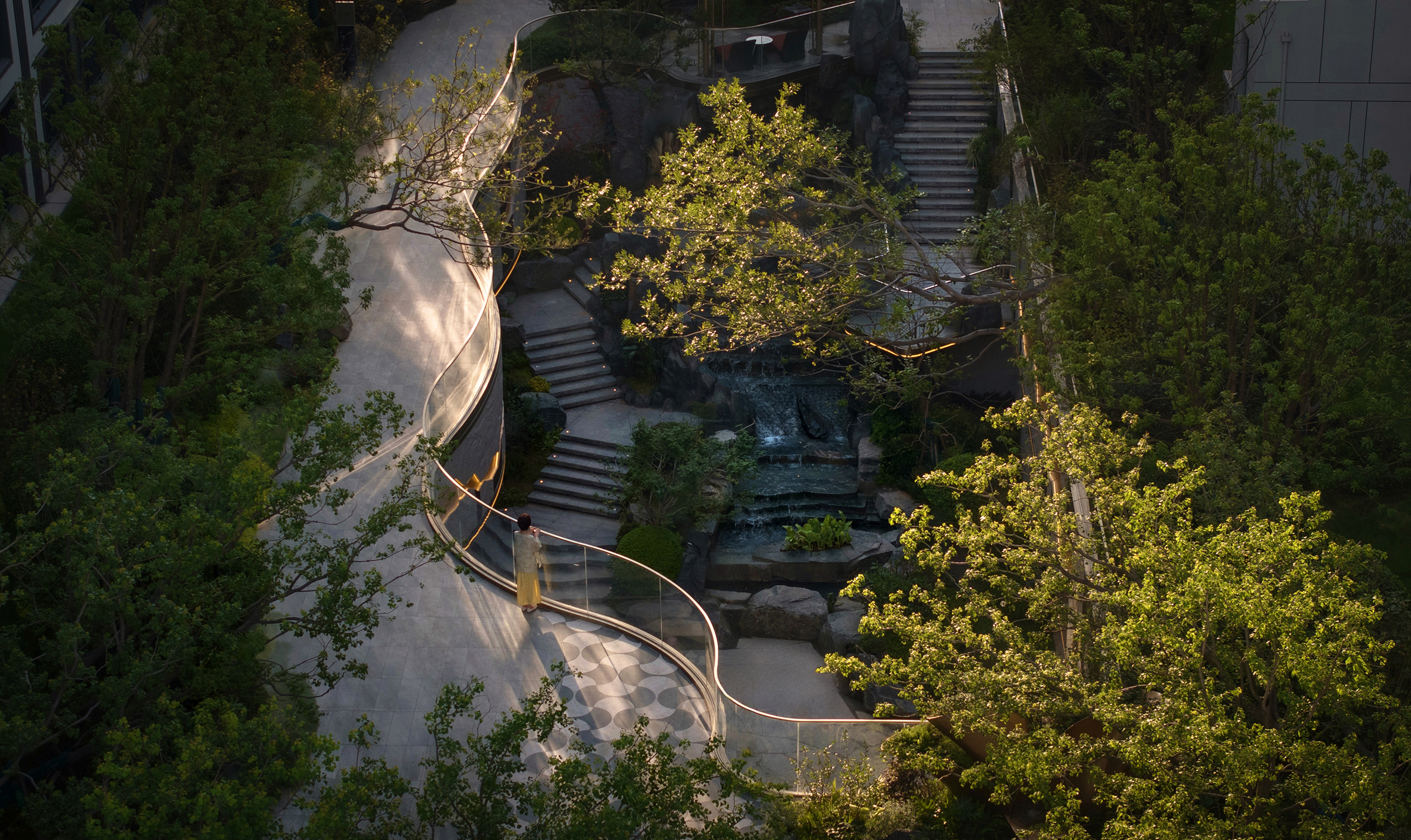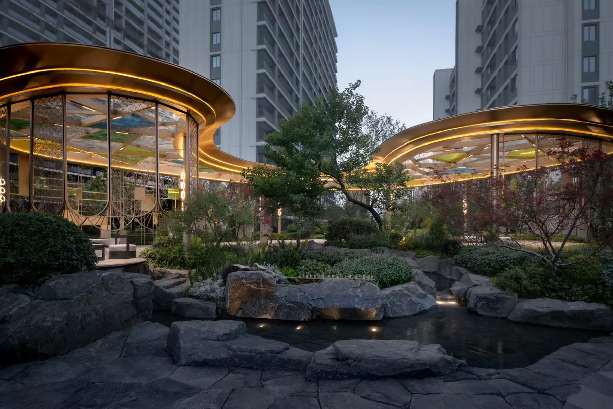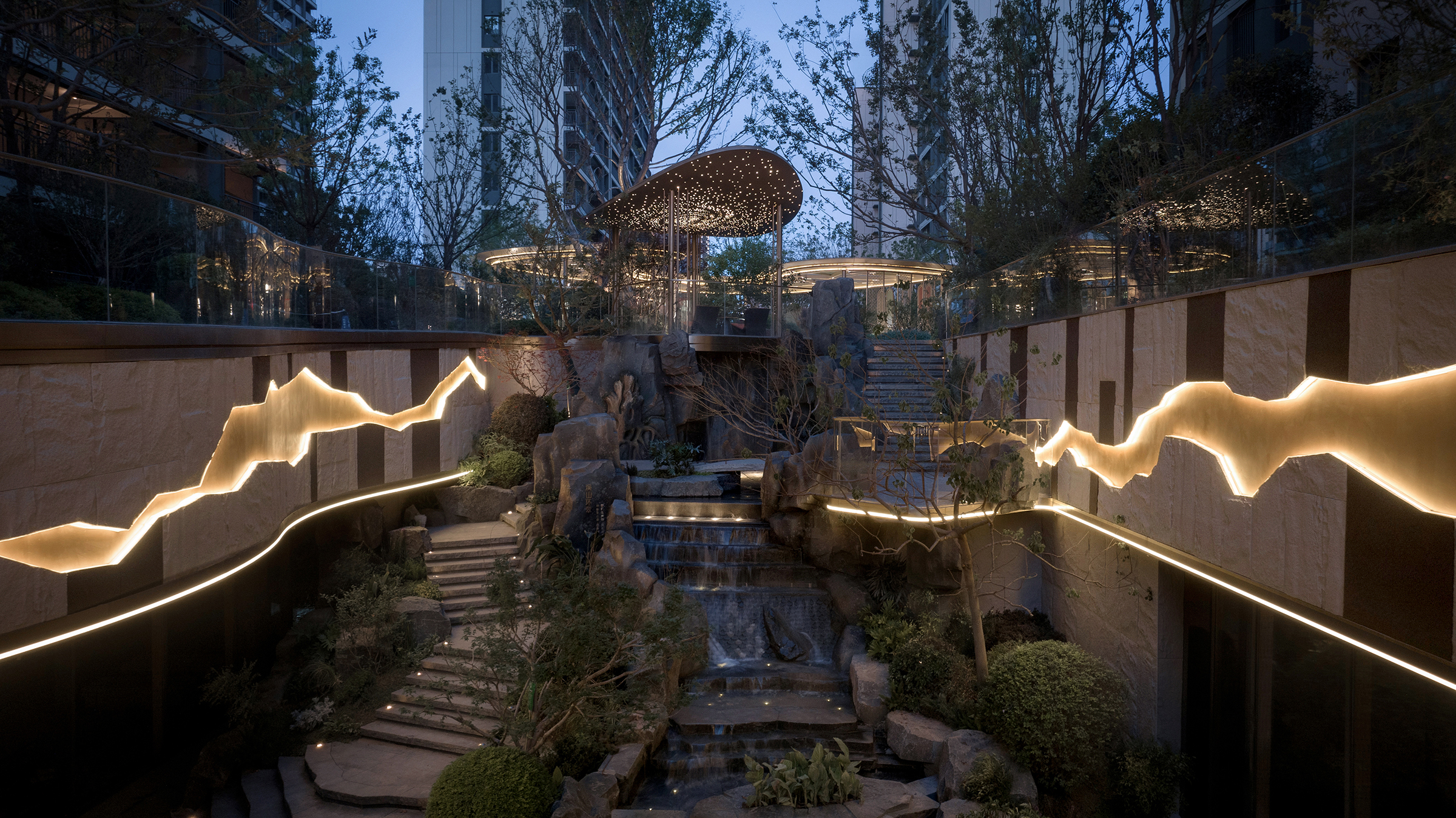 Guided by the narrative of “awakening the river, where ten thousand forms arise,” the landscape creates a journey through flowing water, layered greenery, and poetic spatial sequences. Visitors move through scenes that evoke drifting boats, moonlit waves, maple reflections, and floating islands. Inspired by traditional symbolism—rising steps for honor, magnolia blossoms for prosperity, fish leaping over the dragon gate for success—the design translates auspicious meaning into refined physical space. Water terraces, cascading falls, emerald stone, and layered visual corridors unfold like a living landscape painting, while natural-light strategies, open ventilation paths, and layered terraces resolve site constraints and bring clarity, breathability, and softness to the terrain.