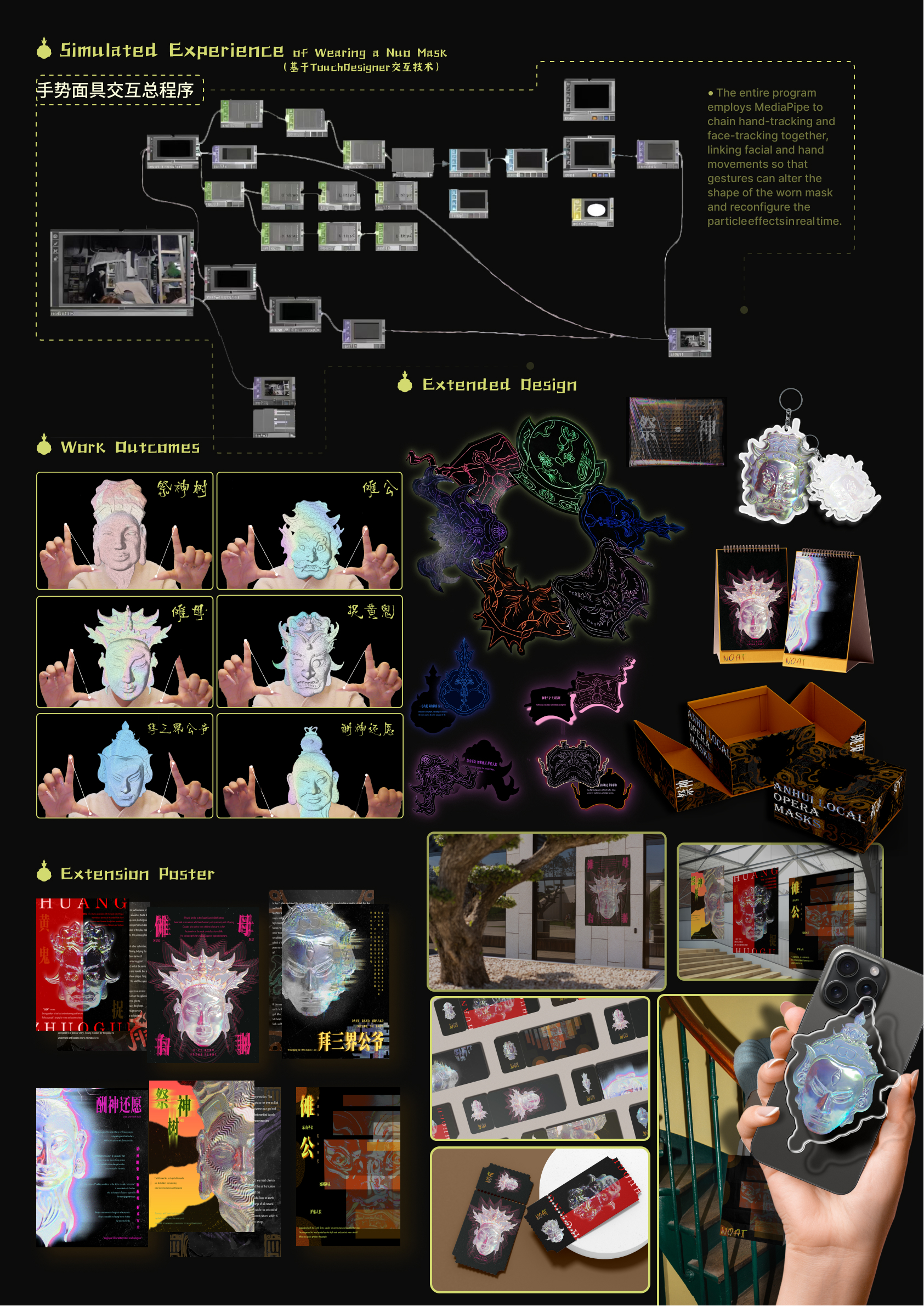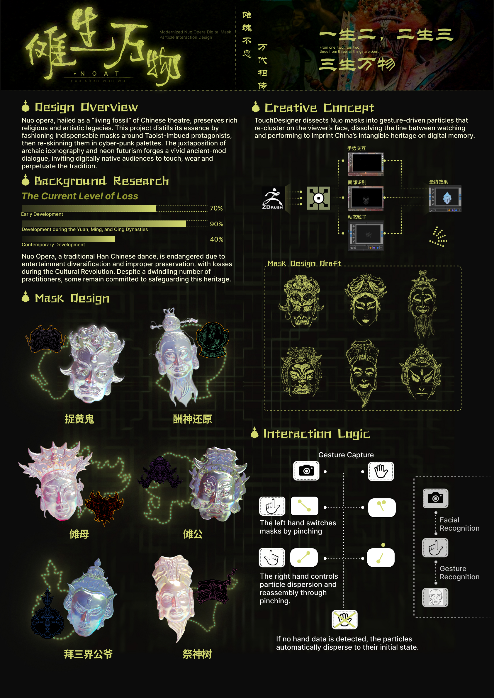 Nuo opera, hailed as a “living fossil” of Chinese theatre, preserves rich religious and artistic legacies. This project distills its essence by fashioning indispensable masks around Taoist-imbued protagonists, then re-skinning them in cyber-punk palettes. The juxtaposition of archaic iconography and neon futurism forges a vivid ancient-mod dialogue, inviting digitally native audiences to touch, wear and perpetuate the tradition.